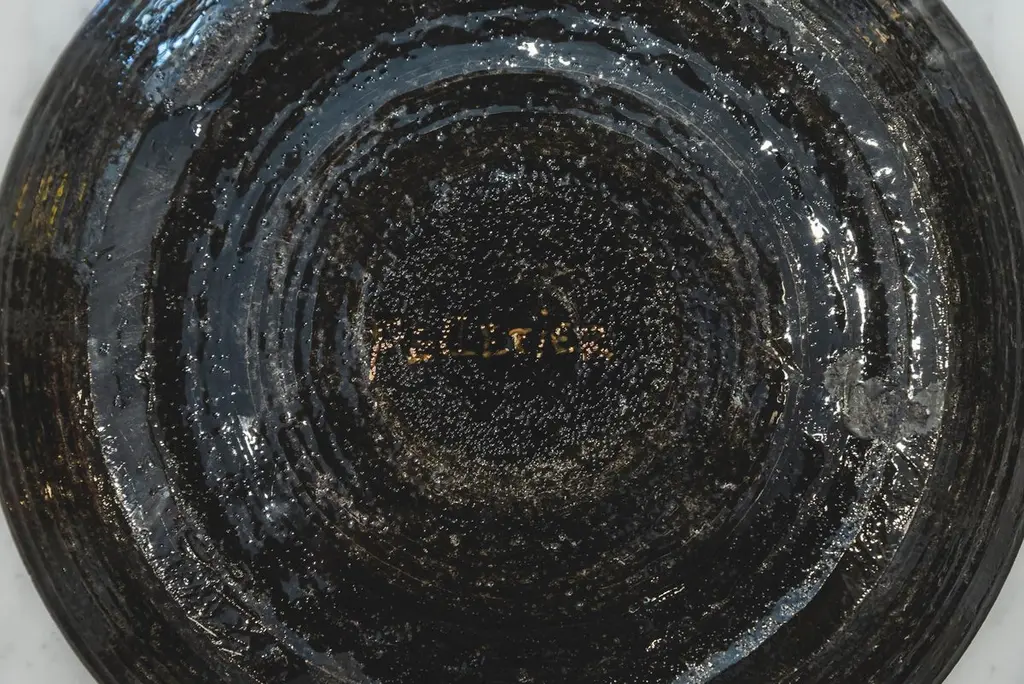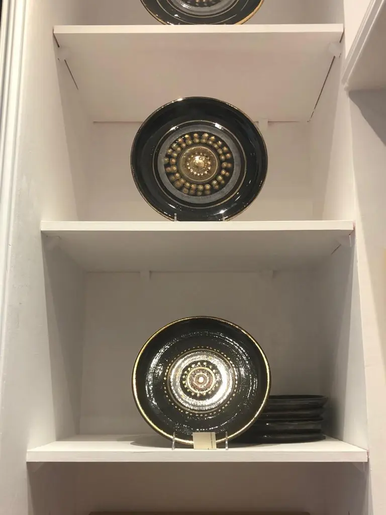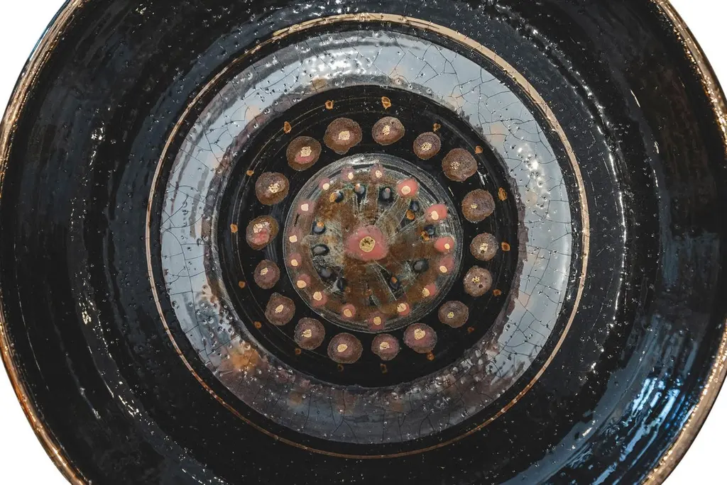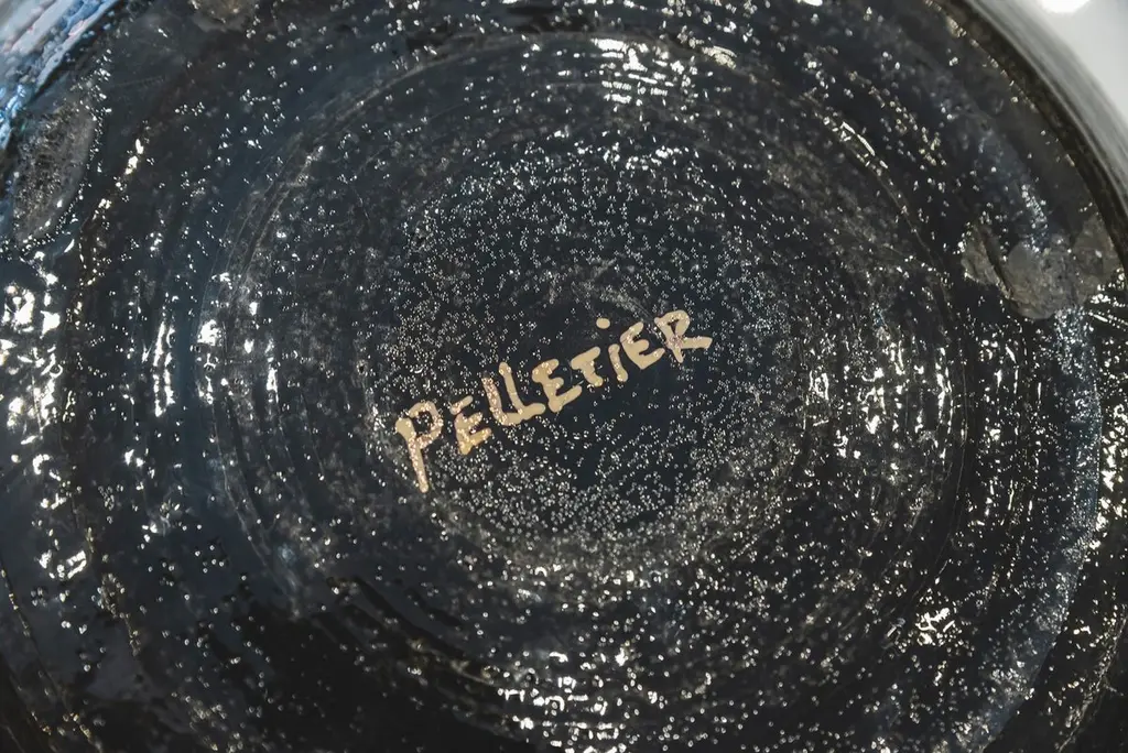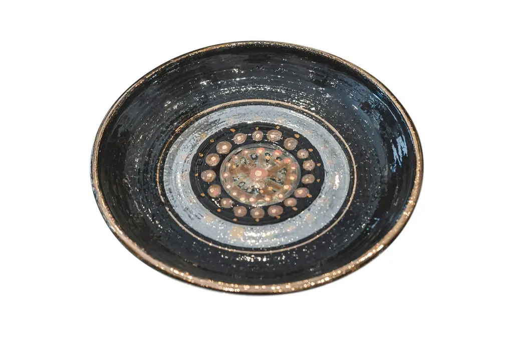 Georges Pelletier (1938), Set of four plates, Black, gold and red enamelled ceramic with solar decoration,Signed on the back,circa 1970, France.Measure: Depth. 26,8 cm Georges Pelletier is a French ceramicist and artist born October 9, 1938 in Brussels. He began his training as a ceramicist at the age of twelve at the Pioulier school in Vence, founded by Célestin Freinet. This school teaches free and modern art for its time. This training allowed him from an early age to build a unique artistic identity.In 1961 he opened his first workshop in Paris, where he created his first unique pieces. He was spotted by Maison Bobois for his talent.This is why he became the supplier of the Bobois lighting collections from 1961 to 1973. He dedicated his workshop to creating lighting for this large house and for living rooms.In 1973, he decided to leave for the south, to Cannes, where he set up a new workshop where he was still active and continued to work.