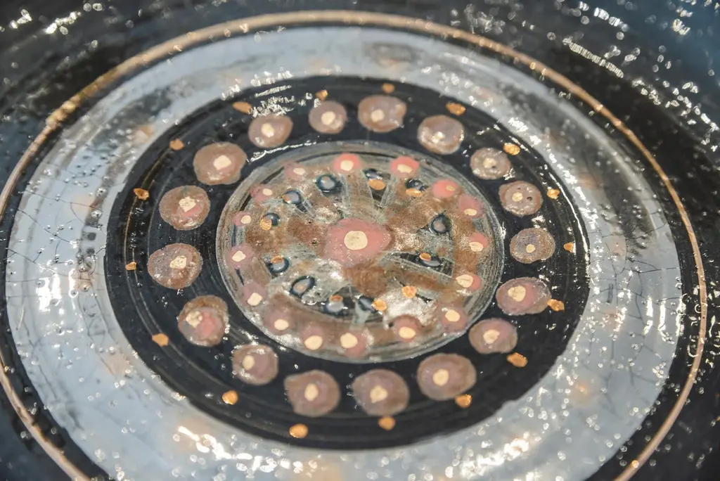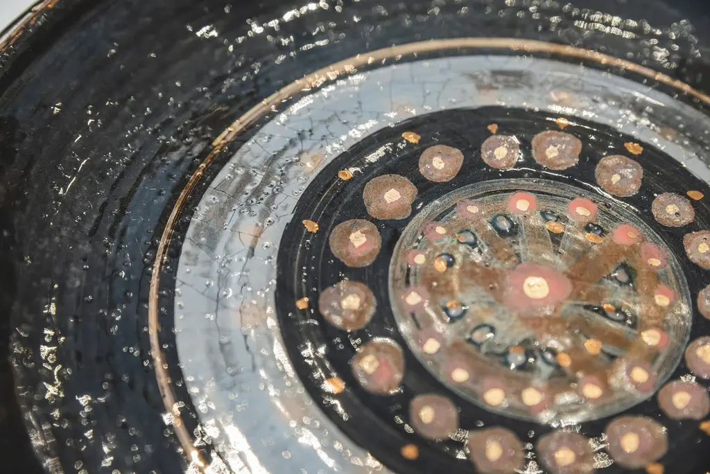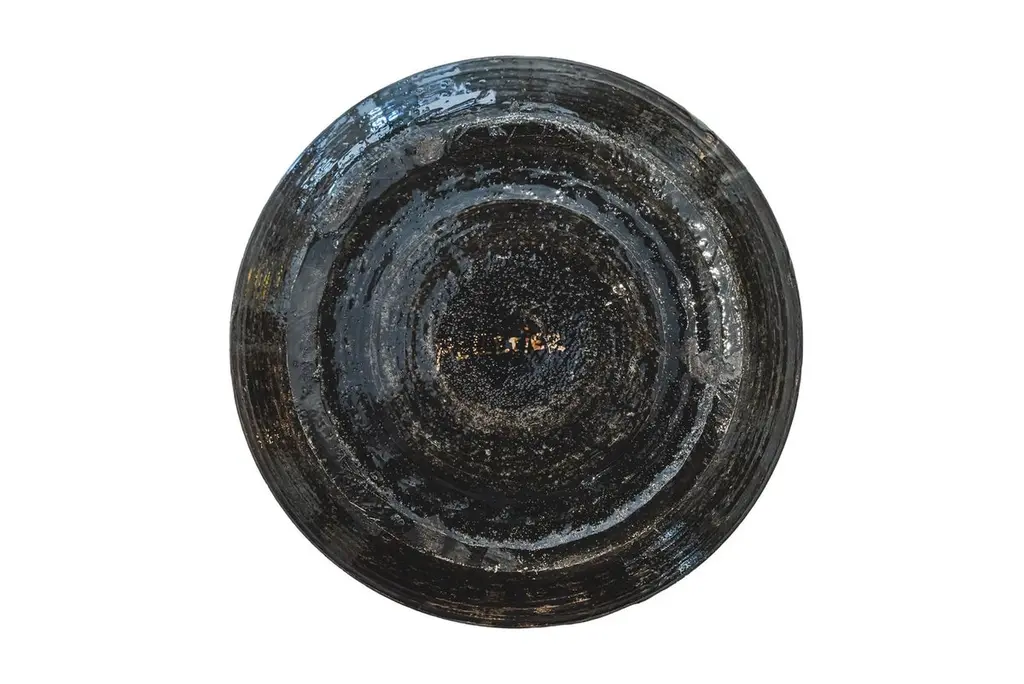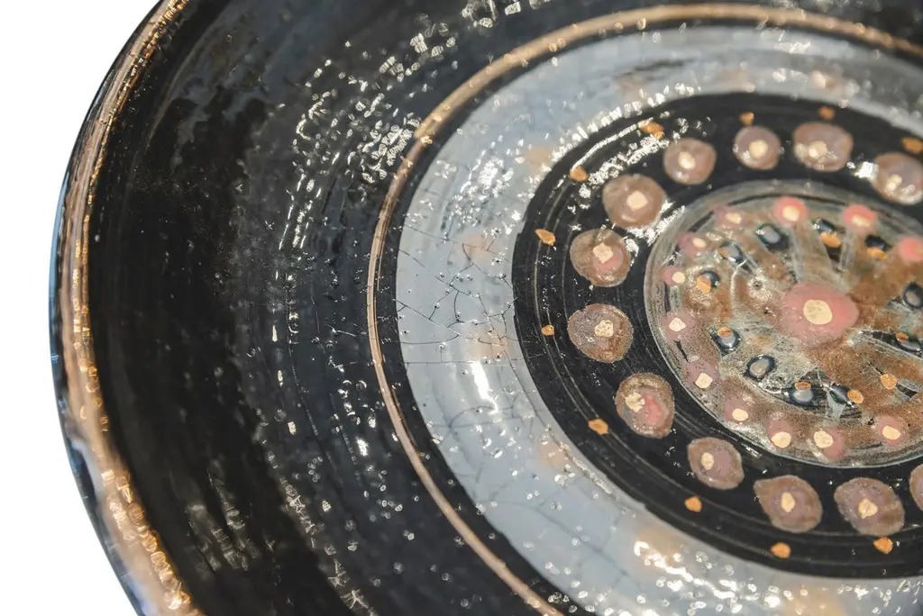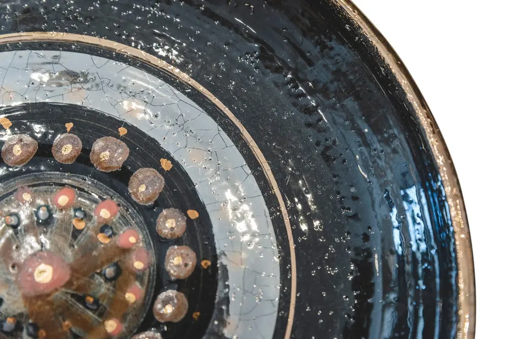 Georges Pelletier (1938), Set of four plates, Black, gold and red enamelled ceramic with solar decoration,Signed on the back,circa 1970, France.Measure: Depth. 26,8 cm Georges Pelletier is a French ceramicist and artist born October 9, 1938 in Brussels. He began his training as a ceramicist at the age of twelve at the Pioulier school in Vence, founded by Célestin Freinet. This school teaches free and modern art for its time. This training allowed him from an early age to build a unique artistic identity.In 1961 he opened his first workshop in Paris, where he created his first unique pieces. He was spotted by Maison Bobois for his talent.This is why he became the supplier of the Bobois lighting collections from 1961 to 1973. He dedicated his workshop to creating lighting for this large house and for living rooms.In 1973, he decided to leave for the south, to Cannes, where he set up a new workshop where he was still active and continued to work.