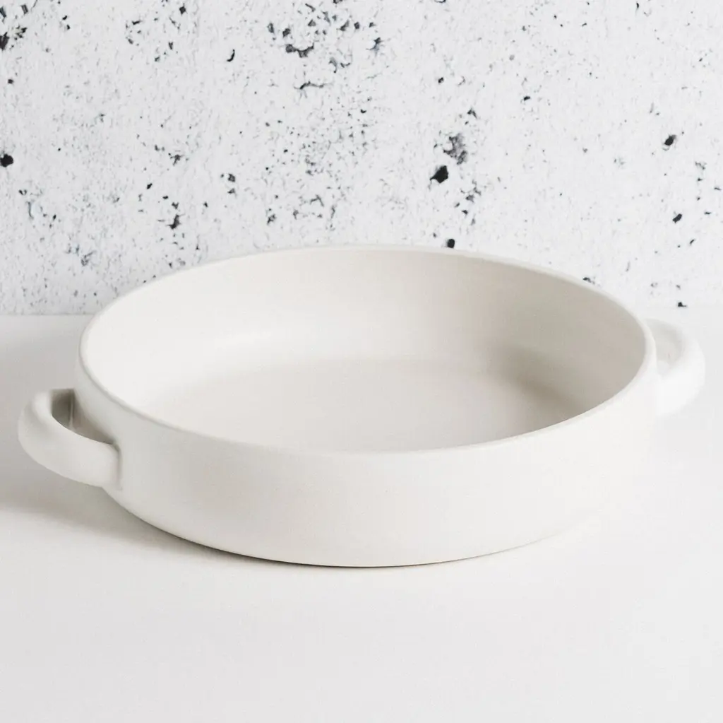 From a Paella course to a roasted chicken to a plate of fruits, the 13.4" Stoneware Serving Plate with Handles is one of the best ways to serve your main course on the table. This hand-crafted gorgeous plate is a centerpiece to present on your table. The masterpiece that will gather all your family and guests around the table. Sourced from the Cap Bon peninsula in Tunisia, Gharyan Stoneware starts its life as pure, mineral-rich clay fed by the azure depths of the Mediterranean Sea. As an area steeped in the deeply ancient tradition of pottery, expert craftsmen have lived for generations among the citrus, roses, vines and jasmines in the gardens of Cap Bon, passing down thousands of years of pure artistry, hand-to-hand, to the artisans that continue to create our stoneware pieces today. At Gharyan, they believe in sustainability and fair trade and only work with partners that share these values. All products are made in Tunisia where it's guaranteed that workers benefit from every right: social insurance, 8 hours work/day, 5 days/week, enrolment with the Tunisian National Labour Union, safe working conditions, no child labour, and no labour exploitation.