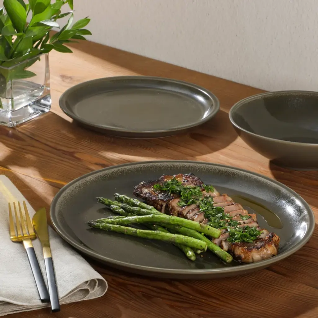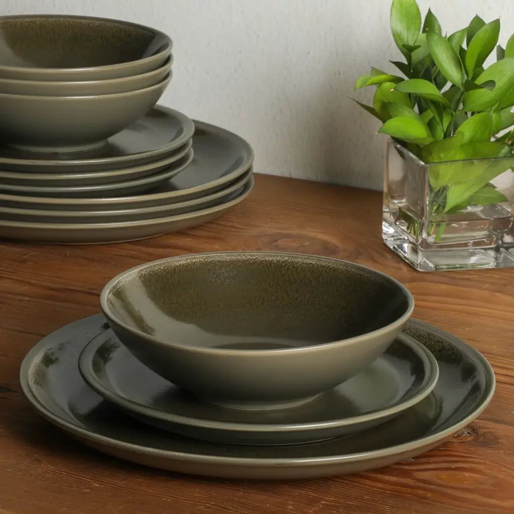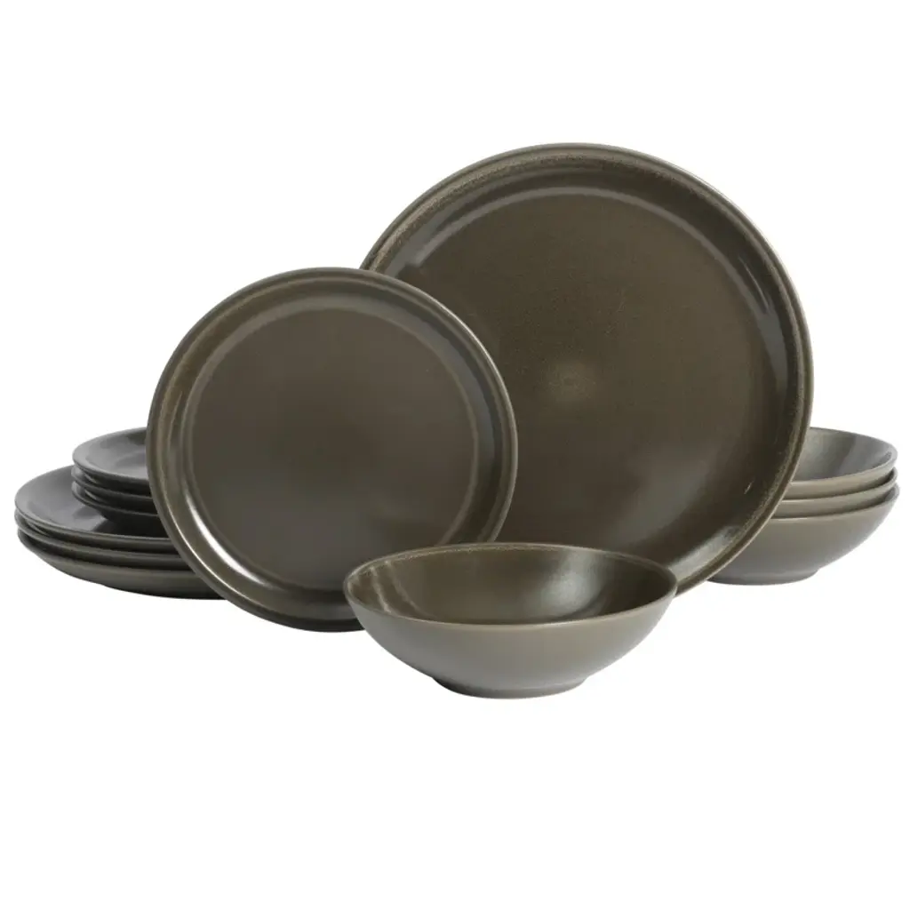 Gibson Elite 12 Piece (Service For 4) Lakecrest Plates And Bowls Reactive Glaze Round Dishes Stoneware Ceramic Dinnerware Set - Dark Green
