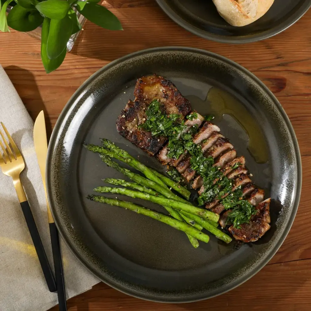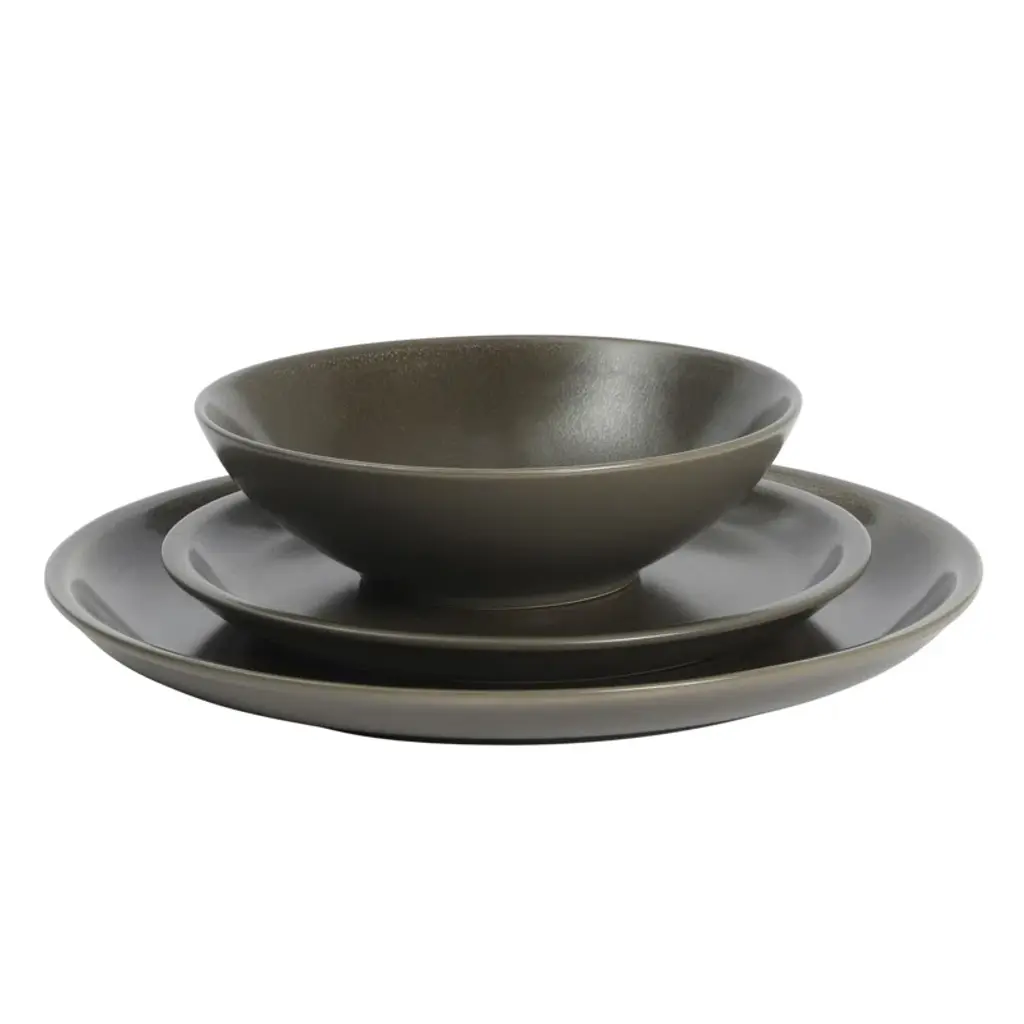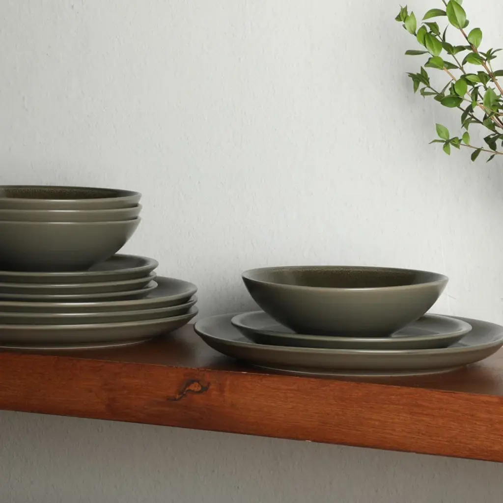 Gibson Elite 12 Piece (Service For 4) Lakecrest Plates And Bowls Reactive Glaze Round Dishes Stoneware Ceramic Dinnerware Set - Dark Green