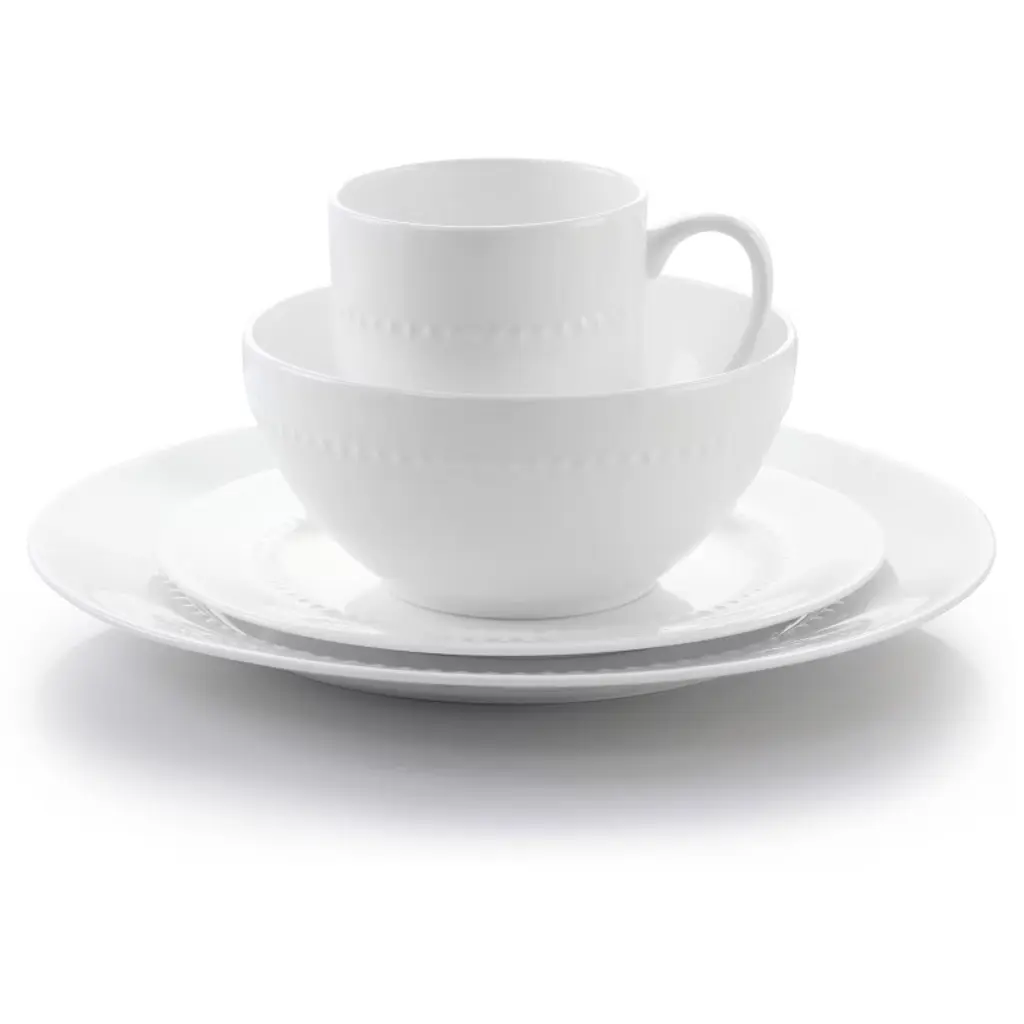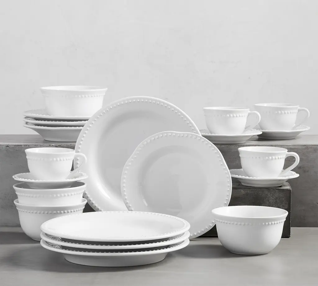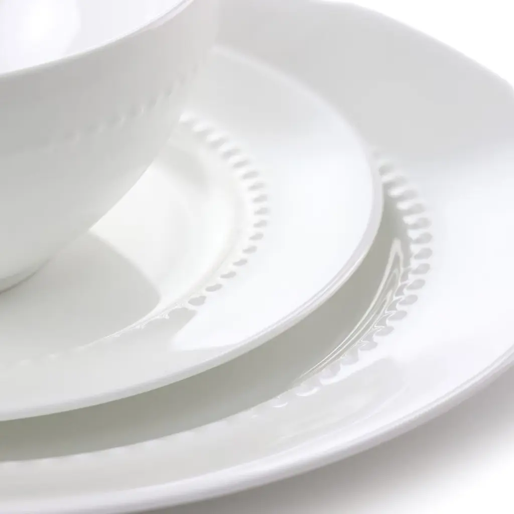 The Gibson Elite 16 Piece Embossed Bone China Dinnerware Set brings class to daily dinning. The white bone china body features a dotted embossed ring that encircles each piece. The special material is durably made and lightweight for easier use. Enjoy more time with guest and never worry about cleaning, the set it dishwasher safe and microwave safe. Beautify everyday meals be it for breakfast, lunch or dinner.