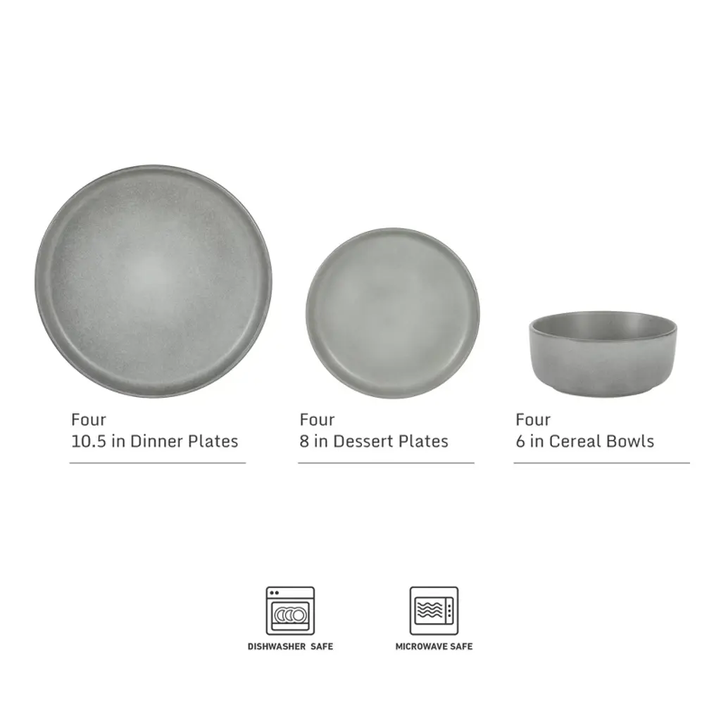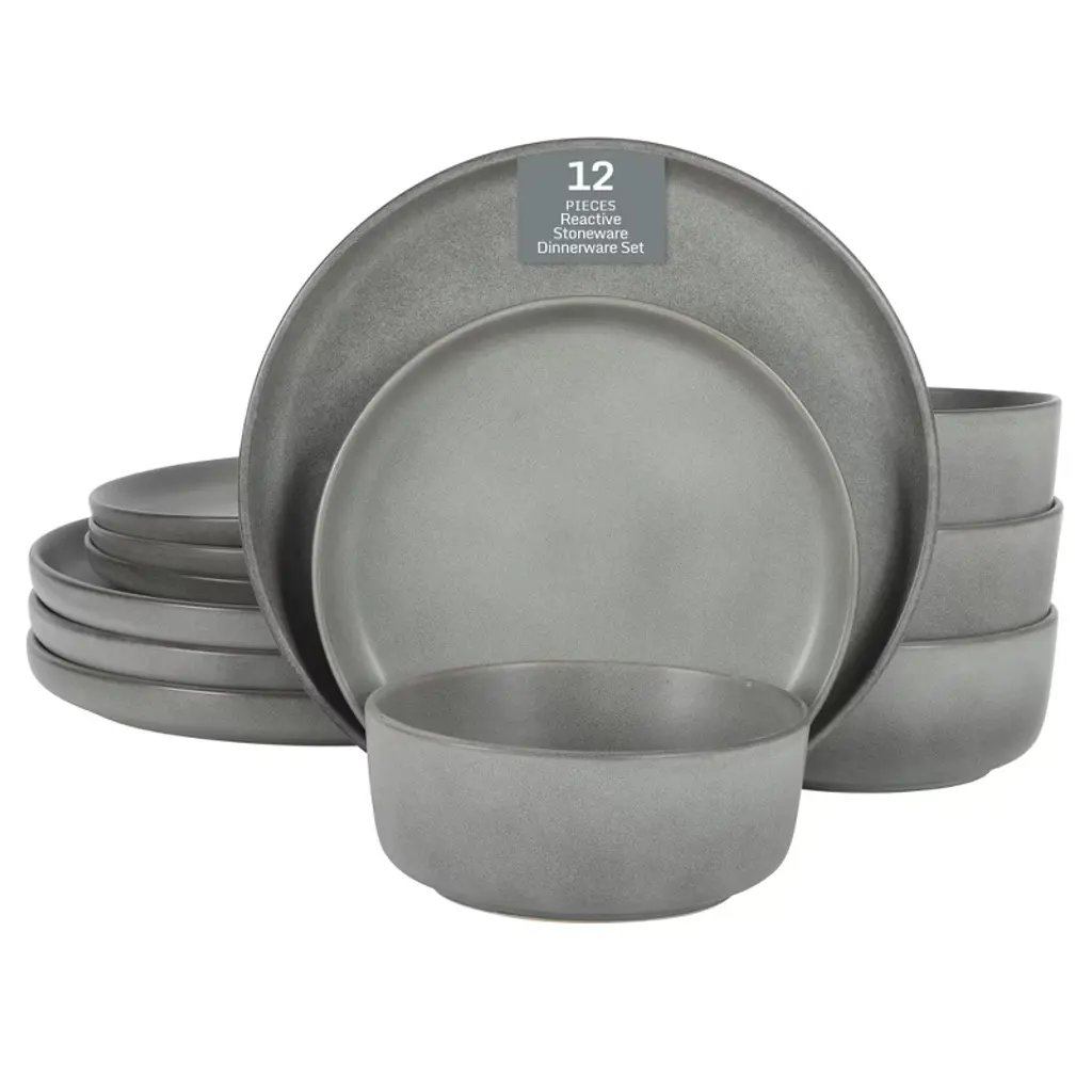 Gibson Elite Pasco 12 Piece (Service For 4) Plates And Bowls Reactive Glaze Dishes Stoneware Ceramic Dinnerware Set - Gray