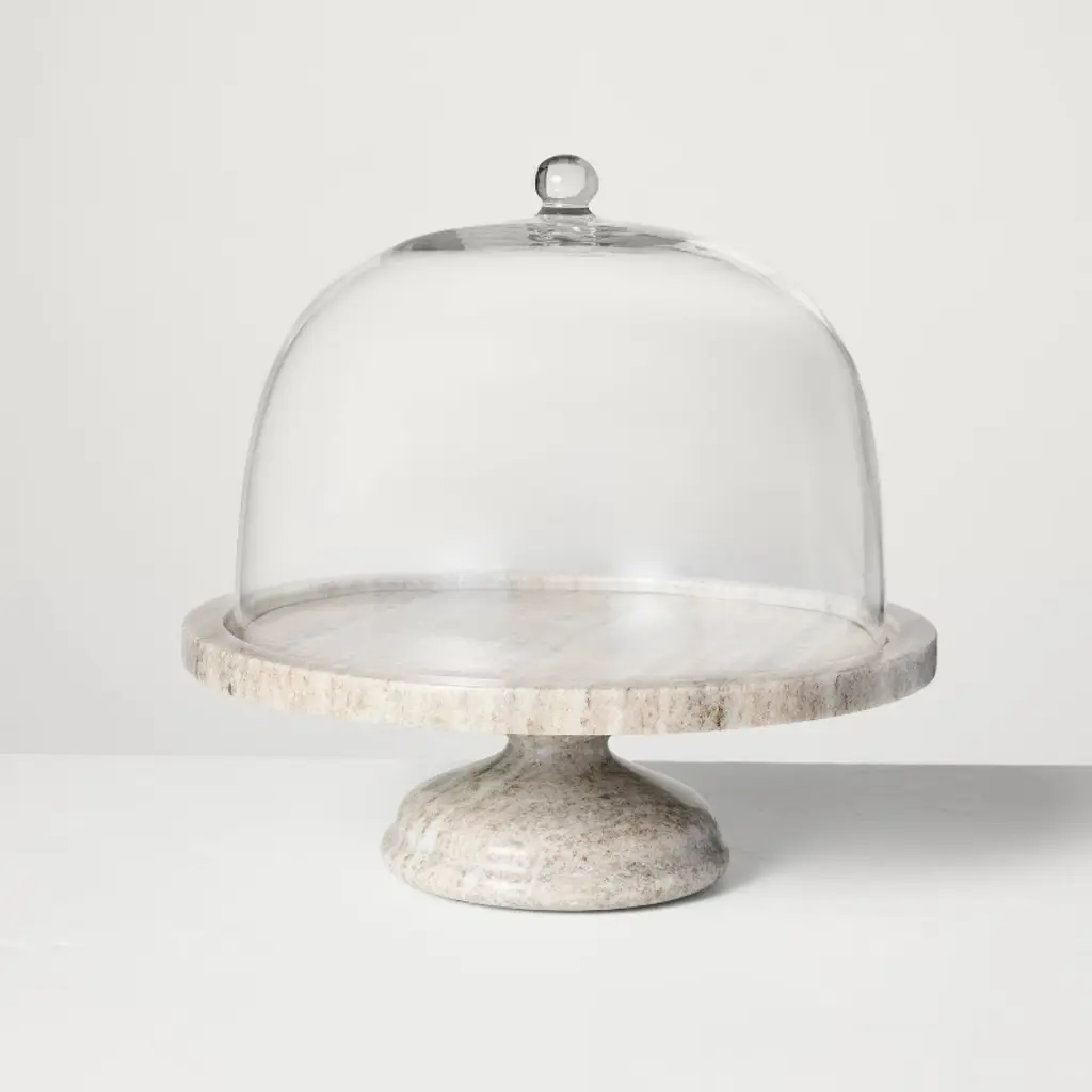 "Whether you're hosting a dinner party or an all-dessert-themed girls' night, a stunning cake makes any celebratory occasion extra special. The Ridgehaven 10-inch Marble Cake Stand with Glass Cloche creates a dedicated space on any table for your cake. Combining the timeless beauty of marble and wood, this serving stand presents an Instagram-worthy display of cakes, cookies, pastries, and other treats worthy of indulgence. The footed wood base provides a stable lift on any table or countertop, while the dome-shaped glass lid keeps unwanted hands and elements away from your delicious creations. Hand wash only. Wipe dry with a soft, damp cloth. Quintessentially sophisticated and thoughtfully versatile, Gibson Elite offers a tasteful blend of form and function brought to a myriad of dinnerware, serving ware, and tabletop accessories. Quality in material selection and stylish aesthetics in designs and glazing techniques provide endless possibilities for creative tablescapes and dining occasions. "