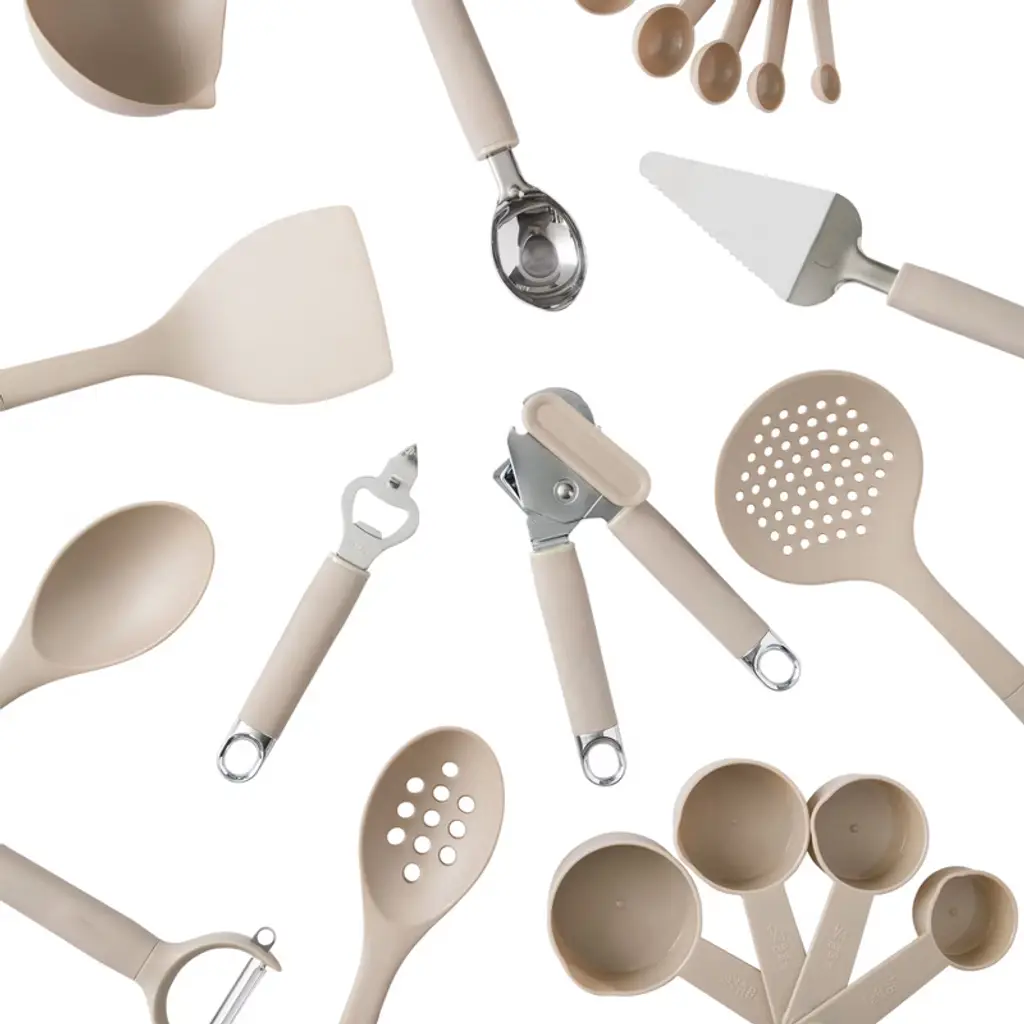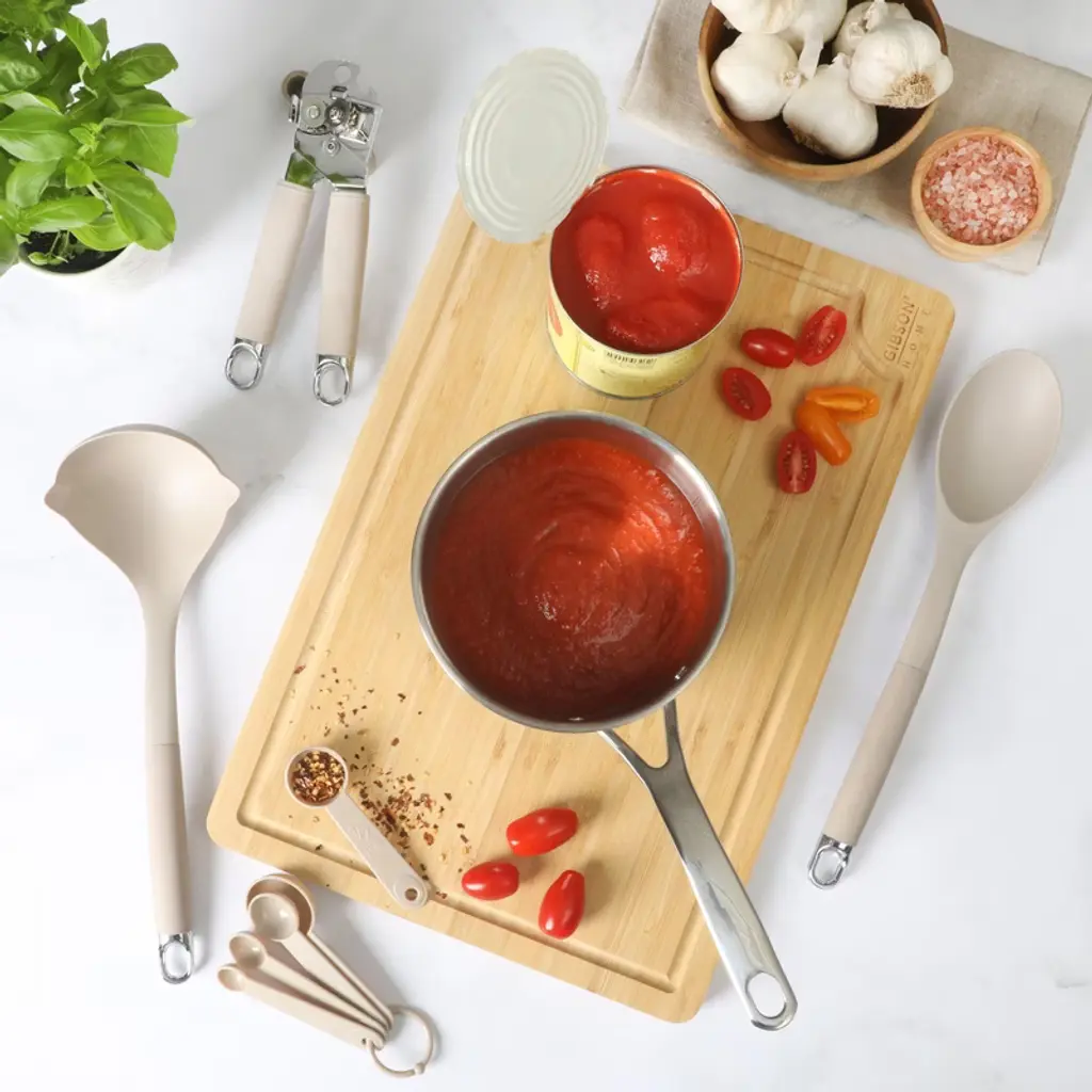 "Discover a kitchenware set that truly has it all—durability, efficiency and practical versatility. The Burchette 20-piece collection of essential kitchen tools and gadgets aims to make meal prep effortless, whether you're whipping up dinner on a busy weeknight or a hearty breakfasty on a slow Sunday morning. Nylon utensils are your cookware's best ally, keeping nonstick and enameled surfaces safe from scratches while letting you cook with confidence and ease. The stainless steel gadgets offer precision as you mix and measure ingredients for any recipe. With this complete set from Gibson Home, every dish becomes a joy to create and every moment in the kitchen feels inspiring and enjoyable. Hand wash recommended. Make every home a Gibson Home. A multi-category collection of kitchen and dining essentials, Gibson Home offers style and value for everyday living. Enjoy preparing, cooking, and serving delicious meals in a wide selection of dinnerware, cookware, bakeware, cutlery, glassware, and more. Designed with function, reliability, and versatility, Gibson Home provides dining and entertaining staple to make every mealtime or gathering a culinary success." Discover a kitchenware set that truly has it all—durability, efficiency and practical versatility. The Burchette 20-piece collection of essential kitchen tools and gadgets aims to make meal prep effortless, whether you're whipping up dinner on a busy weeknight or a hearty breakfasty on a slow Sunday morning. Nylon utensils are your cookware's best ally, keeping nonstick and enameled surfaces safe from scratches while letting you cook with confidence and ease. The stainless steel gadgets offer precision as you mix and measure ingredients for any recipe. With this complete set from Gibson Home, every dish becomes a joy to create and every moment in the kitchen feels inspiring and enjoyable. Hand wash recommended.Make every home a Gibson Home. A multi-category collection of kitchen and dining essentials, Gibson Home offers style and value for everyday living. Enjoy preparing, cooking, and serving delicious meals in a wide selection of dinnerware, cookware, bakeware, cutlery, glassware, and more. Designed with function, reliability, and versatility, Gibson Home provides dining and entertaining staple to make every mealtime or gathering a culinary success. A COMPLETE SET INCLUDES: A nylon turner, nylon spoon, slotted nylon spoon, nylon skimmer, nylon ladle, can opener, peeler, ice cream scoop, bottle opener, cake server, 5-piece measuring cup set and 5-piece measuring spoon set.COMPLETE COOKING ESSENTIALS: Twenty tools and gadgets are ideal fore everyday cooking. Whether preparing weeknight dinners or weekend breakfasts, this set has the tools to help you handle any recipe with confidence.NONSTICK-FRIENDLY: Nylon cooking tools are perfect to use on classic and ceramic nonstick pans, enameled Dutch ovens, stainless steel skillets and carbon steel bakeware. Their durable construction withstands daily use and are simple to wash after every use.HANDY KITCHEN GADGETS: Made from stainless steel, the kitchen gadgets are designed for specific tasks - from mixing to measuring - making meal prep efficient, accurate and enjoyable.CARE INSTRUCTIONS: Hand wash recommended