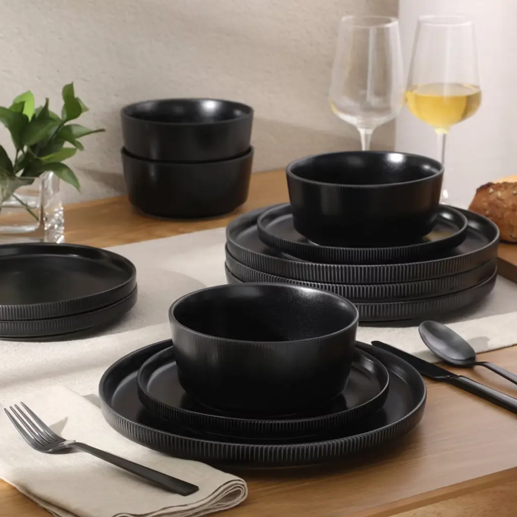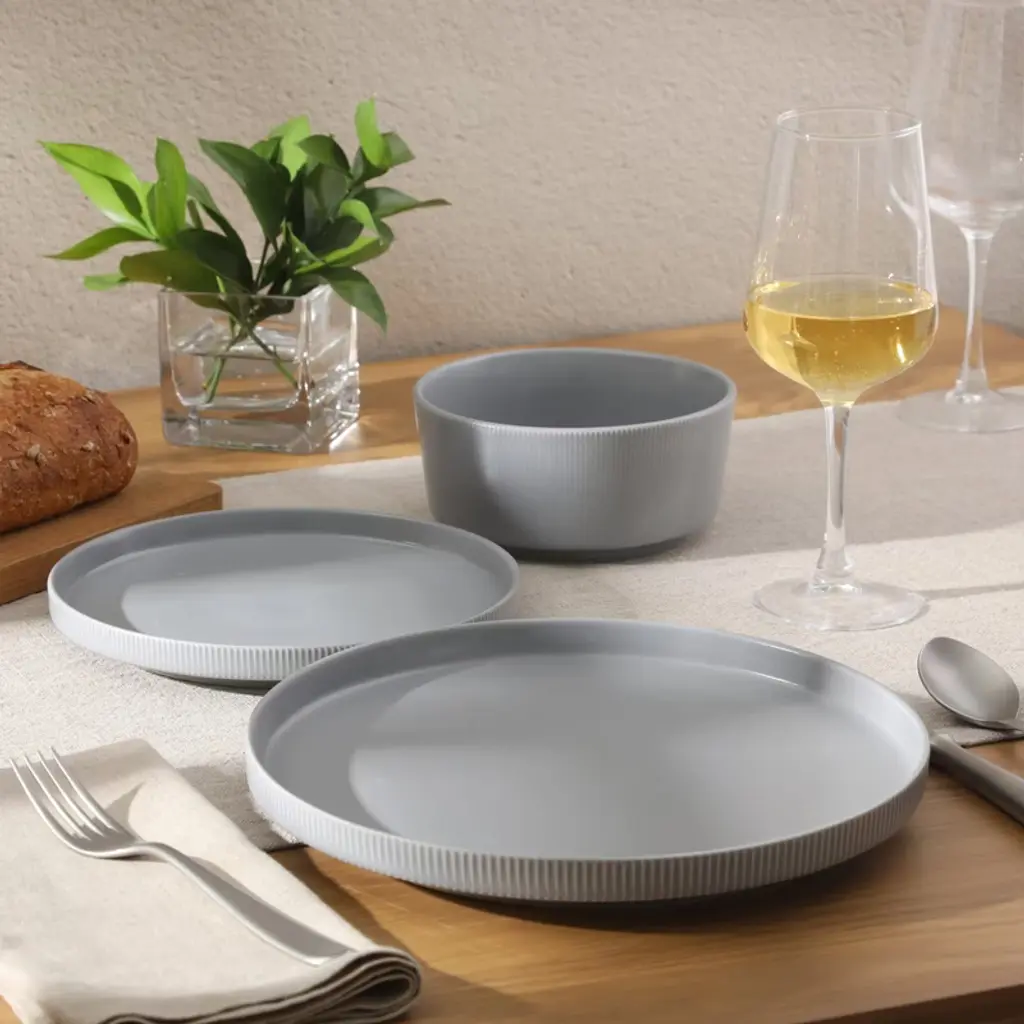 "Embrace today’s plating trends with modern dinnerware designed to inspire creativity at every meal. The Dempsey Road Dinnerware Set by Gibson Home features contemporary, restaurant-style silhouettes that are both stylish and functional. These flat, recognizable shapes offer a spacious surface that enhances the presentation of every dish. A soft matte finish and subtle ribbed detailing add just the right amount of texture and elegance. The result is a refined yet approachable collection that brings a professional, well-composed look to any tablescape. Share the joy of entertaining with family and friends by gifting them this timeless dinnerware collection for weddings, housewarmings, birthdays, holidays, and more. Dishwasher and microwave safe. Make every home a Gibson Home. A multi-category collection of kitchen and dining essentials, Gibson Home offers style and value for everyday living. Enjoy preparing, cooking, and serving delicious meals in a wide selection of dinnerware, cookware, bakeware, cutlery, glassware, and more. Designed with function, reliability, and versatility, Gibson Home provides dining and entertaining staple to make every mealtime or gathering a culinary success." Embrace today’s plating trends with modern dinnerware designed to inspire creativity at every meal. The Dempsey Road Dinnerware Set by Gibson Home features contemporary, restaurant-style silhouettes that are both stylish and functional. These flat, recognizable shapes offer a spacious surface that enhances the presentation of every dish. A soft matte finish and subtle ribbed detailing add just the right amount of texture and elegance. The result is a refined yet approachable collection that brings a professional, well-composed look to any tablescape.Share the joy of entertaining with family and friends by gifting them this timeless dinnerware collection for weddings, housewarmings, birthdays, holidays, and more. Dishwasher and microwave safe. Make every home a Gibson Home. A multi-category collection of kitchen and dining essentials, Gibson Home offers style and value for everyday living. Enjoy preparing, cooking, and serving delicious meals in a wide selection of dinnerware, cookware, bakeware, cutlery, glassware, and more. Designed with function, reliability, and versatility, Gibson Home provides dining and entertaining staple to make every mealtime or gathering a culinary success. FOUR PLACE SETTINGS: This complete dinnerware set includes four 10.5-inch dinner plates, four 8-inch dessert plates and four 6-inch cereal bowls. Suitable for a service for four to serve small breakfasts, quick lunches or gourmet dinners all year round.EASY-TO-CLEAN DINNERWARE: Made from durable stoneware, these plates and bowls are elevated dining essentials that are best in versatility and effortless cleanup. Fired at high temperature for a wear-resistant and non-porous construction, these heavy stoneware pieces provide a sturdy look and feel for everyday use.MODERN SILHOUETTES: Flat construction framed by subtle, raised trims offers both stackable storage and a sleek stage for a more inspired plating style. The matte finish adds a refined touch to relaxed meals and casual gatherings.GIFTING WITH STYLE: Add this collection to your gift registry or gift it to family, friends, newlyweds and first-time homeowners to celebrate birthdays, weddings, special occasions or everyday milestones.CARE INSTRUCTIONS: Dishwasher and microwave safe