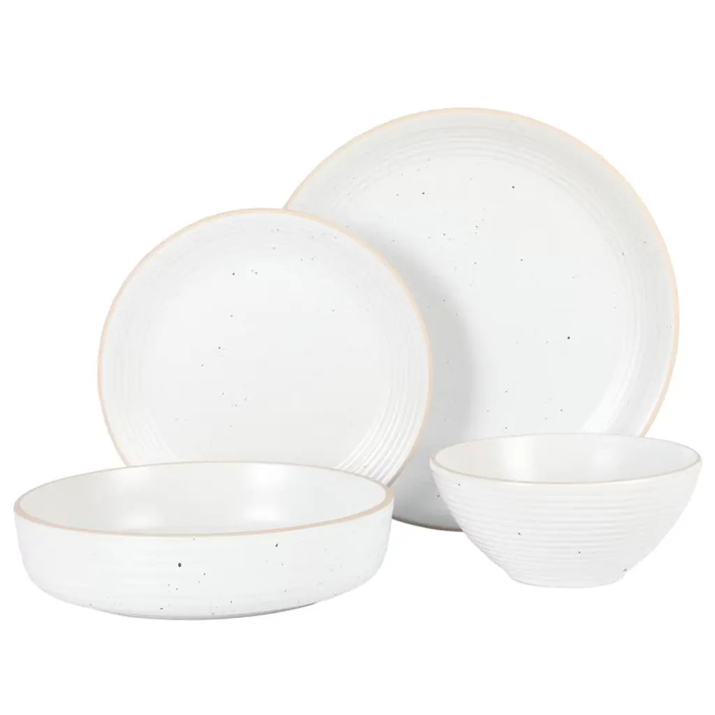The Gibson Home Dinah 16-piece Stoneware Dinnerware Set is a collection of plates and bowls crafted for stylish table settings and enjoyable dining occasions. This dinnerware set features a sturdy stoneware construction to offer everyday strength and durability. As long-lasting as it is versatile, each plate and bowl has an embossed and speckled design to add depth to any plating style. This set offers four dinner bowls to offer versatility from their unique design. They feature a spacious base to serve meat and vegetables, while the low, curved sides allow them to serve up soupy meals or anything with sauces such as pastas, stews, rice bowls, and more. Layer these versatile pieces with a set of mirror-polished flatware or a few pieces of serving bowls and platters in vibrant colors to complete a welcoming table spread. Share the joy of entertaining with family and friends by gifting them this timeless dinnerware collection for weddings, housewarmings, birthdays, holidays, and more. Dishwasher and microwave safe.Make every home a Gibson Home. A multi-category collection of kitchen and dining essentials, Gibson Home offers style and value for everyday living. Enjoy preparing, cooking, and serving delicious meals in a wide selection of dinnerware, cookware, bakeware, cutlery, glassware, and more. Designed with function, reliability, and versatility, Gibson Home provides dining and entertaining staples to make every mealtime or gathering a culinary success.