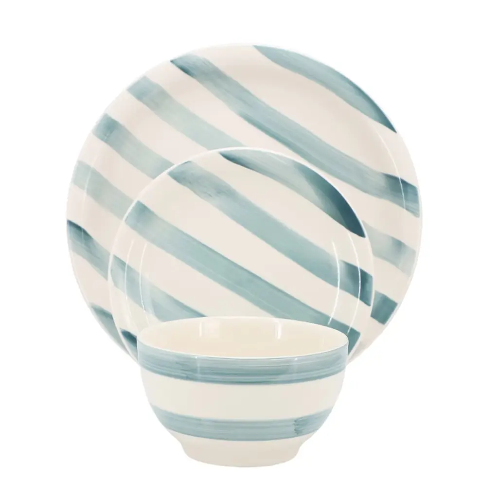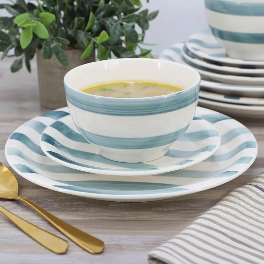 The Gibson Home Kenwood Shores 12 Piece Stoneware Dinnerware Set brings a blend of artisanal charm and everyday functionality to your dining table. Crafted from durable stoneware with a glossy finish, this set features a handpainted stripe pattern that adds a touch of rustic elegance to any meal. Designed for service for four, it includes four 10.5-inch dinner plates, four 7.5-inch dessert plates, and four 5.5-inch cereal bowls, making it perfect for casual family dinners or entertaining guests. The round shape and carefully crafted design create a cohesive and inviting table setting. Practical as well as stylish, this dinnerware set is both microwave and dishwasher safe, ensuring easy heating and effortless cleanup. The high-quality stoneware construction offers long-lasting durability, while the handpainted details provide a unique and artistic appeal. Whether you're serving a hearty breakfast, a light lunch, or a formal dinner, the Gibson Home Kenwood Shores set enhances every dining experience with its balance of beauty and convenience.