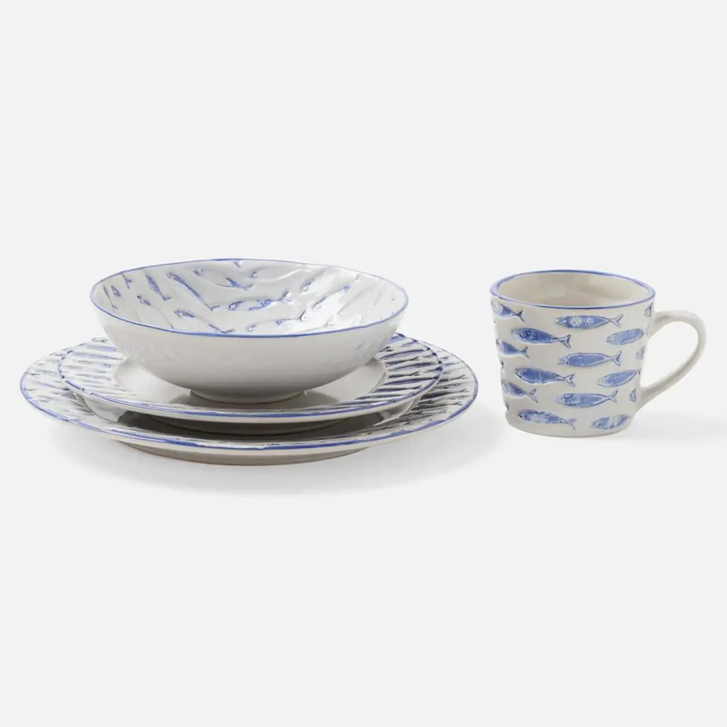 Gideon Coastal White Stoneware Blue Fish Mug - Set Of 4