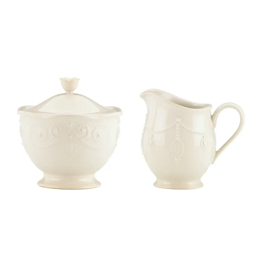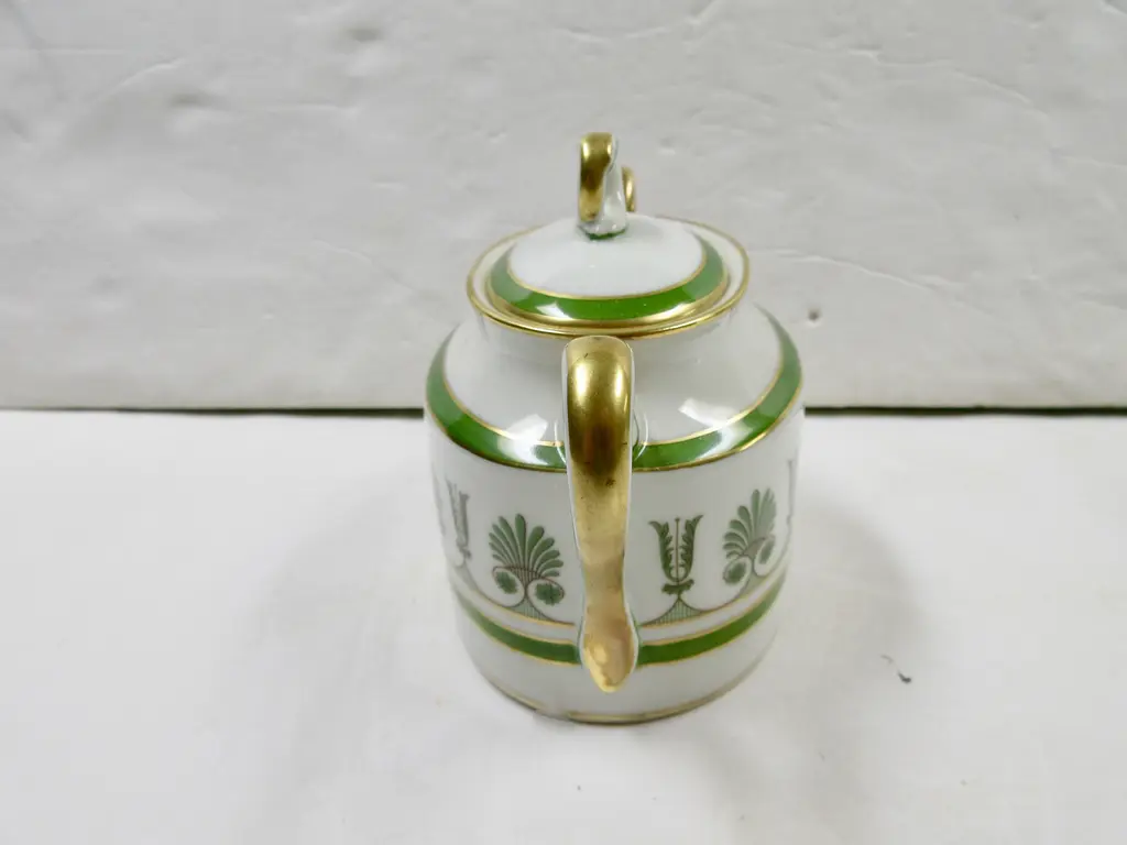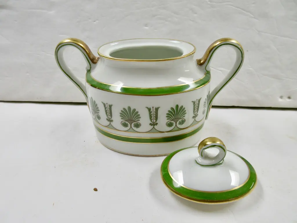 Richard Ginori Italian gilt porcelain lidded sugar bowl and creamer with an alluring green acanthus design, green bands, gold pinstripe detail, and gilt handles, borders and rims. Note repaired creamer spout (pictured). Marked "Richard Ginori Italy" with the company's crown mark. Sugar bowl, 5.5"L x 3"W x 4"H; creamer, 3.75"L x 2"W x 4.12"H.