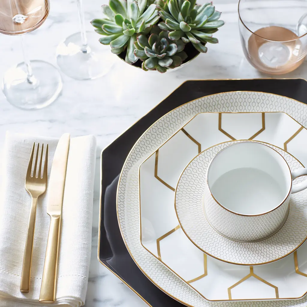 Epitomizing the fusion of craftsmanship and design, Wedgwood's Geo Gold collection makes a warm yet modern statement with crisp, geometric patterns and texture-rich ceramics.