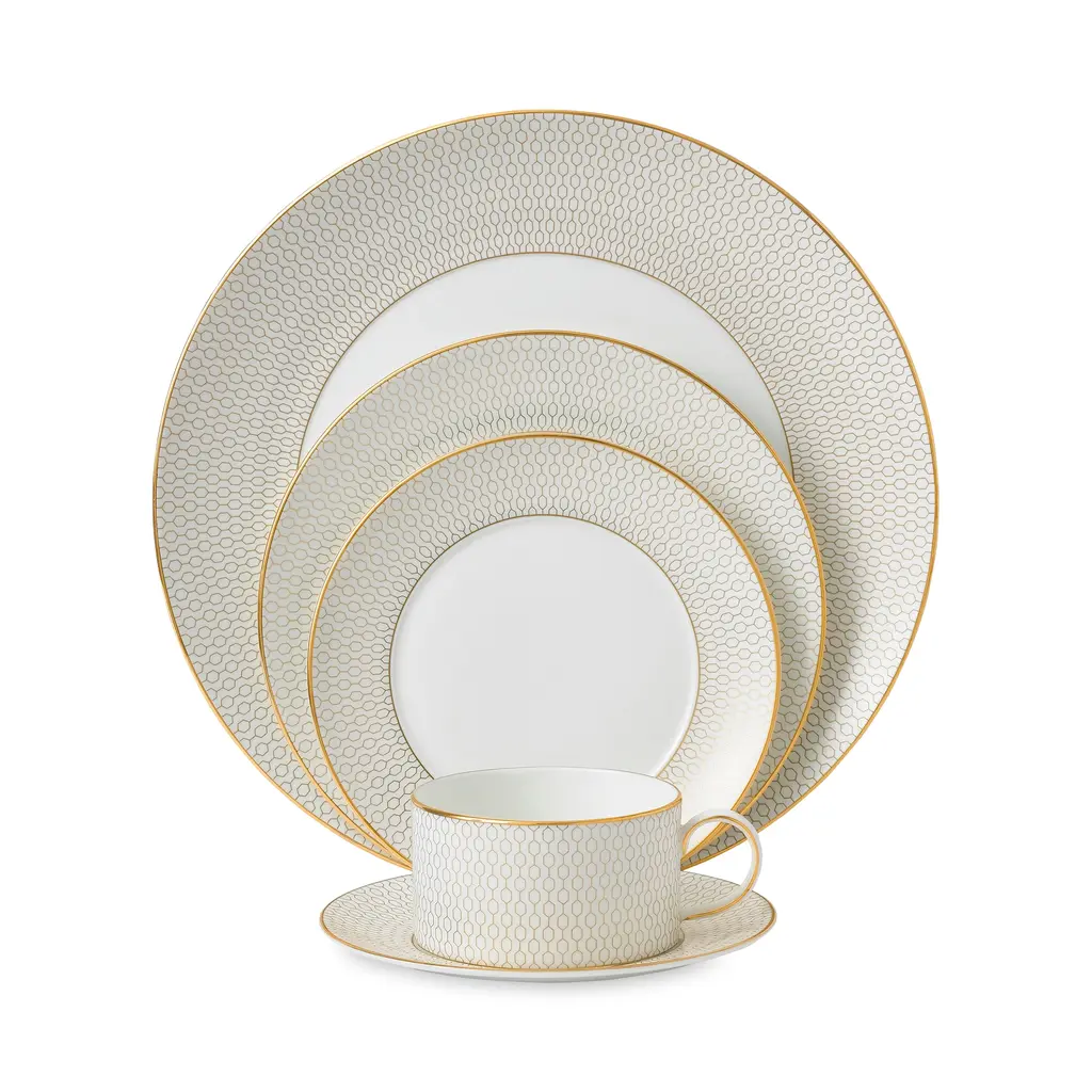 Epitomizing the fusion of craftsmanship and design, Wedgwood's Geo Gold collection makes a warm yet modern statement with crisp, geometric patterns and texture-rich ceramics.