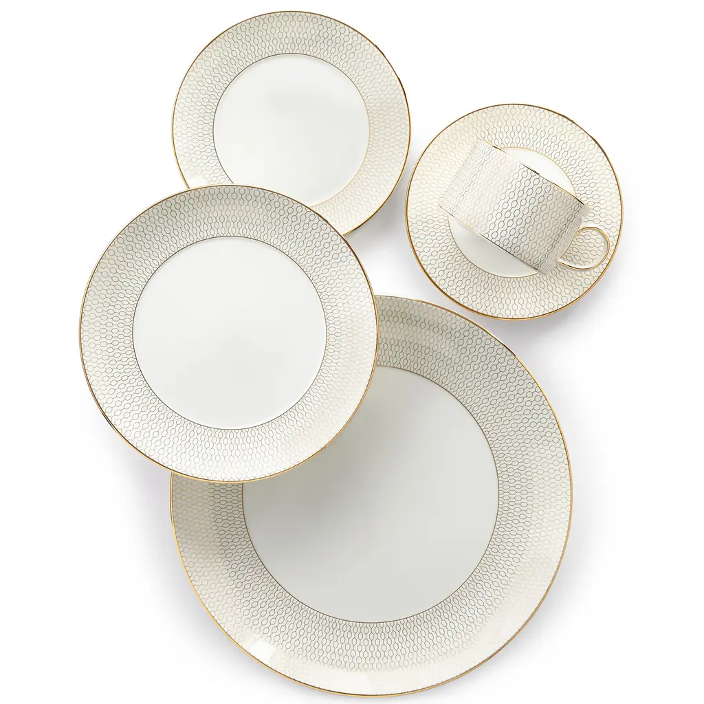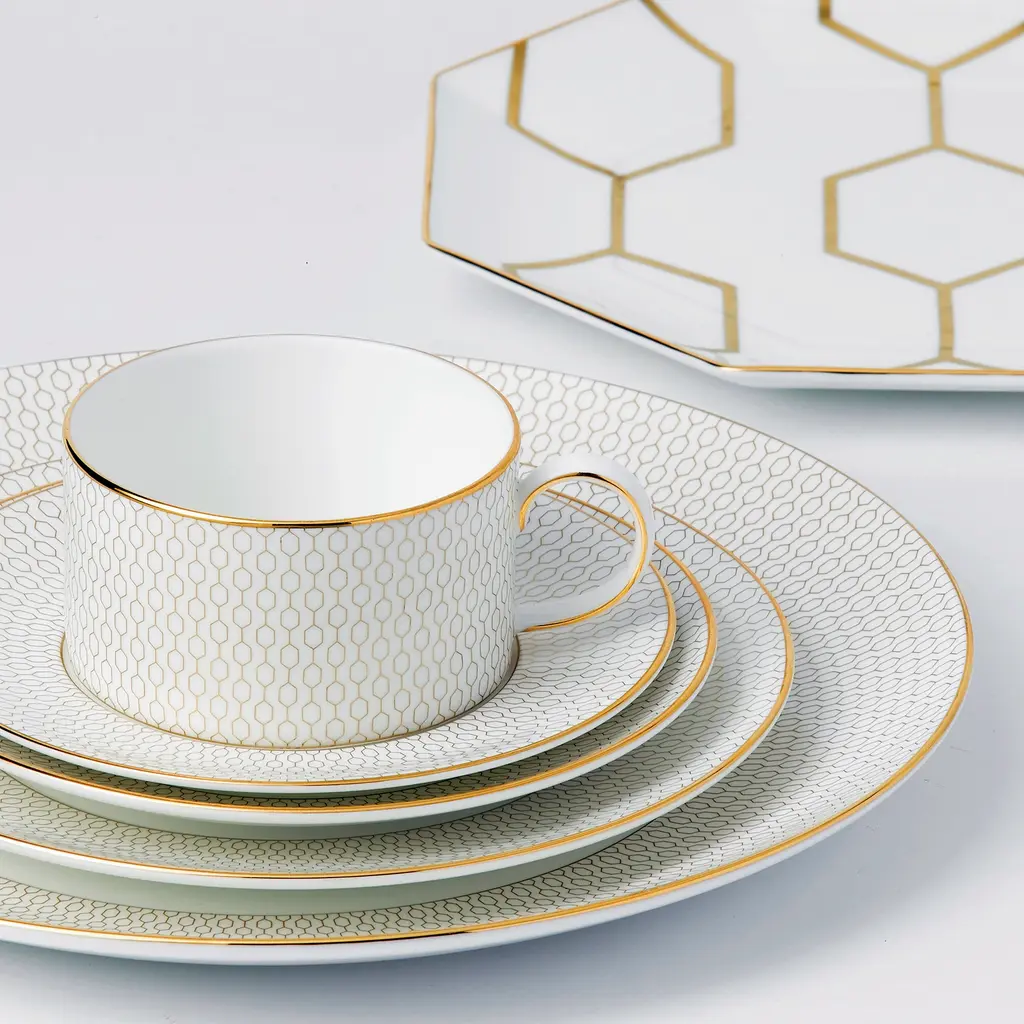 Epitomizing the fusion of craftsmanship and design, Wedgwood's Geo Gold collection makes a warm yet modern statement with crisp, geometric patterns and texture-rich ceramics.