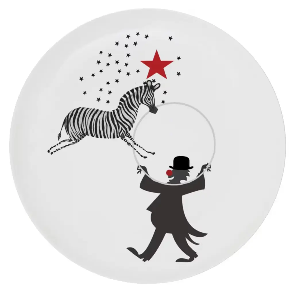 Six dwarves radially arranged at the feet of a juggler describe the playful motif decorating each of the six dessert plates composing this luminous ceramic set. Enlivened by bright-red accents, the motif echoes the Christmas spirit and makes for an artful solution for serving cookies or cake during a tea or coffee break.