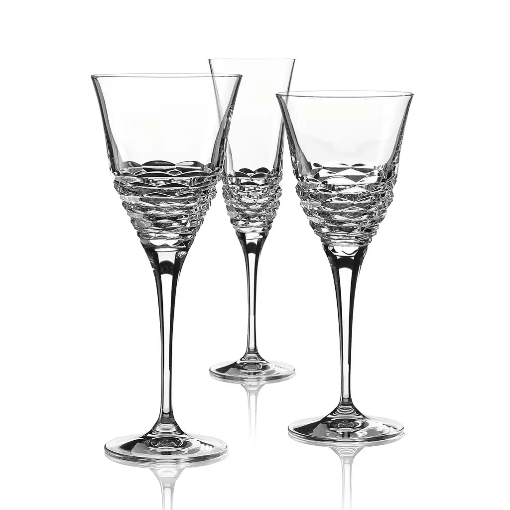 With a stunning design that will not go unnoticed, this set of six stem glasses will add a striking accent to a modern and elegant home on any occasion. Each piece, crafted of transparent glass, features a long stem supporting a conical bowl adorned with a distinct textured bottom.