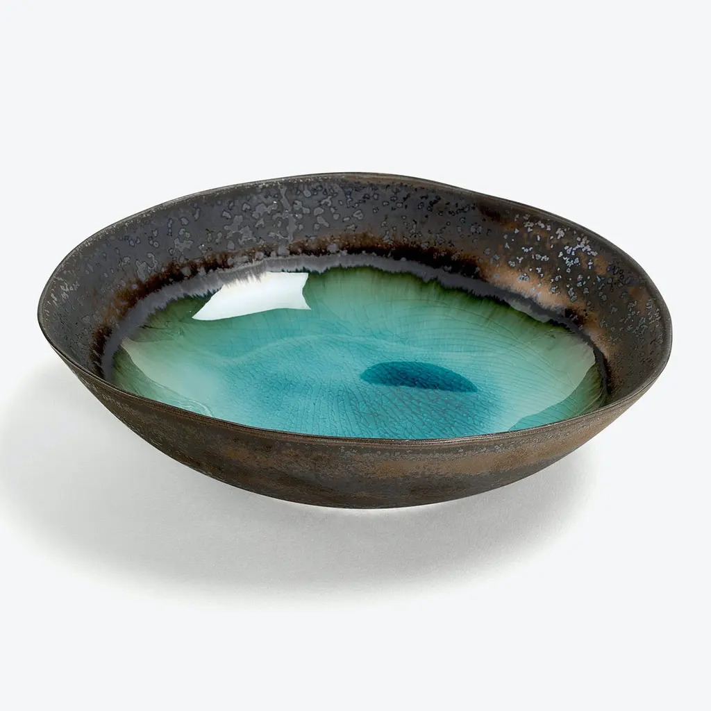 Fusing Eastern and Western styles, philosophies, and techniques, stoneware ceramics are crafted in Thailand. Cool tones brilliantly crackle in a marine habitat - a play of shadows, light, and texture. Each piece features one-of-a-kind crystalized designs inspired by pools of water.