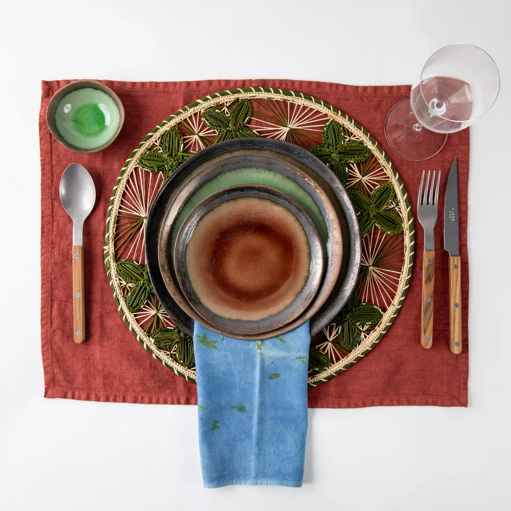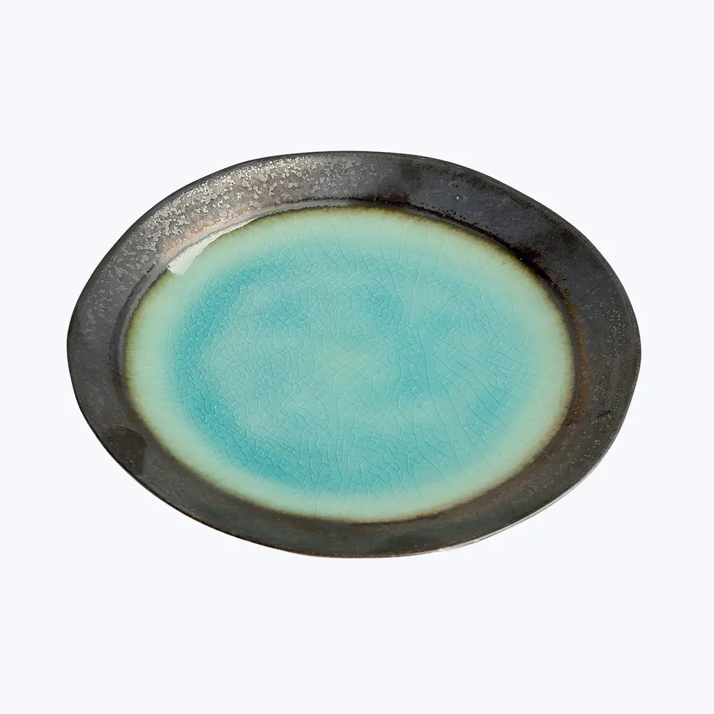 Fusing Eastern and Western styles, philosophies, and techniques, stoneware ceramics are crafted in Thailand. Cool tones brilliantly crackle in a marine habitat - a play of shadows, light, and texture. Each piece features one-of-a-kind crystalized designs inspired by pools of water.