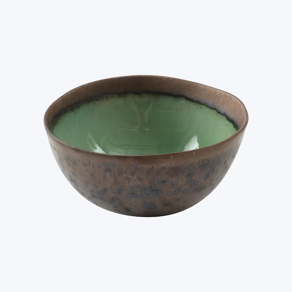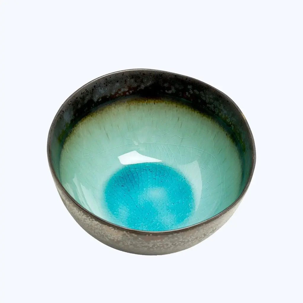 Fusing Eastern and Western styles, philosophies, and techniques, stoneware ceramics are crafted in Thailand. Cool tones brilliantly crackle in a marine habitat - a play of shadows, light, and texture. Each piece features one-of-a-kind crystalized designs inspired by pools of water.