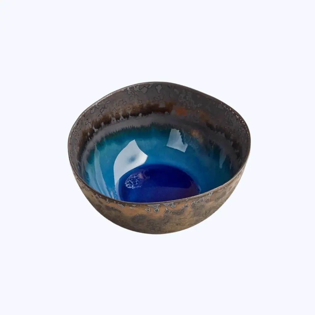 Fusing Eastern and Western styles, philosophies, and techniques, stoneware ceramics are crafted in Thailand. Cool tones brilliantly crackle in a marine habitat - a play of shadows, light, and texture. Each piece features one-of-a-kind crystalized designs inspired by pools of water.