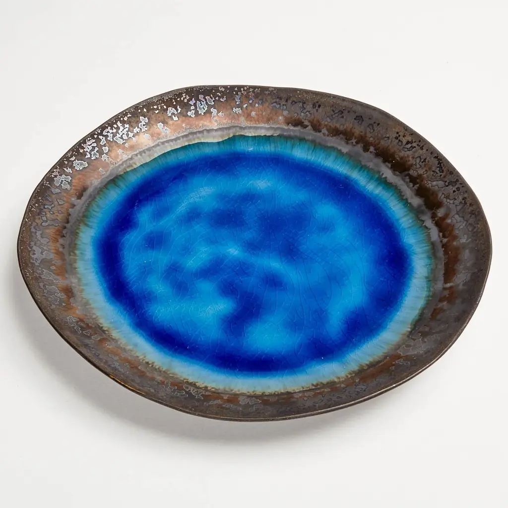 Fusing Eastern and Western styles, philosophies, and techniques, stoneware ceramics are crafted in Thailand. Cool tones brilliantly crackle in a marine habitat - a play of shadows, light, and texture. Each piece features one-of-a-kind crystalized designs inspired by pools of water.