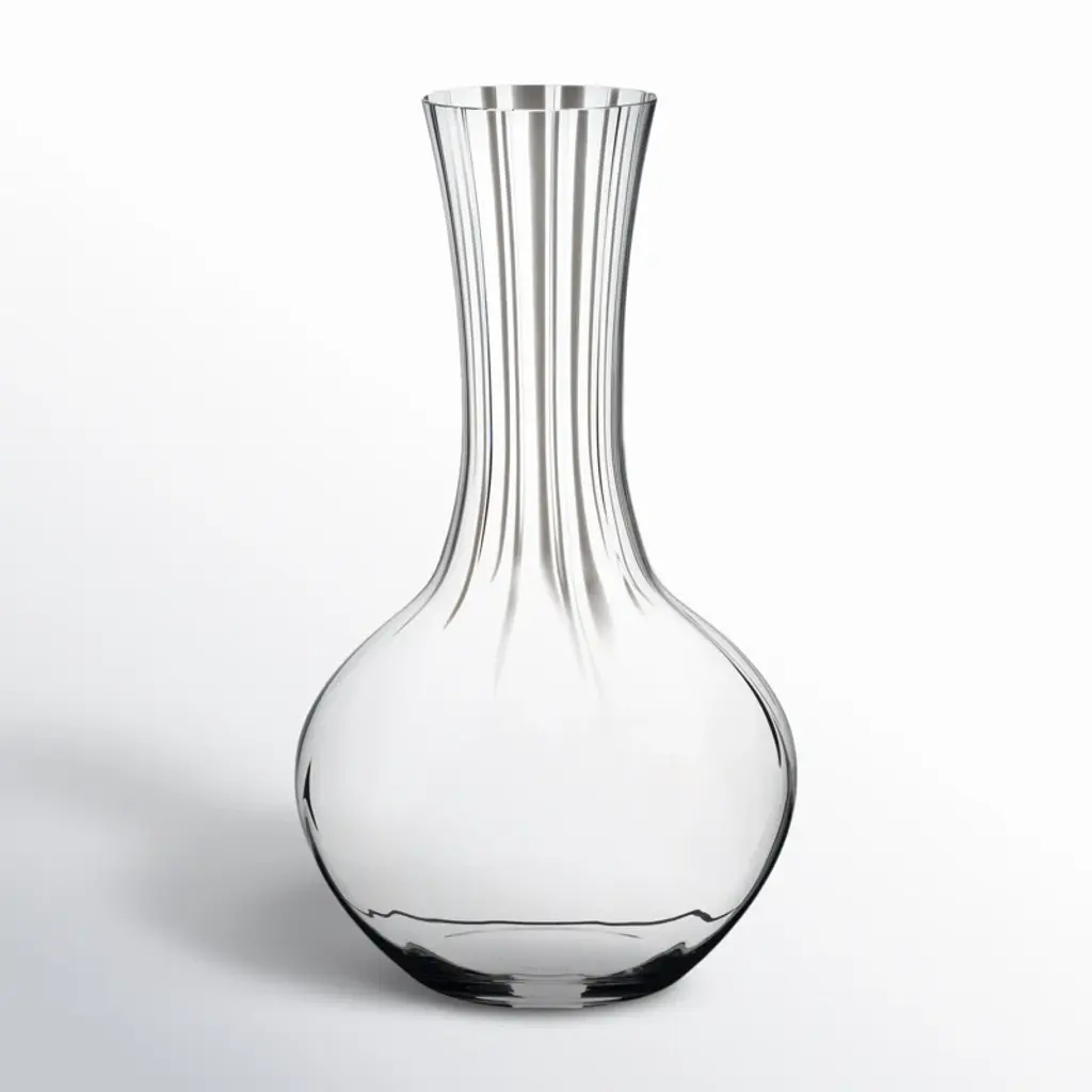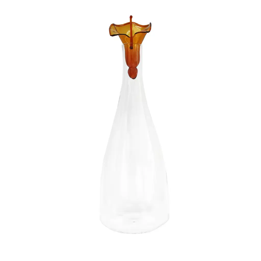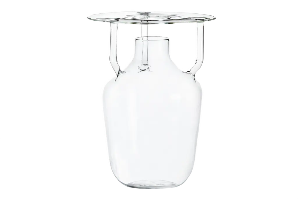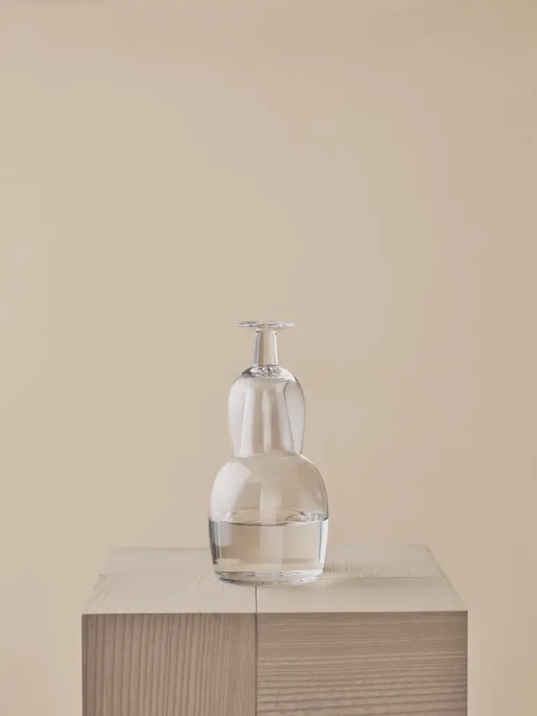 Glass Carafe is a set consisting of 1 carafe and 1 glass.Minimum order of 4 sets.Since it was designed in 2000, Glass Carafe has been hiding in Aldo Bakker’s prototype archive. The carafe’s wide bottom that converts into a very slender neck creates a soft and organic shape. The same shape is mirrored in the drinking glass, which doubles as a lid for the carafe itself. Whether the two are placed next to each other or with the glass upside down on top, the shape of the set has a fascinating and eye-catching appeal. Glasses are also sold separately in a set of four.Material: Clear mouth-blown lead-free crystalCleaning instructions: Dishwasher safe