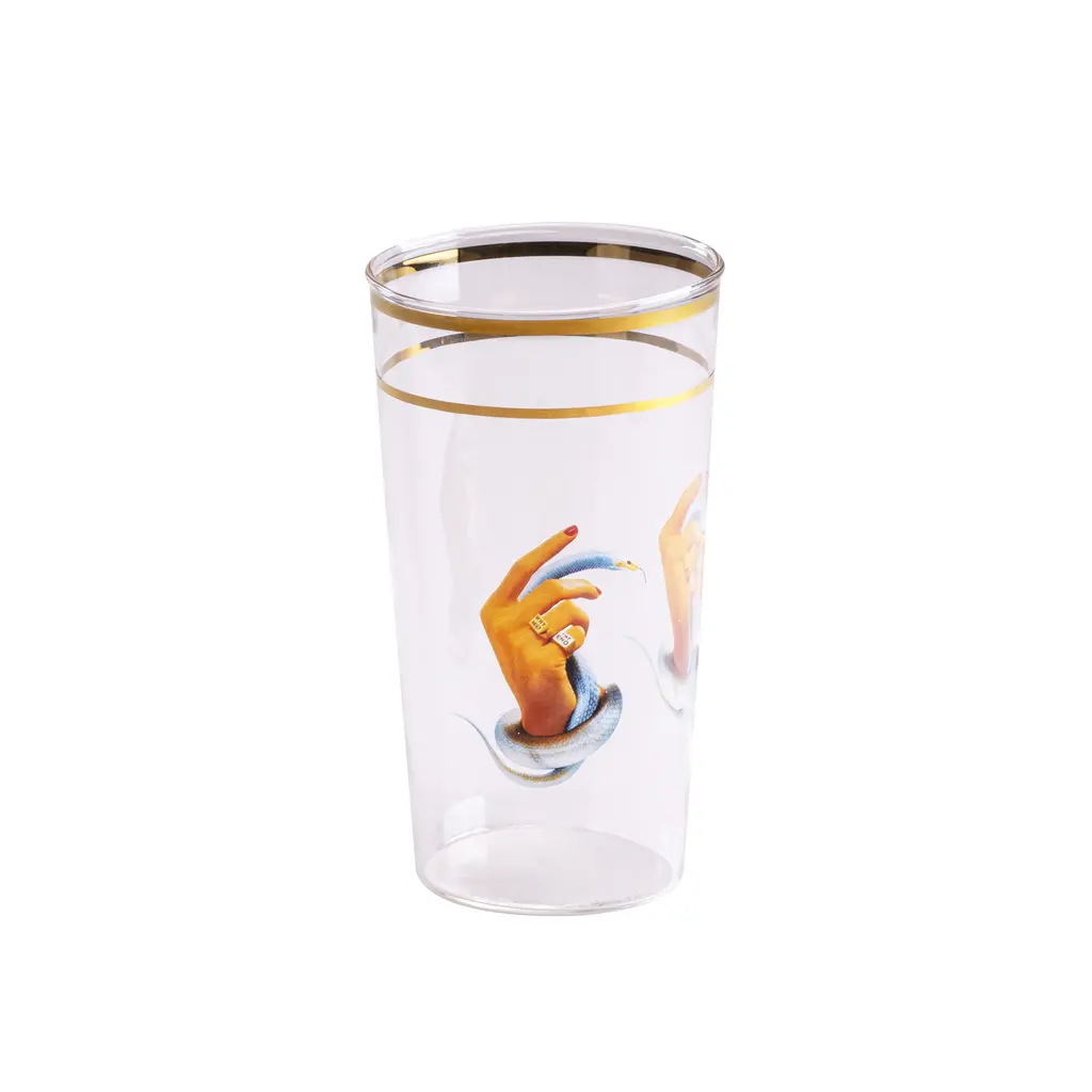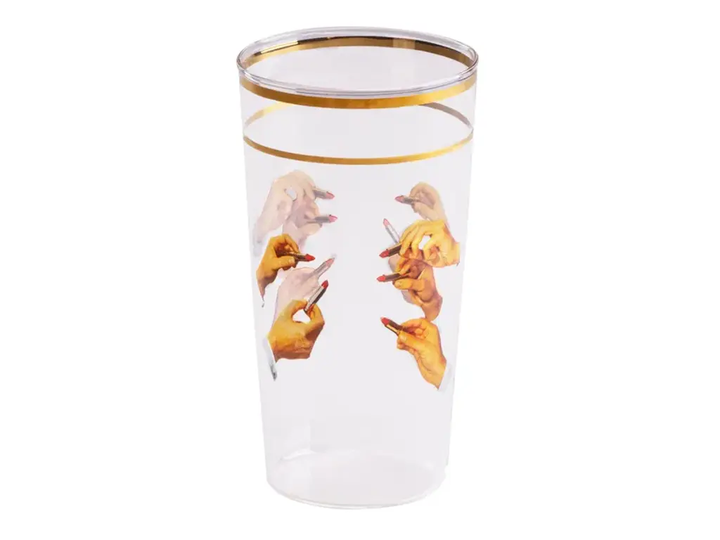 With the Seletti Wears Toiletpaper Glasses, even a simple glass of water can become dazzling. Created in a collaboration between Toiletpaper and Seletti, this series brings some of the most renowned images from the magazine’s photo archive into living spaces. These glasses are as tongue in cheek as they are stylish and bold. They feature edgy images with a subtle retro touch. Golden detailing adds a glamorous finishing touch to the eye-catching designs. Made from borosilicate glass, the Seletti Wears Toiletpaper Glasses are crafted to last. Coffee cups from the same series are also available, along with home décor, furniture, and accessories.