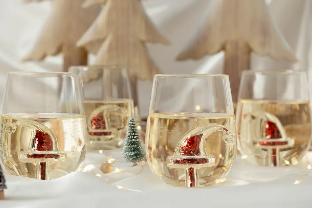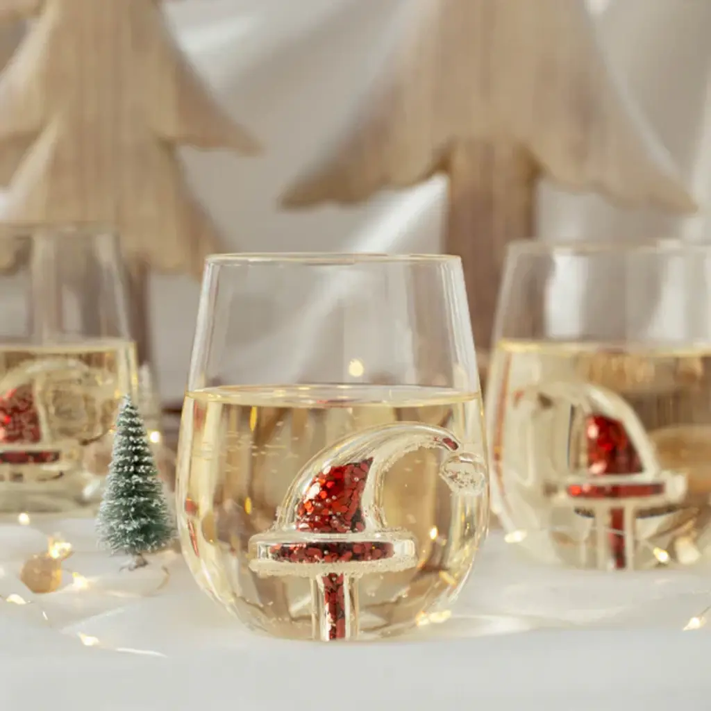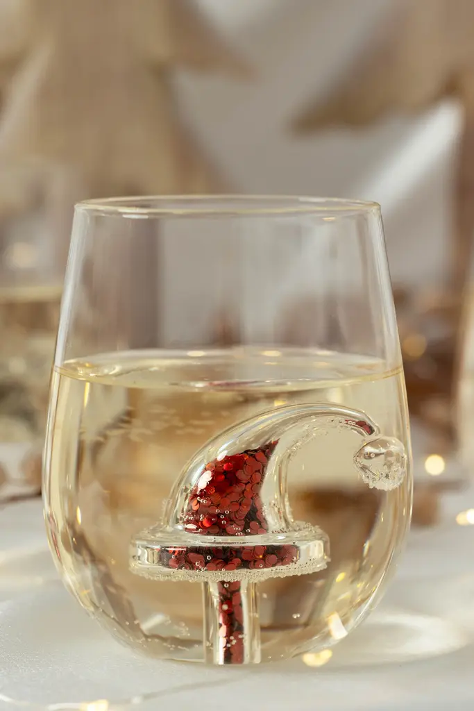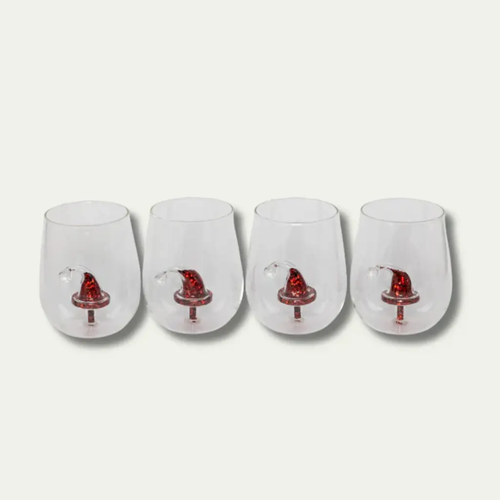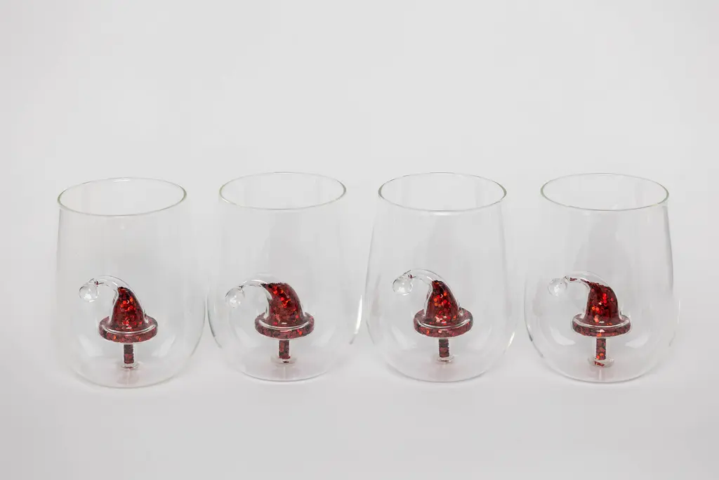 Glitter Christmas Santa Hat Stemless Wine Glass, Set Of 4