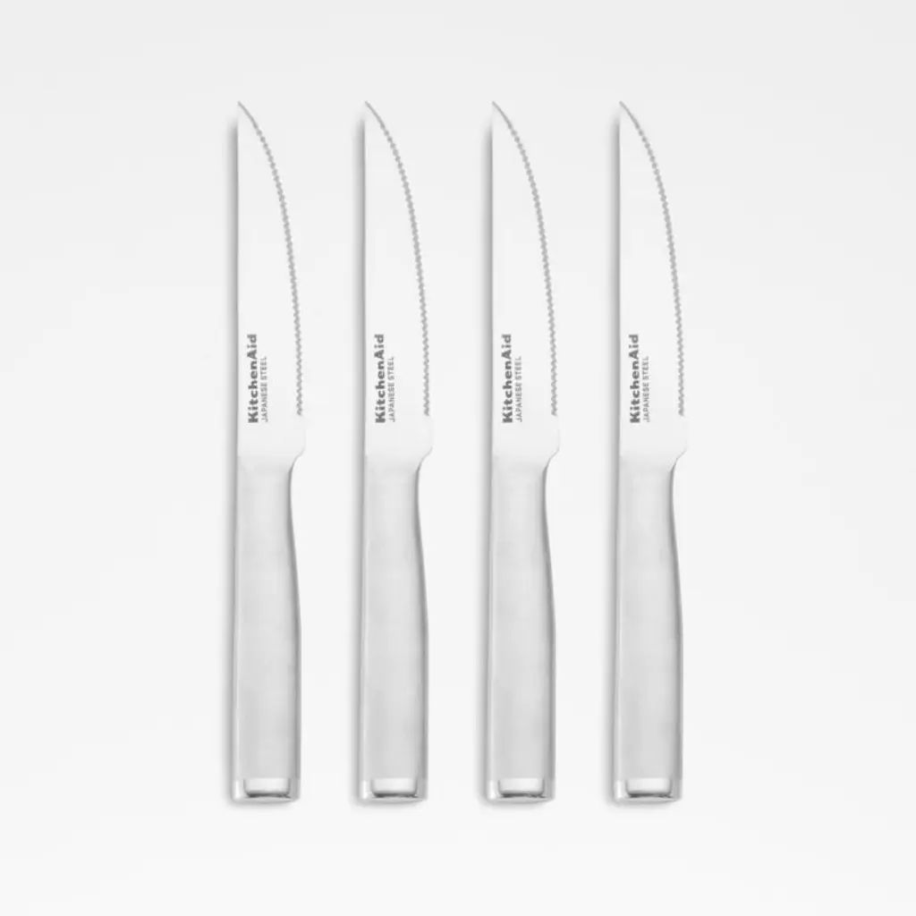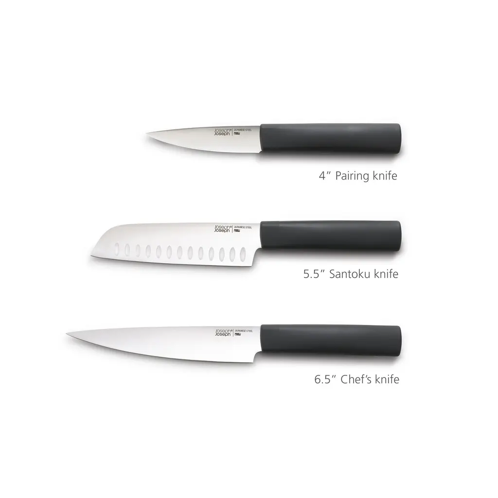 The four essential knives in this set are crafted in Japan with unique straight edges that stay sharp for an impressively long time. The seamless knives have a distinctive modern design, hygienic stainless steel construction, professional performance and a dramatic signature dimple pattern on the handles. The slip-resistant, ergonomic hollow handles are filled with sand for ideal weight and balance. A fantastic wedding, graduation or housewarming gift, this four-piece set includes a 4.25-inch utility knife, 5-inch santoku knife, 6-inch serrated utility knife and 8-inch chef's knife for slicing, dicing and chopping with ease.