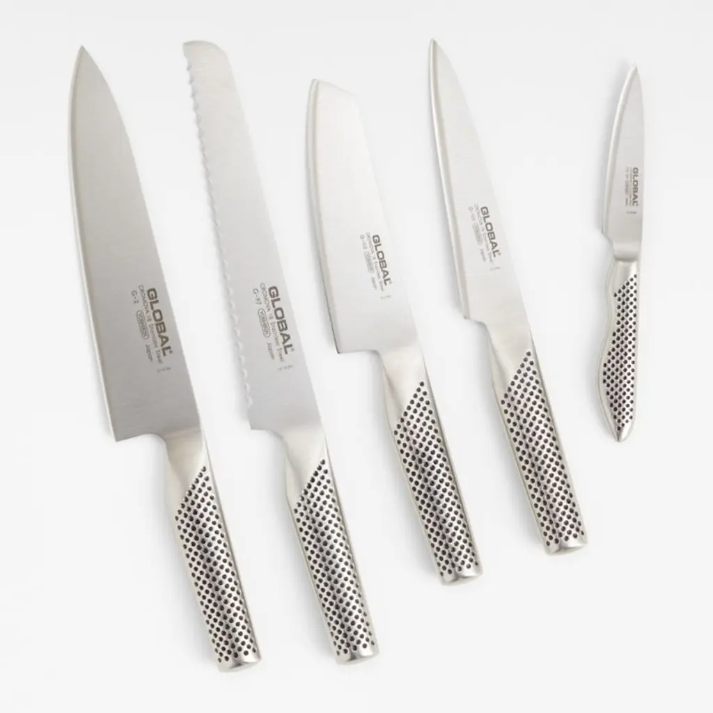 The five essential knives in this in-drawer set are crafted with ice-hardened edges that stay sharp for an impressively long time. The seamless knives have a distinctive modern design with hygienic stainless steel construction, professional performance and a dramatic signature dimple pattern on the handles. Slip-resistant, ergonomic hollow handles are filled with sand for ideal weight and balance. A fantastic wedding, graduation or housewarming gift, our exclusive set includes a 3½-inch paring knife, 5½-inch vegetable knife, 6-inch utility knife, 8-inch bread knife and 8-inch cook's knife in a beechwood in-drawer storage unit that saves precious counter space. Need help choosing? Here's your essential guide to choosing the best knifeView all Global Knives
