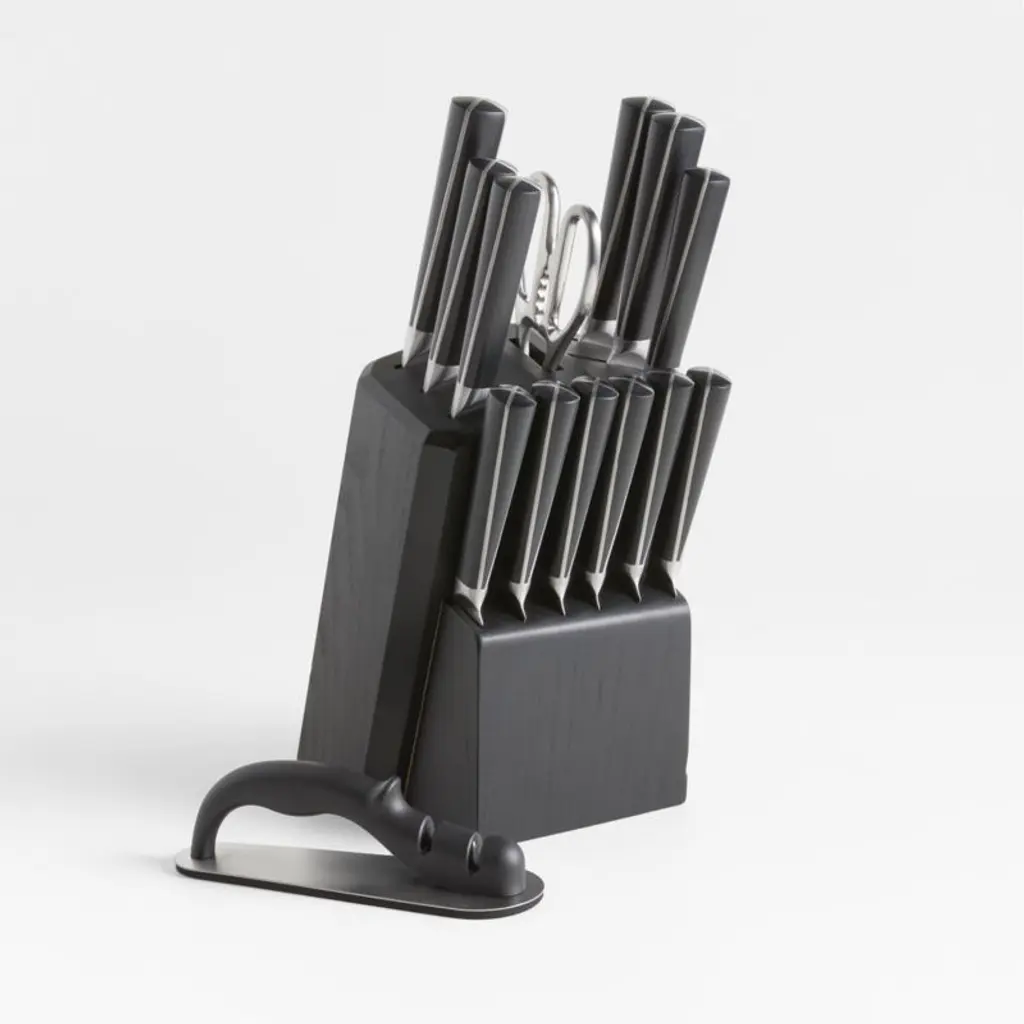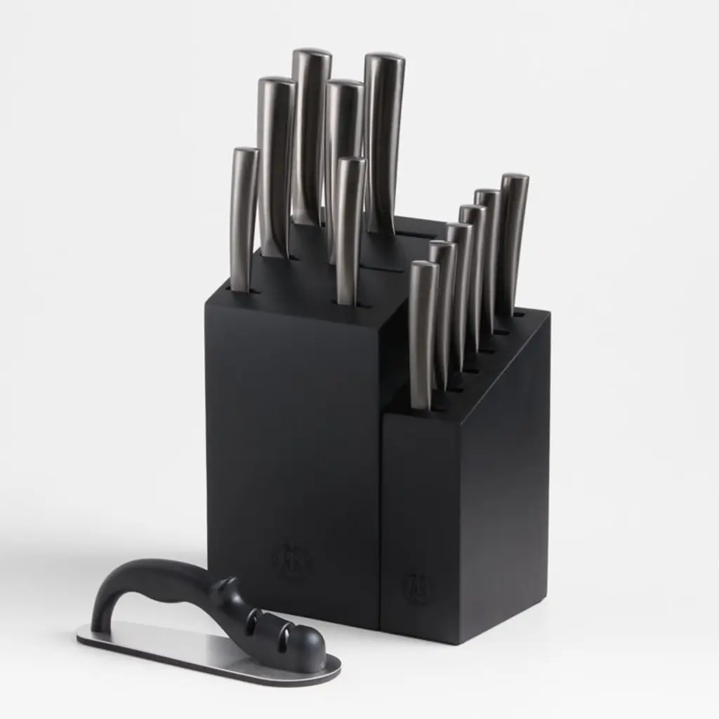 Global's Hashira knife set displays four essentials in a contemporary, space-saving block with eye-catching minimalism. Made of light maple, the sculptural stand has an open-frame design with four slots at top that gives a view of the knives' blades behind clear acrylic-paneled sides. The four knives in the set4-inch paring, 5.5-inch vegetable, 8-inch chef's and 8.5-inch breadfeature razor-sharp blades and sand-filled handles with Global's signature dimpled-grip for the ideal weight, balance and slip-resistant comfort.