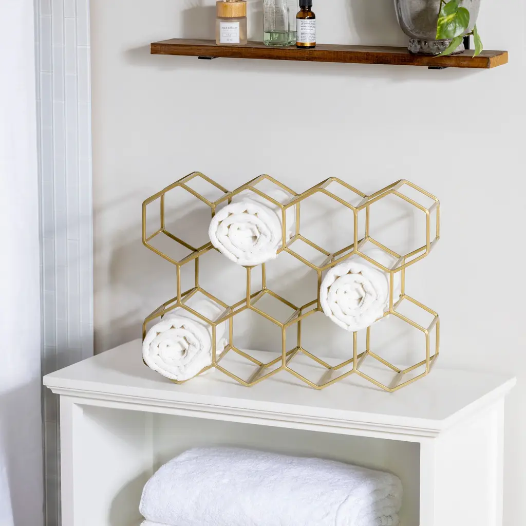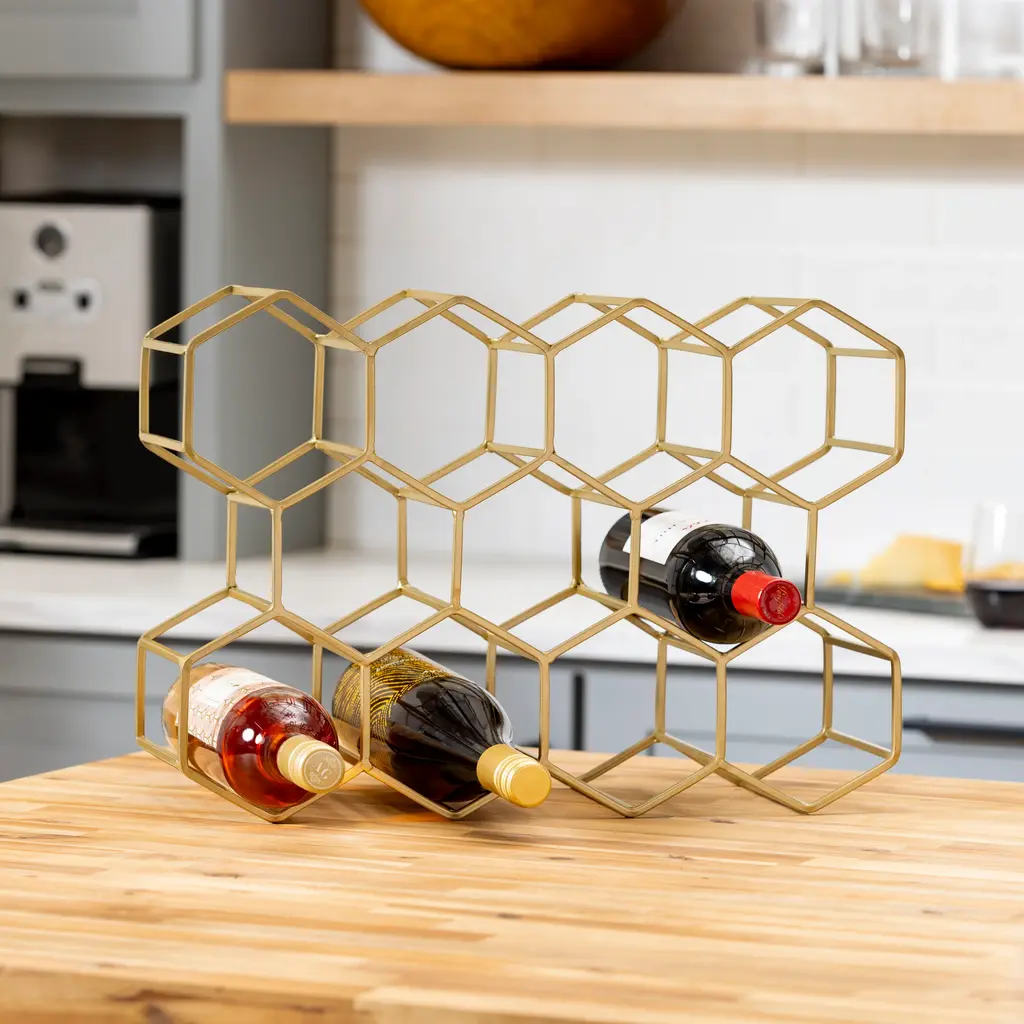 Elevate your bar and wine area with this modern honeycomb style wine bottle holder. This asthetically pleasing metal counter top holder can safely store 11 wine bottles and stands 13" tall or display it vertically for 13" long look. This can also be used to store towels or hand cloths as well as magazine and newspapers. Update the look of any space and improve your storage with this metal holder.