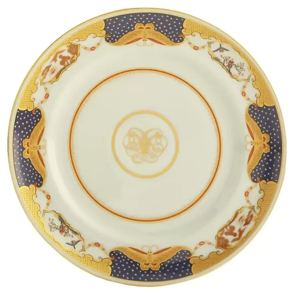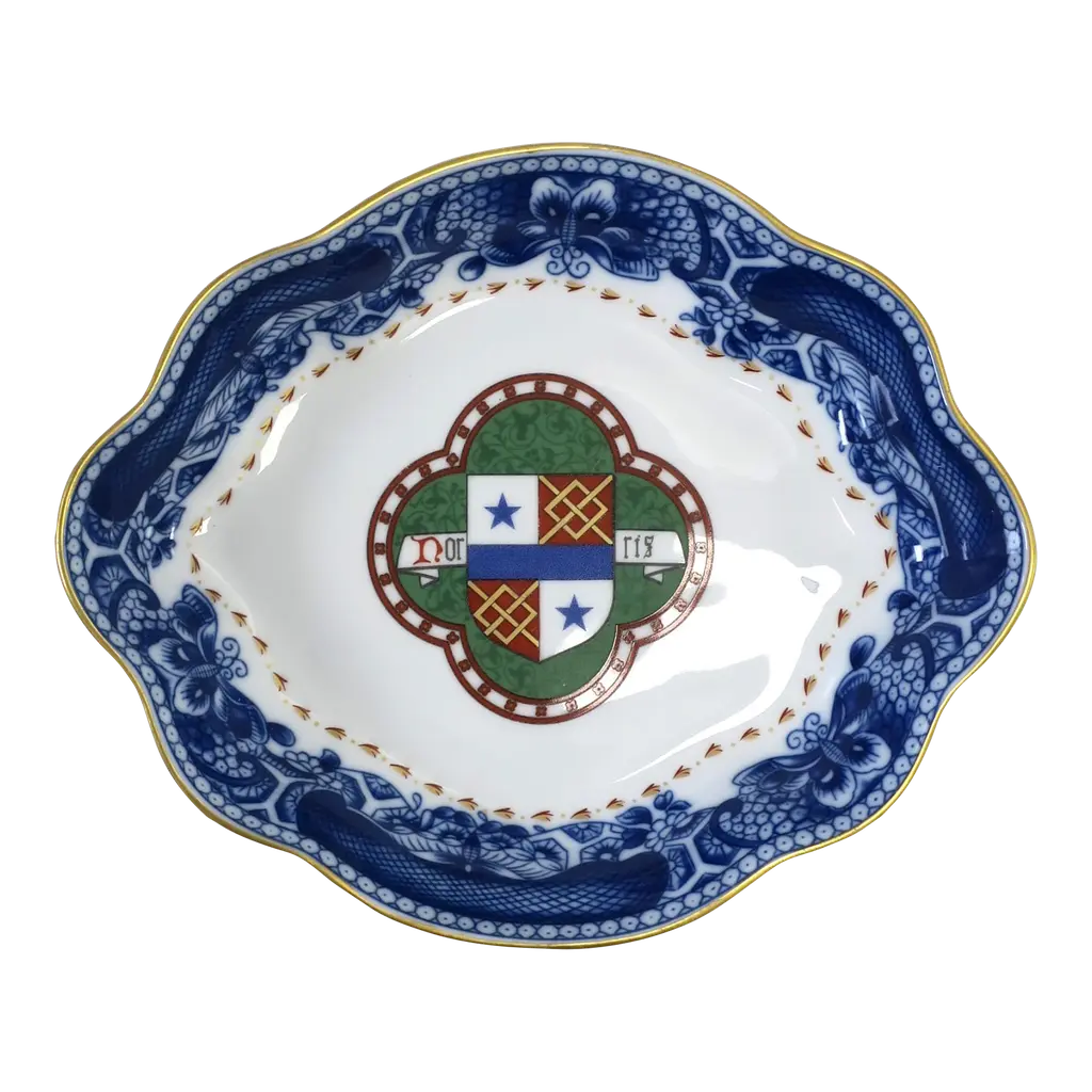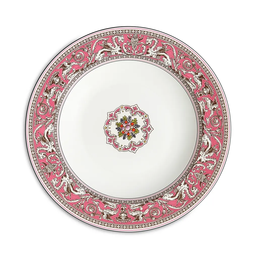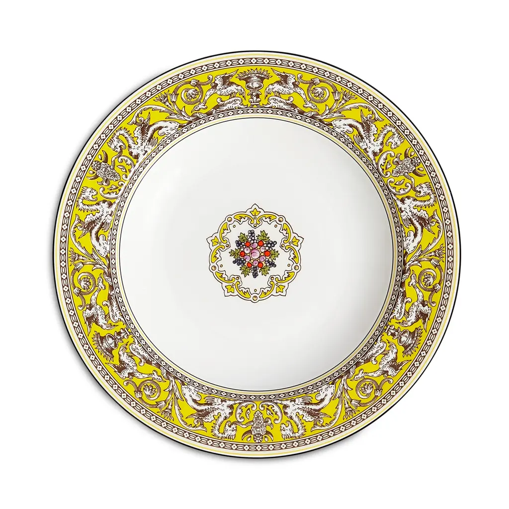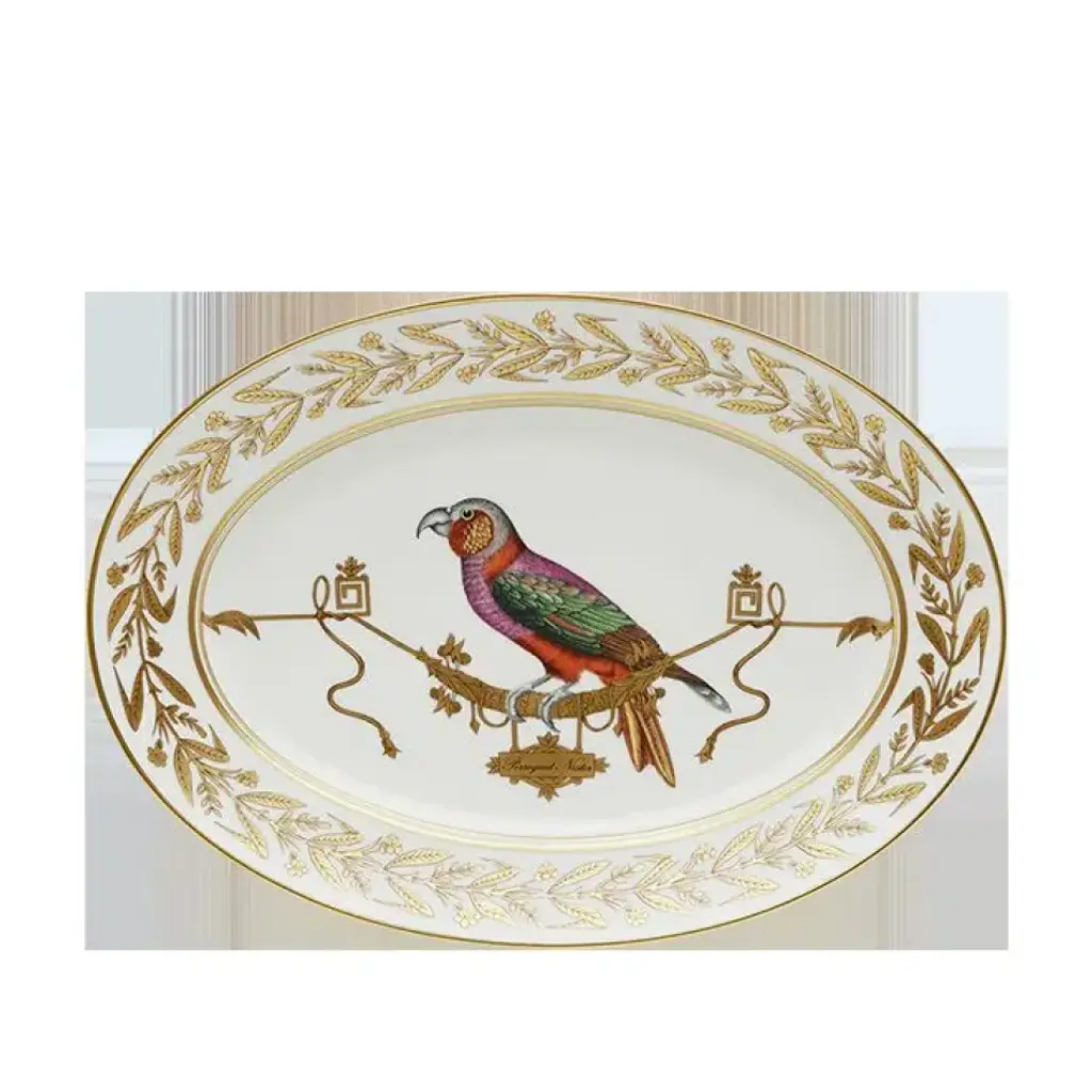The large platter is oval in shape and is highly decorative. A favorite with brides, Mottahedeh specializes in luxurious patterns and unique, elegant shapes that are reproduced from china found in museums and historical societies. The patterns feature complex and vibrant colors, and hand-painted gold decoration. The pieces are surprisingly fresh and timely, and look wonderful in both contemporary and traditional dining rooms.