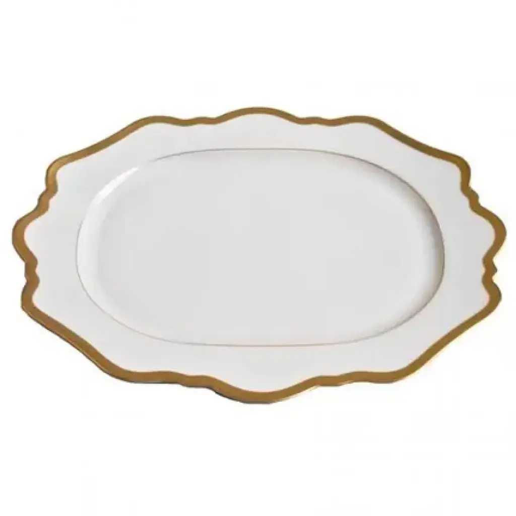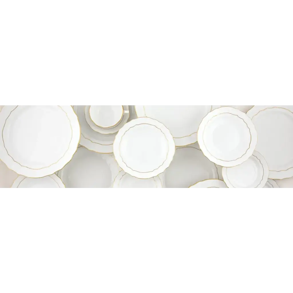 Created for Count Hadik in the early twentieth century, the classic style of Golden Edge celebrates this noble Hungarian family. Janos Hadik served as the president of Herend Porcelain from 1926 to 1933. Hand painted in Hungary. Now the biggest porcelain manufactory in Europe, Herend was founded in 1826 to produce earthenware in the small Hungarian village for which it was named. At the time, Hungary was flooded with low-cost pottery, but in 1839, Mor Fischer became the Manufactory’s new owner and he decided to focus on producing dinnerware replacement pieces for Europe’s royal families to complement their valuable porcelain patterns from Germany and the Far East. As his client base grew, Fischer commissioned his artists to begin designing dinnerware patterns of their own. Queen Victoria’s 1851 purchase of a large set for Windsor Castle was a milestone, setting the stage for aristocrats throughout Europe to clamor for Herend in their estates. In the 1850s, Herend added meticulously-crafted figurines to its creations. Herend’s trademark fishnet pattern, which is widely recognized and prized as Herend’s signature design, started in 1858 when an artist who was intrigued with a Chinese plate’s fish scale design painted it onto a rooster figurine to imitate feathers.