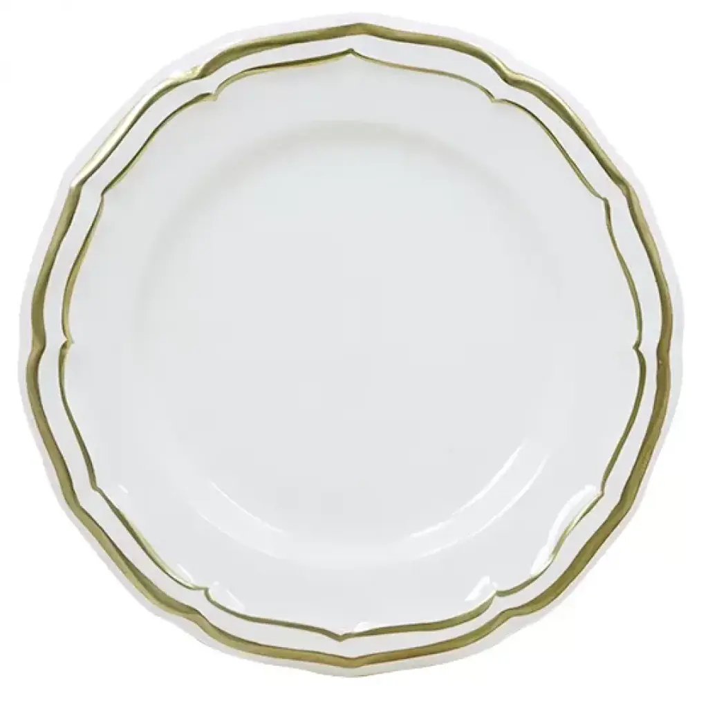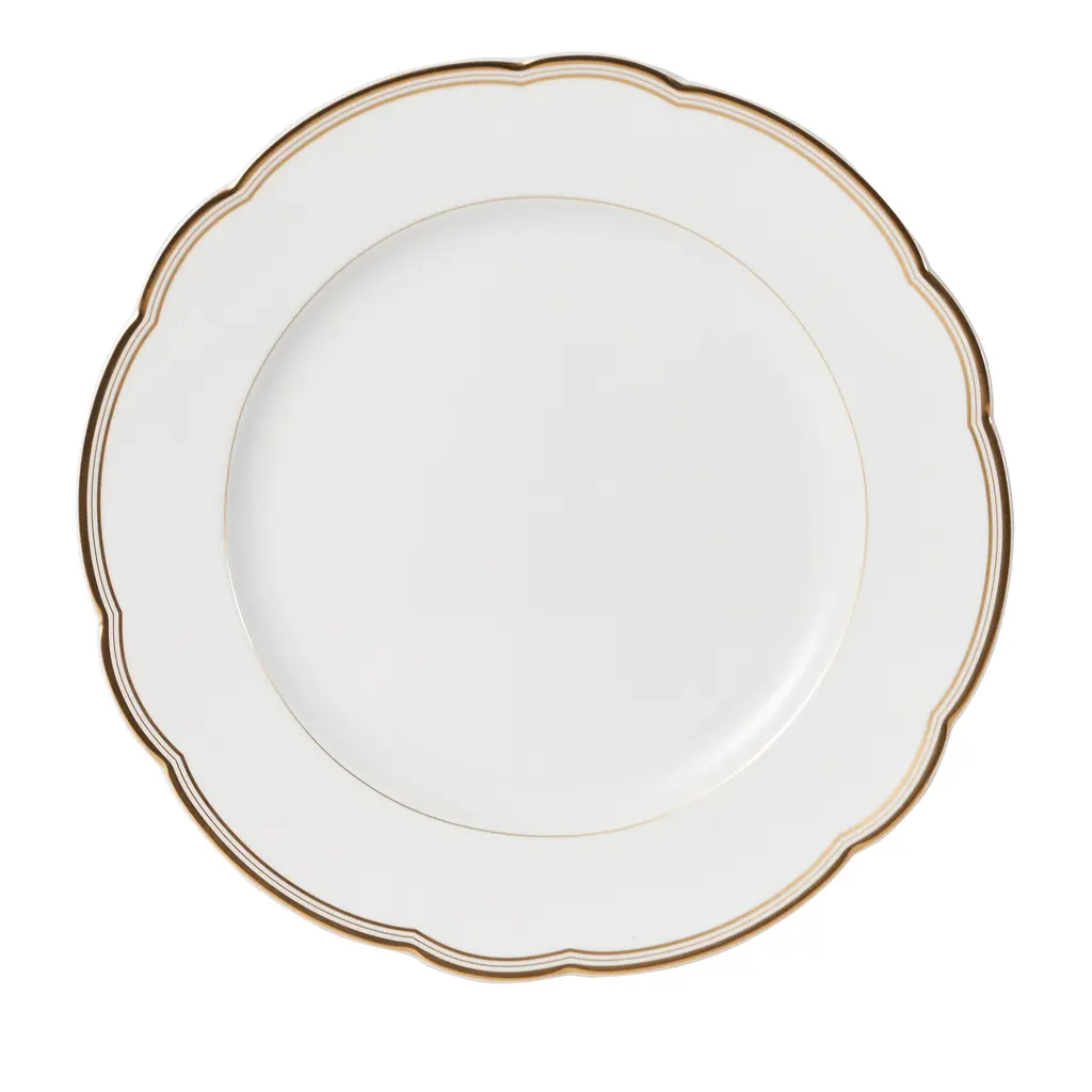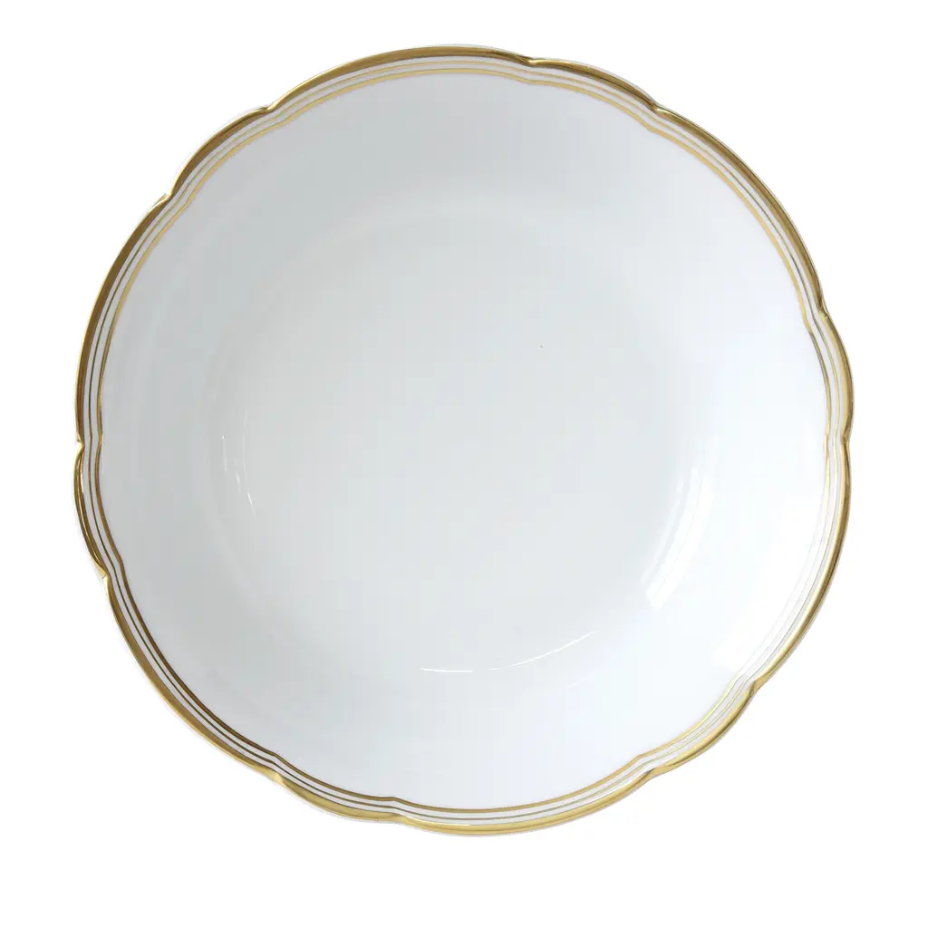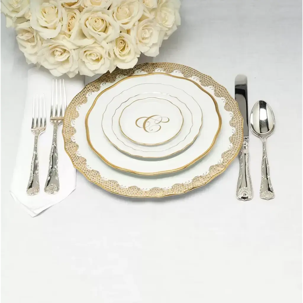 Created for Count Hadik in the early twentieth century, the classic style of Golden Edge celebrates this noble Hungarian family. Janos Hadik served as the president of Herend Porcelain from 1926 to 1933. Hand painted in Hungary. Now the biggest porcelain manufactory in Europe, Herend was founded in 1826 to produce earthenware in the small Hungarian village for which it was named. At the time, Hungary was flooded with low-cost pottery, but in 1839, Mor Fischer became the Manufactory’s new owner and he decided to focus on producing dinnerware replacement pieces for Europe’s royal families to complement their valuable porcelain patterns from Germany and the Far East. As his client base grew, Fischer commissioned his artists to begin designing dinnerware patterns of their own. Queen Victoria’s 1851 purchase of a large set for Windsor Castle was a milestone, setting the stage for aristocrats throughout Europe to clamor for Herend in their estates. In the 1850s, Herend added meticulously-crafted figurines to its creations. Herend’s trademark fishnet pattern, which is widely recognized and prized as Herend’s signature design, started in 1858 when an artist who was intrigued with a Chinese plate’s fish scale design painted it onto a rooster figurine to imitate feathers.
