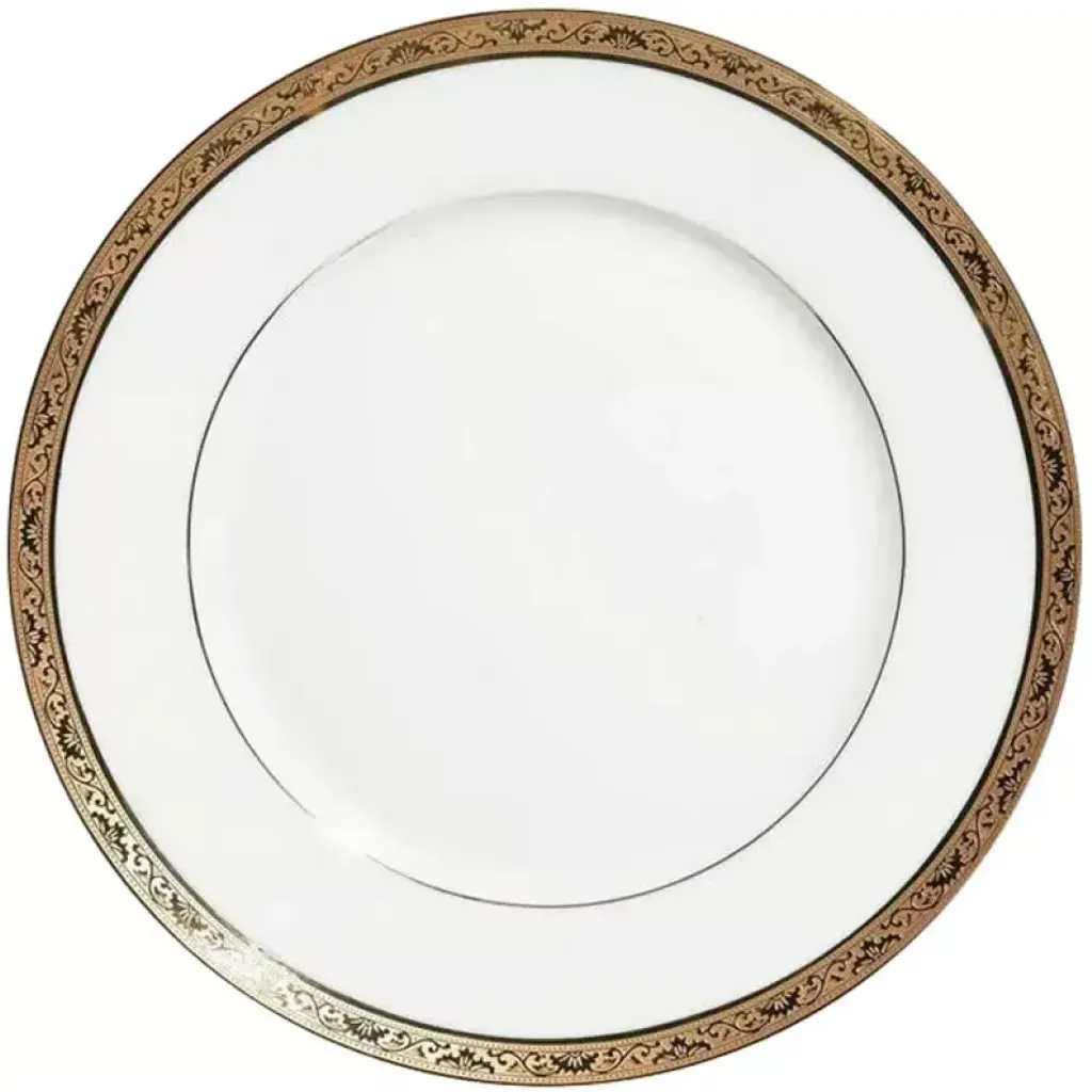 Created for Count Hadik in the early twentieth century, the classic style of Golden Edge celebrates this noble Hungarian family. Janos Hadik served as the president of Herend Porcelain from 1926 to 1933. Hand painted in Hungary. Now the biggest porcelain manufactory in Europe, Herend was founded in 1826 to produce earthenware in the small Hungarian village for which it was named. At the time, Hungary was flooded with low-cost pottery, but in 1839, Mor Fischer became the Manufactory’s new owner and he decided to focus on producing dinnerware replacement pieces for Europe’s royal families to complement their valuable porcelain patterns from Germany and the Far East. As his client base grew, Fischer commissioned his artists to begin designing dinnerware patterns of their own. Queen Victoria’s 1851 purchase of a large set for Windsor Castle was a milestone, setting the stage for aristocrats throughout Europe to clamor for Herend in their estates. In the 1850s, Herend added meticulously-crafted figurines to its creations. Herend’s trademark fishnet pattern, which is widely recognized and prized as Herend’s signature design, started in 1858 when an artist who was intrigued with a Chinese plate’s fish scale design painted it onto a rooster figurine to imitate feathers.