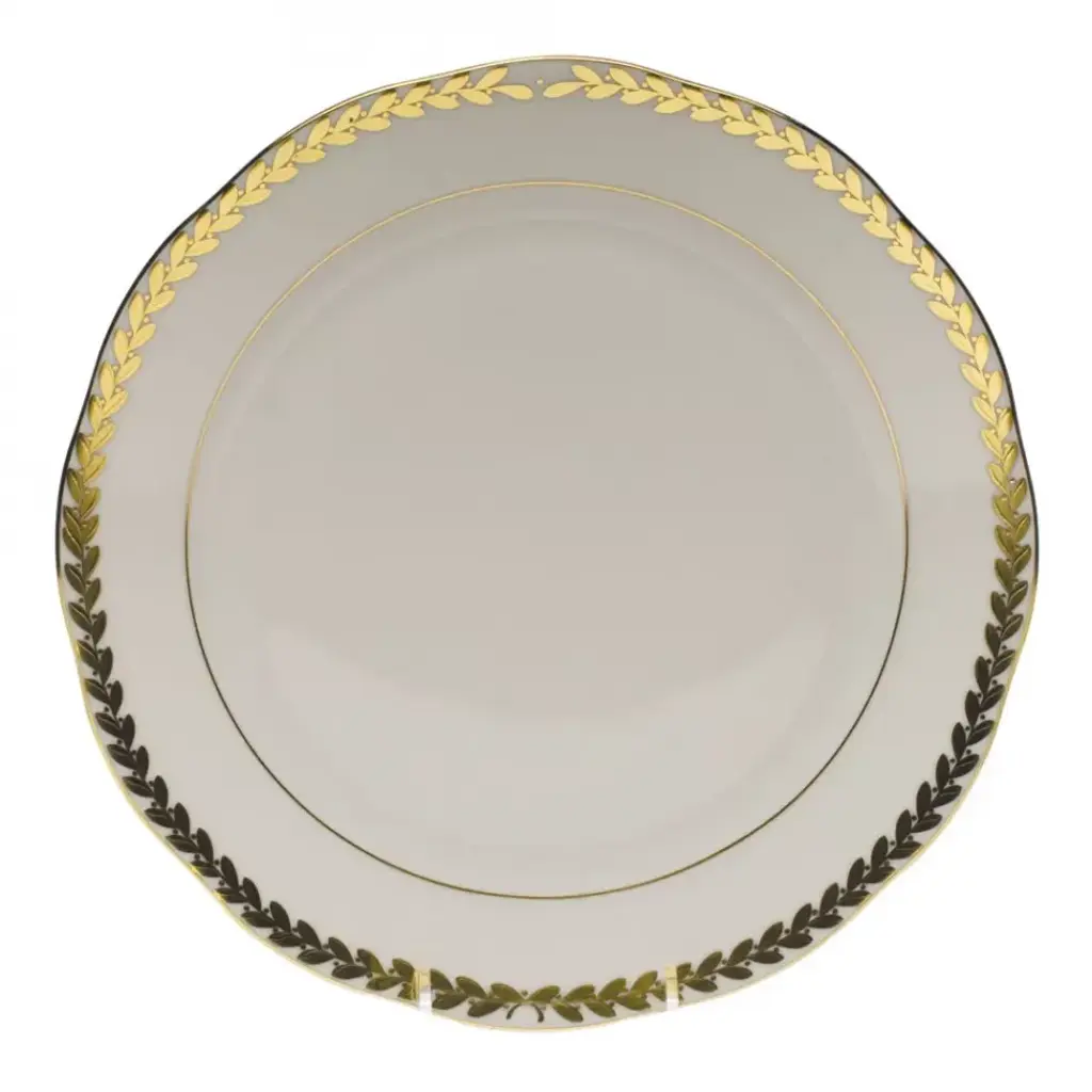 This pattern was originally created in the 1870s for use at the Royal Palace during the reign of Francis Joseph I, Emperor of Austria and King of Hungary. When it was first designed, it consisted of a golden laurel wreath branch and bore the monogram of Francis Joseph as well as the Hungarian Crown. Hand painted in Hungary. Now the biggest porcelain manufactory in Europe, Herend was founded in 1826 to produce earthenware in the small Hungarian village for which it was named. At the time, Hungary was flooded with low-cost pottery, but in 1839, Mor Fischer became the Manufactory’s new owner and he decided to focus on producing dinnerware replacement pieces for Europe’s royal families to complement their valuable porcelain patterns from Germany and the Far East. As his client base grew, Fischer commissioned his artists to begin designing dinnerware patterns of their own. Queen Victoria’s 1851 purchase of a large set for Windsor Castle was a milestone, setting the stage for aristocrats throughout Europe to clamor for Herend in their estates. In the 1850s, Herend added meticulously-crafted figurines to its creations. Herend’s trademark fishnet pattern, which is widely recognized and prized as Herend’s signature design, started in 1858 when an artist who was intrigued with a Chinese plate’s fish scale design painted it onto a rooster figurine to imitate feathers.