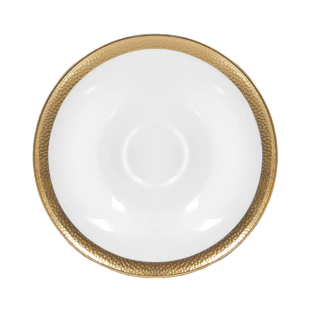 Vivid white Michael Aram porcelain dinnerware detailed with pebbled 24K gold rims embodies relaxed refinement.