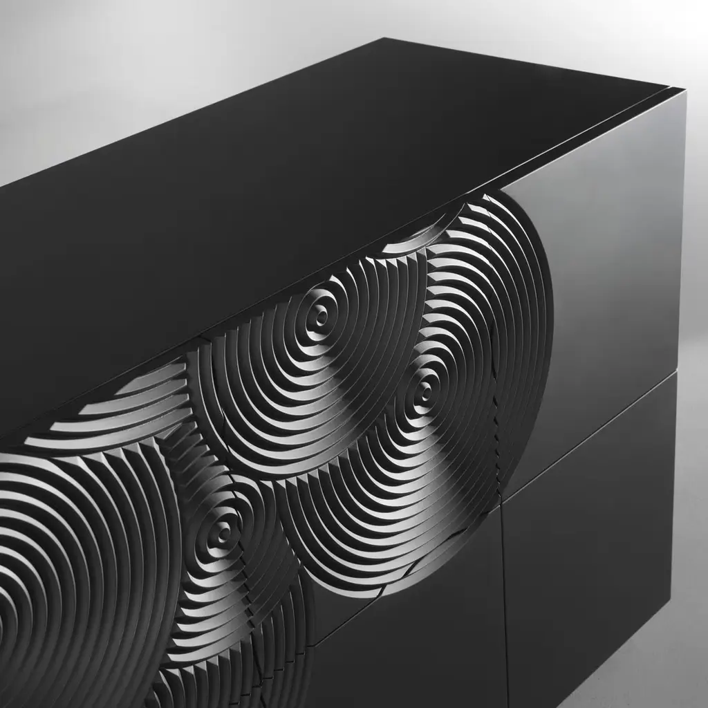 This elegant and sophisticated cupboard is entirely crafted in MDF, medium density fiber, an extremely dense and durable substance. The surface was then coated in an opaque black lacquer. This exquisite piece of furniture provides generous storage with 5 doors opening up onto its spacious interior complete with 3 long shelves in tempered glass. The front of the cupboard features a carved decoration with an array of concentric circles ranging in size. This piece can be perfect in a bedroom for storing clothing and personal items, or in a living room for the storage of electronics.