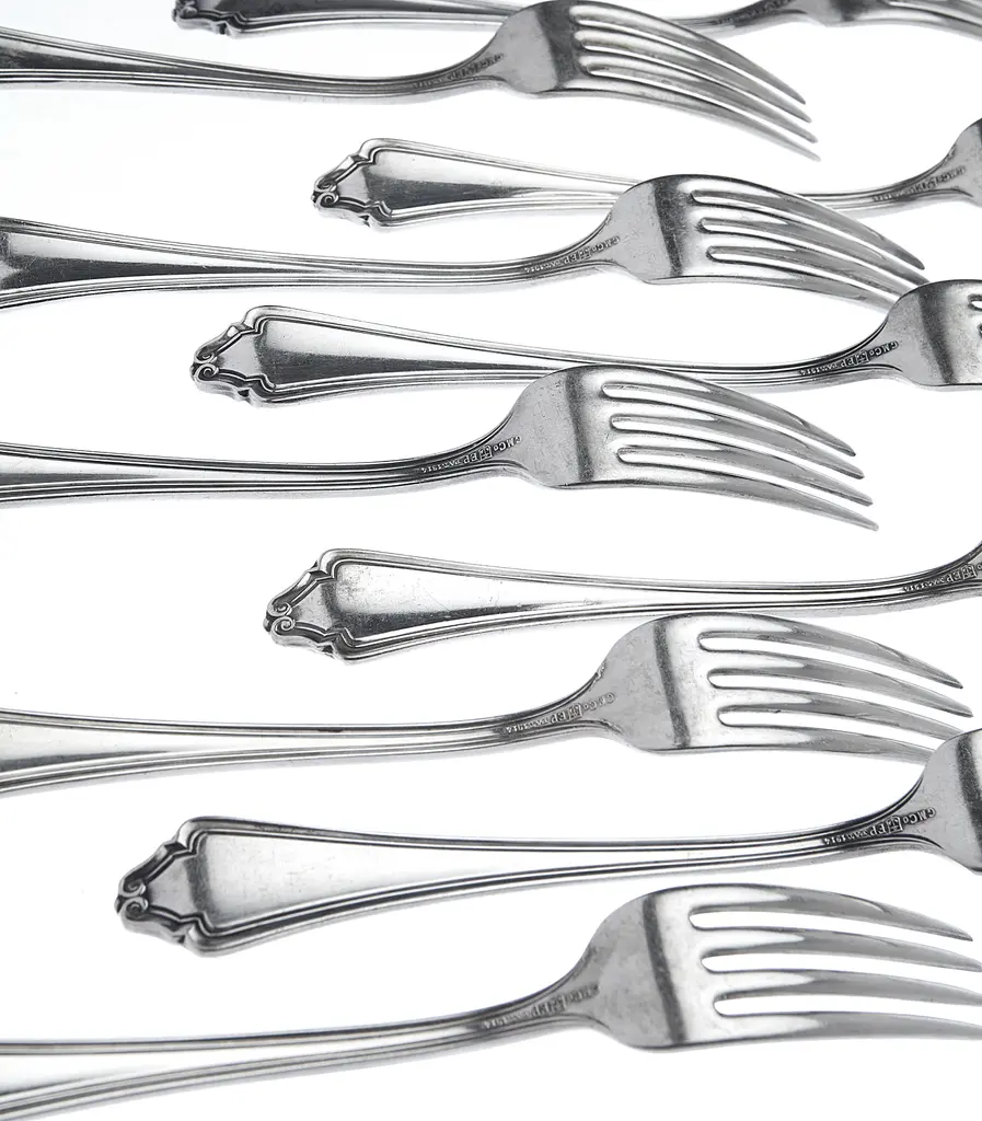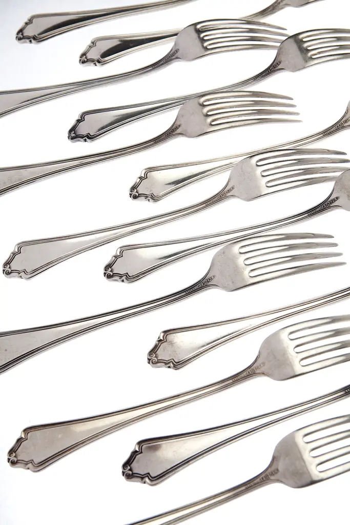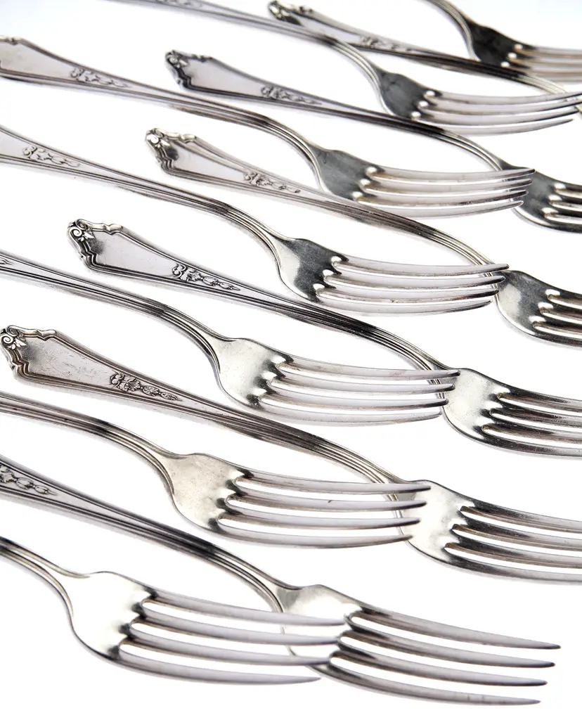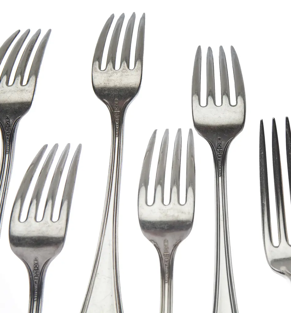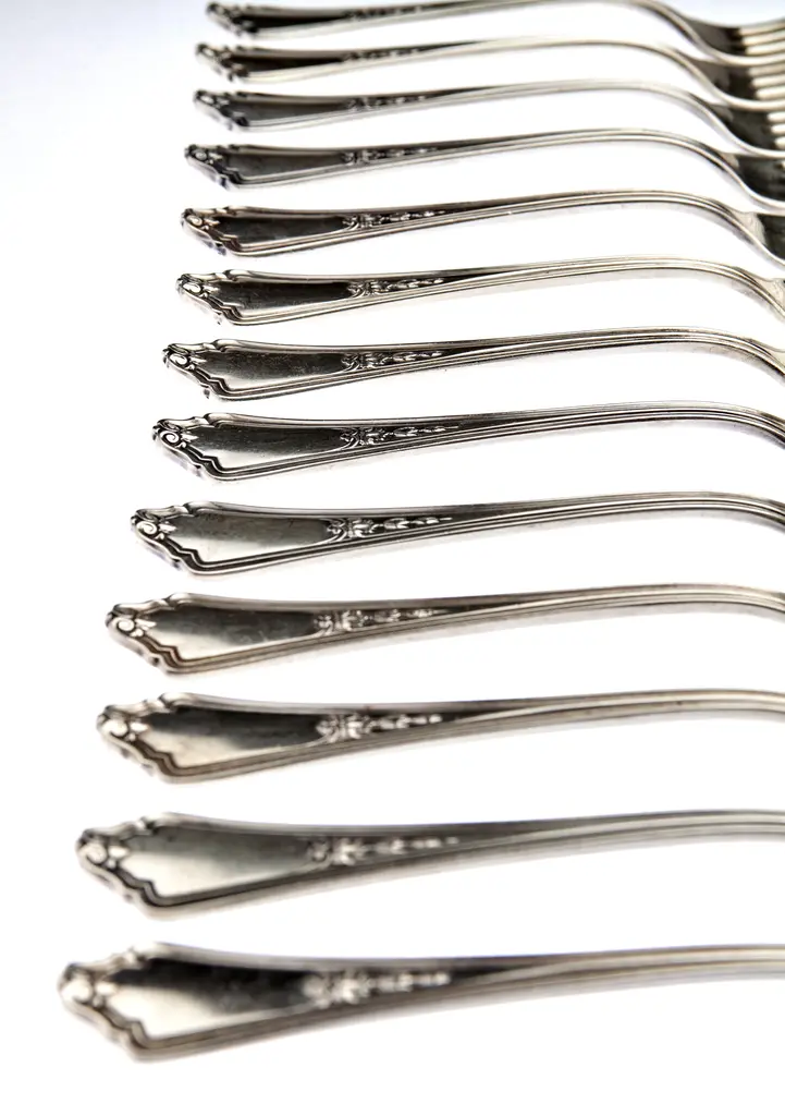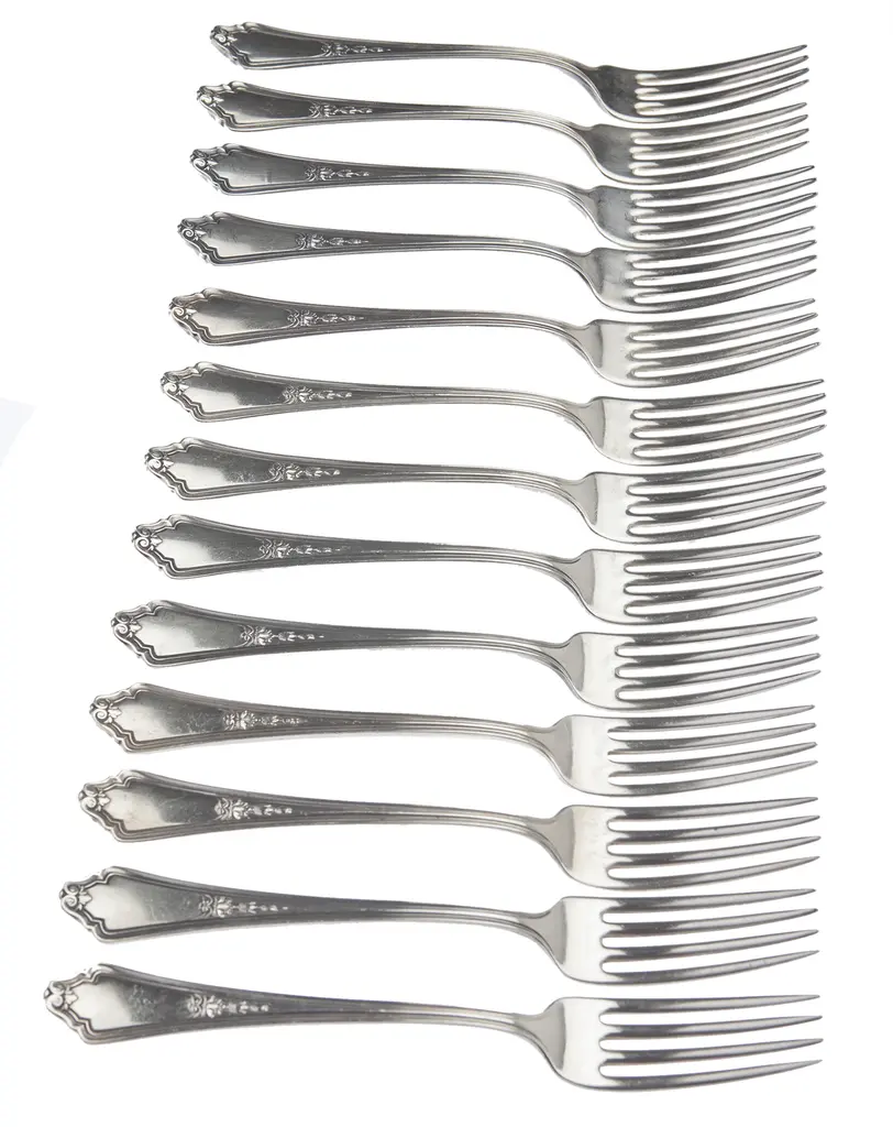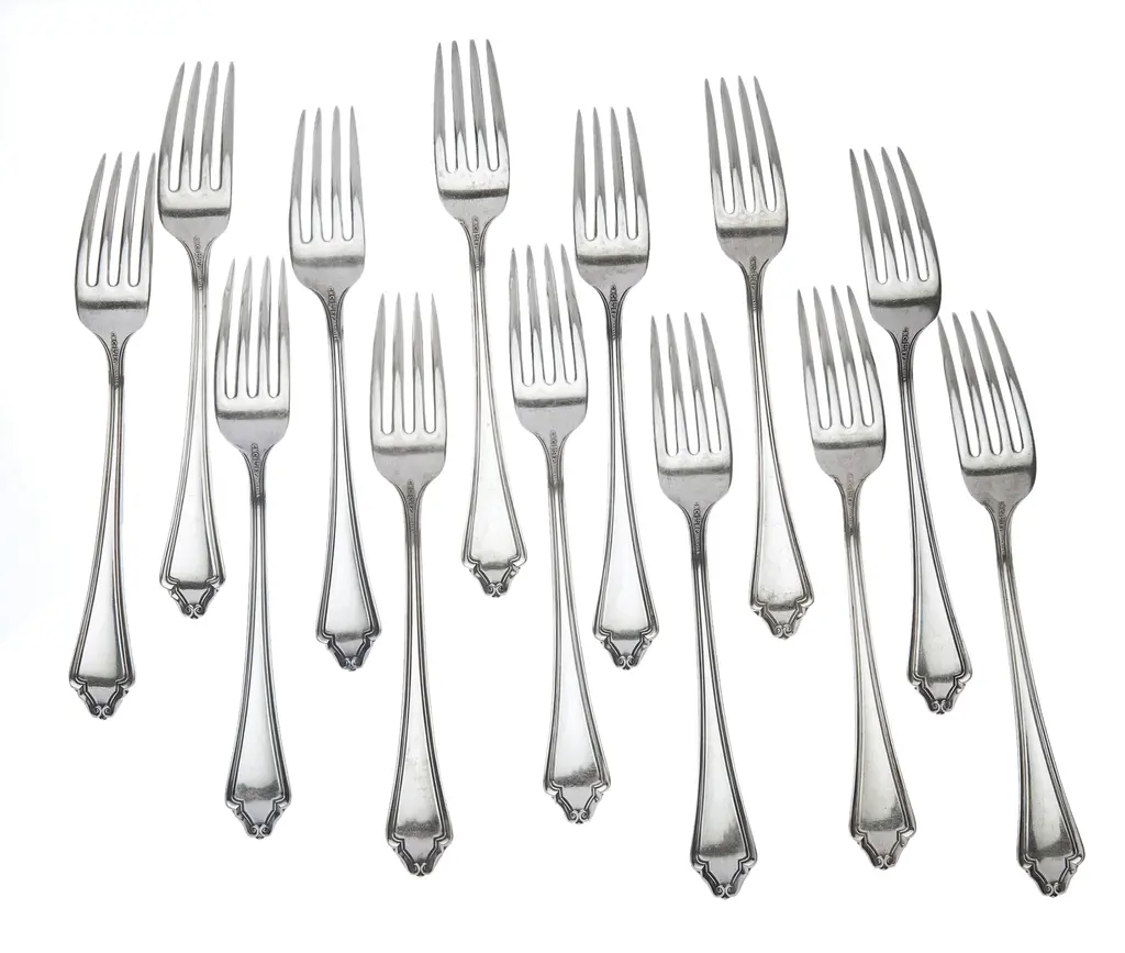 Silver plate salad forks by Gorham in the Shelburne pattern in excellent antique condition. The pattern is from 1914 and marked EP pat. 1914.