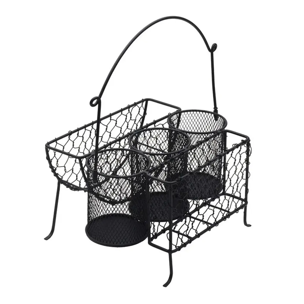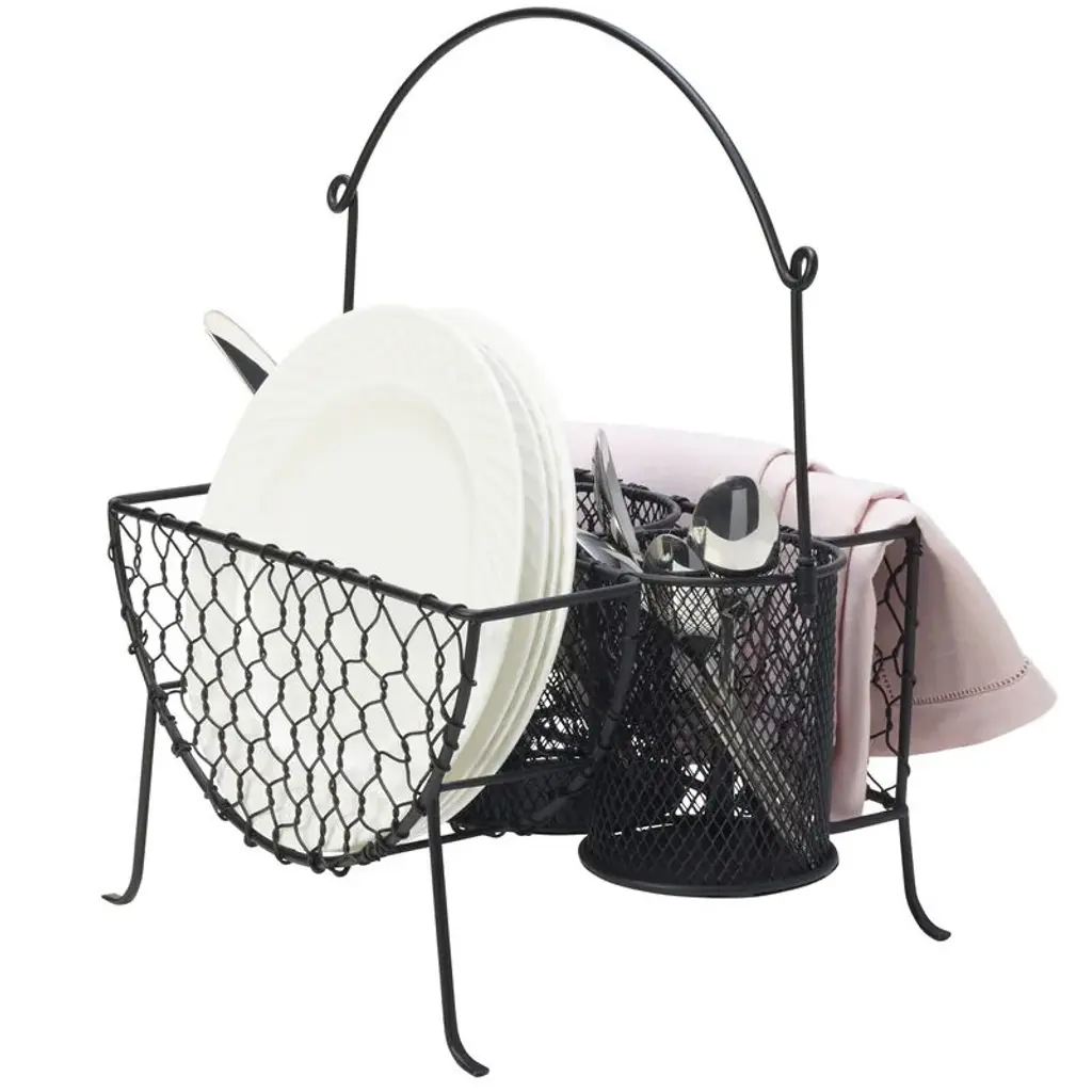 Gourmet Basics by Mikasa Farmer's Market Picnic Hostess Storage Flatware Caddy - NewEasily bring dining necessities to and from the table with this Gourmet Basics Farmers Market Picnic Caddy by Mikasa. Handcrafted from iron for long-lasting beauty, even under rigorous use, this attractive basket has a contemporary black finish that complements most décor. The wire frame design provides clear visibility of the contents, and the caddy features compartments to keep forks, knives, spoons, plates, and napkins grouped together, organized, and separated. Caddy has a convenient handle on top for carrying. Measures 13-1/2 x 15-3/4 x 10 inches. Wipe clean with soft, damp cloth..FEATURES:COLOR:MATERIAL:WHAT'S IN THE BOX:PACKAGING: Retail Packaging