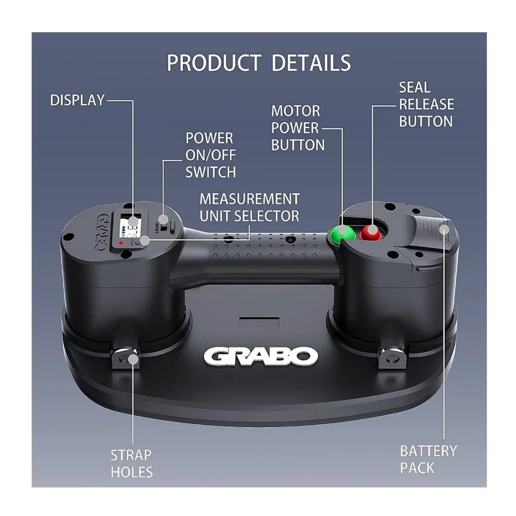 Grabo Pro-Lifter electric suction cup is equipped with a robust vacuum pump. The foam rubber vacuum seal on the Grabo Pro tool is strong and resistant to loss of vacuum pressure. Once the pressure pump is activated, it creates a strong suction and firmly attaches to any non-porous flat surface.The Grabo Pro-Lifter electric suction cup is designed for professionals. Unlike the other gigantic solutions, the tool is portable and handy. Living up to the promise of Heavy Lifting Made Easy, the Grabo Pro is equally effective on smooth as well as coarse surfaces. The Pro-Lifter has a pumping capacity of 20 liters per minute, a best-in-class. So, say goodbye to unreliable, and often dangerous, manual suction cups for the job. With Grabo Pro-Lifter electric suction cup you double your work efficiency with enhanced safety.The tool is designed to provide a better grip and less fatigue when moving heavy objects. The tool is an effective vacuum lifter even for dusty, semi-porous, or rough surfaces. The tool works perfectly with glass, wood, ceramic tiles, metals, and other materials.The handle is also equipped with a digital display that shows the maximum weight that the Grabo Pro-Lifter can safely lift at that very moment. The weight is displayed in both pounds and kg.The Pro-Lifter is equipped with a smart digital pressure sensor. This makes it even more effective on different surfaces. With a simple press of a button, the lifting function is automatically activated and regulated. The sensor automatically provides for the optimum level of suction, keeping objects in complete control whether the object is being lifted or even during movement. The digital display on the grab handle shows the pressure applied in both bars and psi. With the pressure sensors, you don't have to worry about turning the vacuum pump on or off.The tool operates on 14.8 volts 2600 mAh Li-ion removable battery. The battery takes two hours for a full charge. On a full charge, this powerful battery can last for 900 cycles or 1.5 hours on non-stop running. The battery lasts for a whopping 30 days in standby mode.Just like the Classic model, Grabo Pro-Lifter is also equipped with four lifting lugs placed on both sides of the grab handle. These lugs become handy in case the tool is to be used with additional grips or straps for support.The Grabo Pro-Lifter electric cup has been rigorously tested by professionals around the world. Given its compact design and competitive performance, the Pro Lifter is rapidly becoming a tool of choice, especially in the construction industry around the world.Bundle Includes: