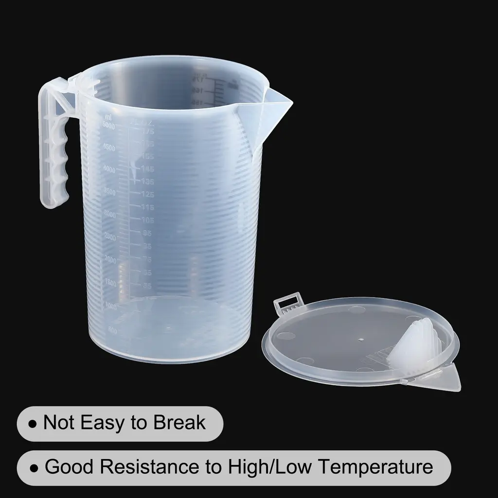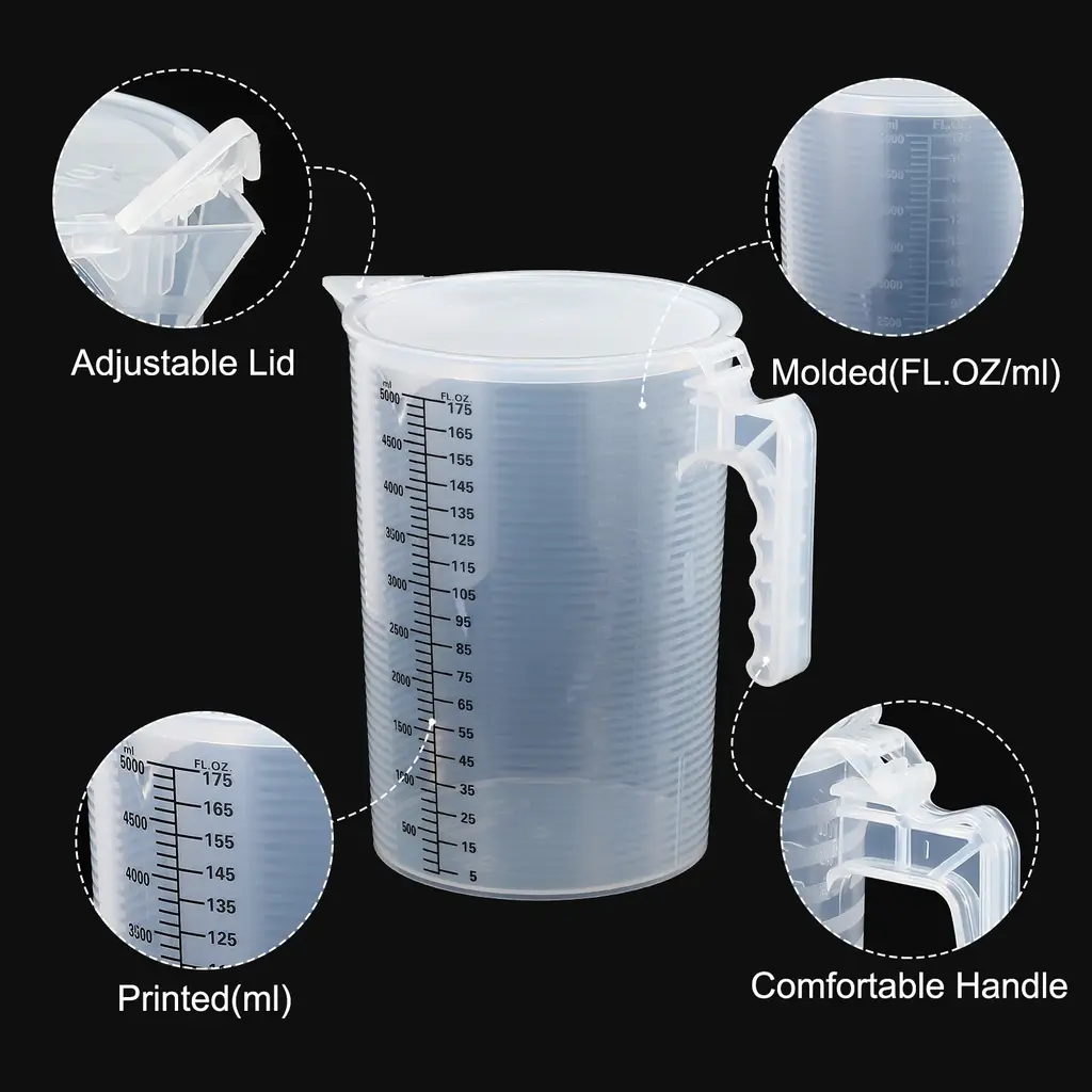 Application: The Graduated Beaker is designed for measuring, transferring, and storing the liquid in the lab or home, it features double-sided graduations with different measurements, and with a comfortable handle and spout, is a great tool even in the laboratory.Material: PP(Polypropylene); Capacity: 5000ml; Total Size: 16 x 22 x 26 cm / 6.3 x 8.66 x 10.24 inch (Bottom.D*Top.D*H); Package List: 1 x Graduated BeakerAdvantage: Made of PP plastic, with good resistance to high and low temperatures, strong toughness, not easy to break when falling, can serve a long time in daily use. Tapered spout for easy pouring and transferring of liquids, with a comfortable handle for easy and convenient lifting. Comes with a soft lid, has good sealing performance, is not easy to fall, easy to install and remove.Instruction: There are accurate graduations on each side of the beaker in different measurements, clear and not easy to fade, you can measure the liquid you want more conveniently.Notice: The Beaker has certain heat resistance, but it can not be a direct heating container.The Graduated Beaker is designed for measuring, transferring, and storing the liquid in the lab or home, it features double-sided graduations with different measurements, and with a comfortable handle and spout, is a great tool even in the laboratory.SpecificationMaterial: PP(Polypropylene)Capacity: 5000mlTotal Size: 16 x 22 x 26 cm / 6.3 x 8.66 x 10.24 inch (Bottom.D*Top.D*H)Package List: 1 x Graduated BeakerAdvantageMade of PP plastic, with good resistance to high and low temperatures, strong toughness, not easy to break when falling, can serve a long time in daily use.Tapered spout for easy pouring and transferring of liquids, with a comfortable handle for easy and convenient lifting.Comes with a soft lid, has good sealing performance, is not easy to fall, easy to install and remove.InstructionThere are accurate graduations on each side of the beaker in different measurements, clear and not easy to fade, you can measure the liquid you want more conveniently.NoticeThe Beaker has certain heat resistance, but it can not be a direct heating container.