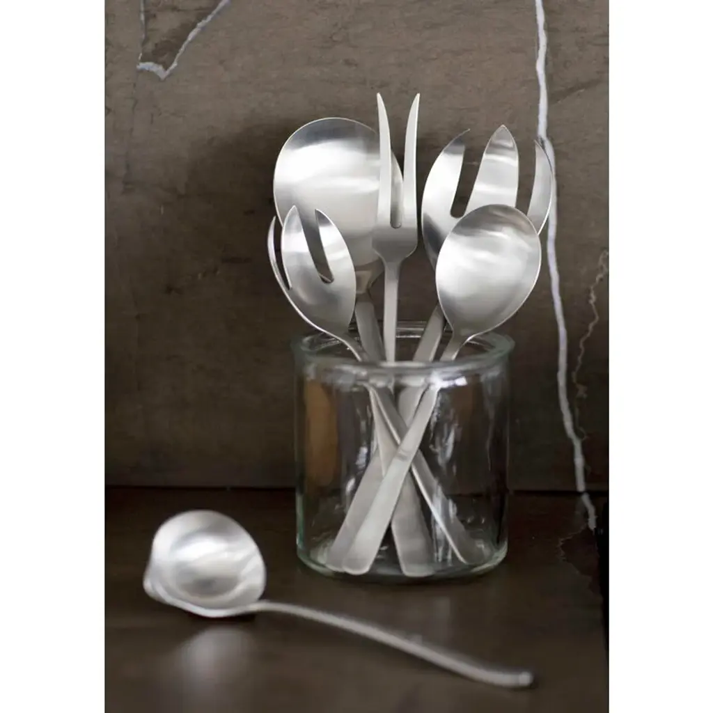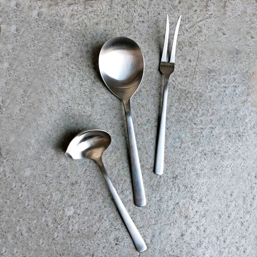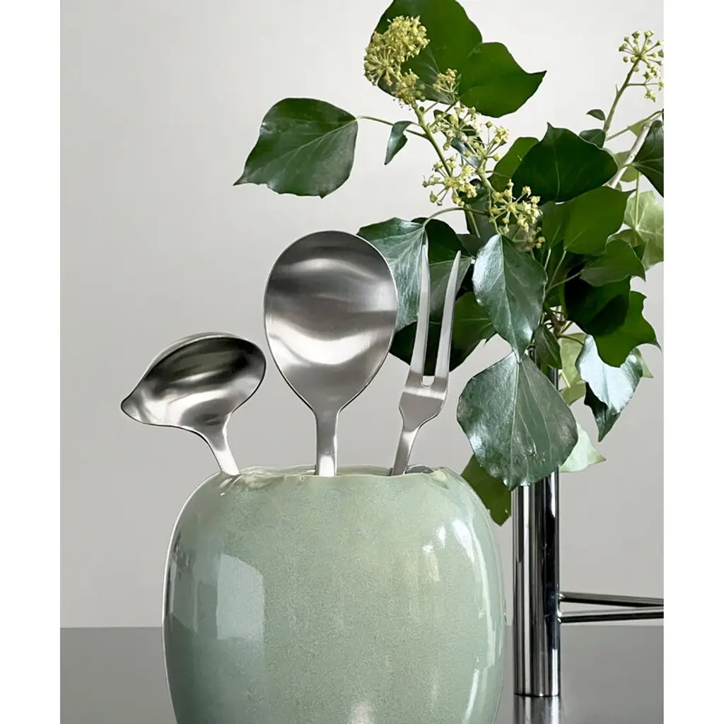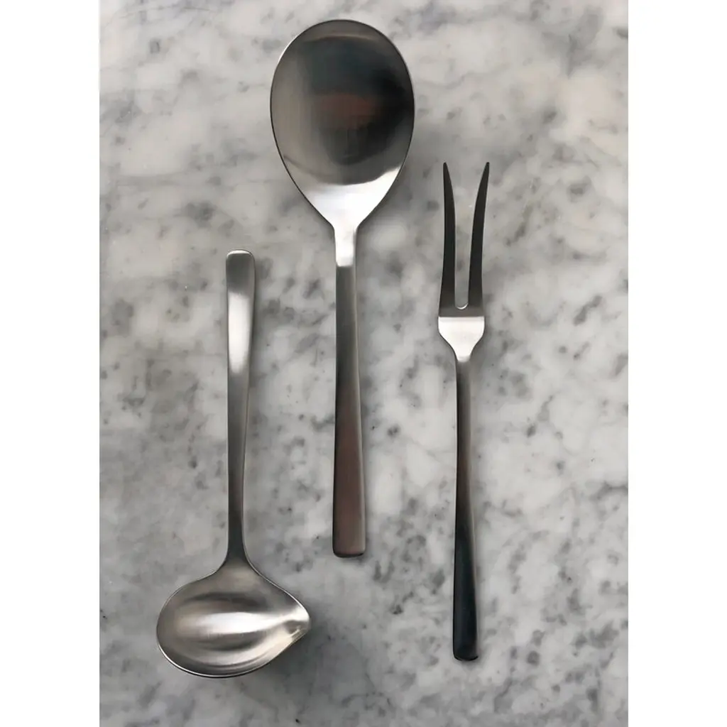 Kay Bojesen’s Grand Prix serving set brings together elegance and functionality, making it the ideal choice for serving steaks, side dishes as well as sauces to complement your meals. Crafted from polished stainless steel, the set includes three serving utensils: a meat fork, a serving spoon, and a small sauce spoon with a drip-free spout. The Grand Prix cutlery collection is among the most renowned works of the iconic Danish designer Kay Bojesen. In the 1930s, Bojesen set out to create a versatile cutlery series suitable for hands of all sizes, perfect for both everyday use and special occasions, with the aim that these pieces could be passed down through generations as cherished heirlooms. At the 1951 Milan Triennial, his silver cutlery was awarded the first prize – the Grand Prix – and ever since, the collection has been known by this name. After the win, the cutlery was introduced in a matte steel version, and in 2011, the series was expanded with polished steel utensils.