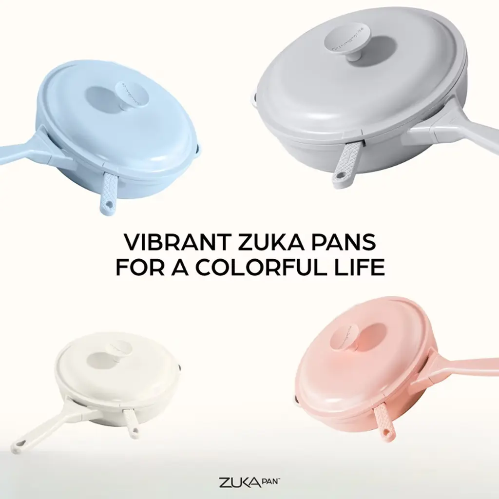 Introducing the Granitestone Zuka 10" Aluminum Cast Everyday Pan Set, available in five stylish colors—Red, Black, Cream, Grey, and Blue—to complement any kitchen. This 10-in-1 multifunctional pan is designed to replace multiple pieces of cookware, handling everything from searing, baking, roasting, slow cooking, deep frying, braising, steaming, boiling, sautéing, and serving—all in one. The set includes a 10-inch aluminum cast pan with a Fusion Pro nonstick interior, lid, nylon spoon, silicone trivet, silicone handle cover, and a foldable steamer basket with handle. Oven safe up to 500°F and compatible with electric, ceramic, halogen, gas, and induction stovetops. Made without PTFE, PFOA, and PFOS for healthier cooking. Features include cool-touch silicone handles, a built-in spatula rest, a pour spout, and dishwasher-safe components for effortless cleanup.