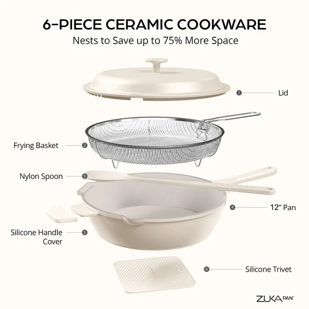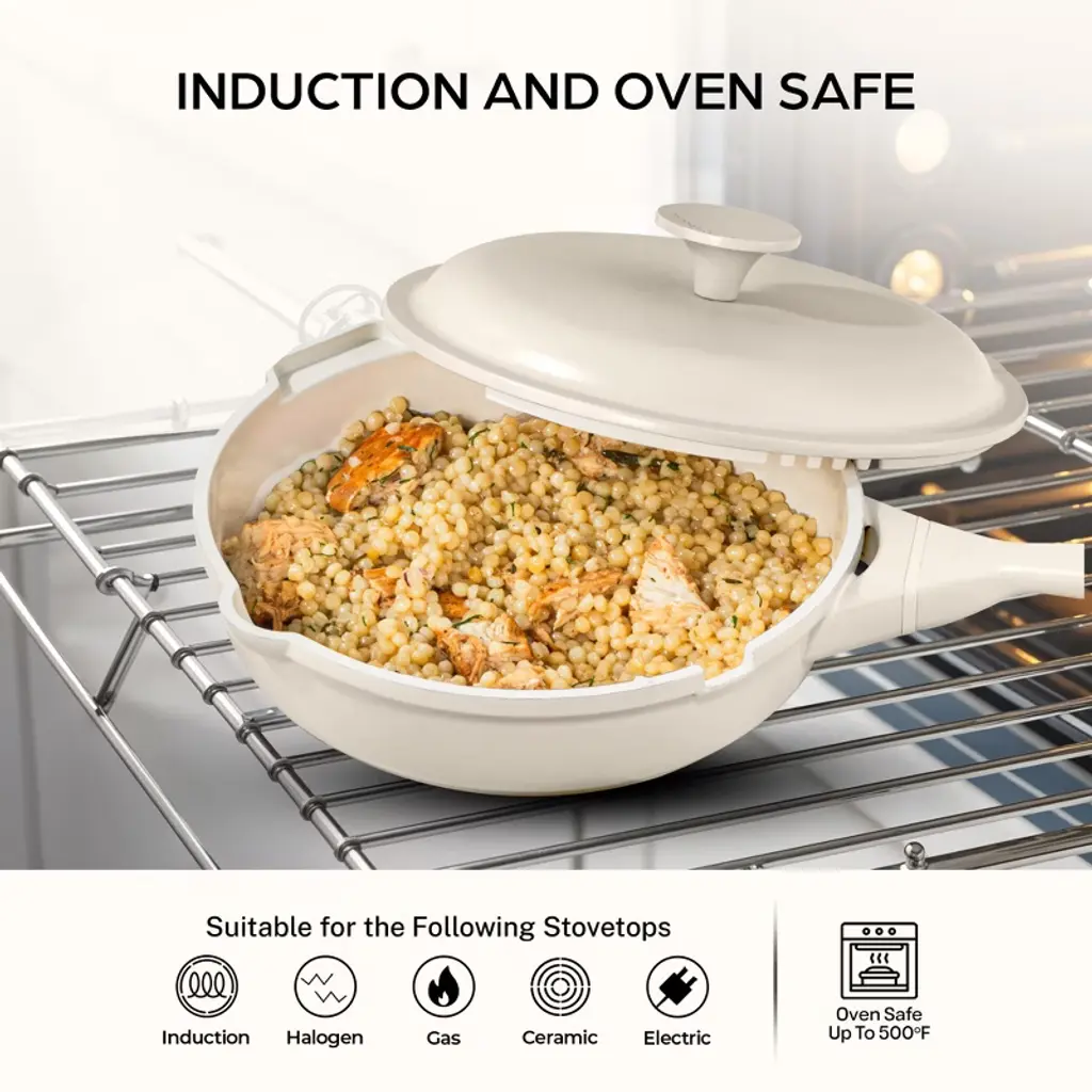 Granitestone Zuka Everyday Pan 12" Cream Nonstick Multi-functional Saute Pan With Lid, Nylon Spoon And Steamer Basket