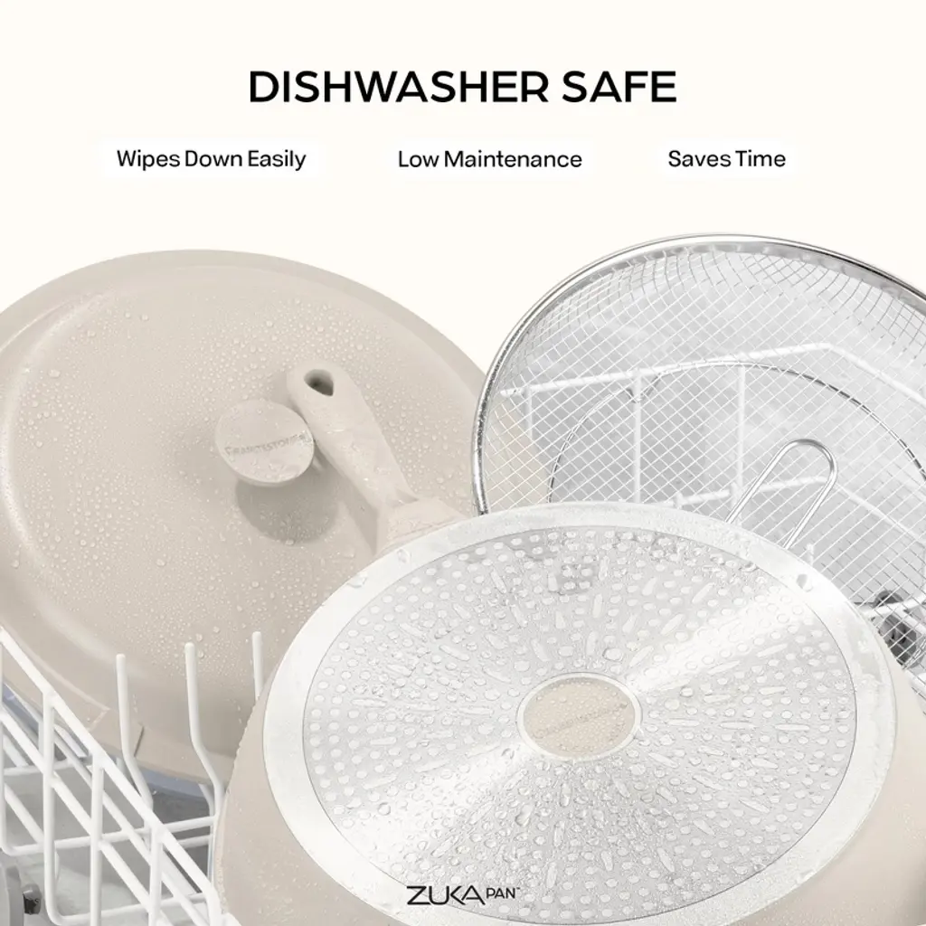 Introducing the Granitestone Zuka 12" Aluminum Cast Everyday Pan Set, available in four stylish colors—Red, Black, Cream, and Grey—to complement any kitchen. This 10-in-1 multifunctional pan is designed to replace multiple pieces of cookware, handling everything from searing, baking, roasting, slow cooking, deep frying, braising, steaming, boiling, sautéing, and serving—all in one. The set includes a 12-inch aluminum cast pan with a Fusion Pro nonstick interior, lid, nylon spoon, silicone trivet, silicone handle cover, and a foldable steamer basket with handle. Oven safe up to 500°F and compatible with electric, ceramic, halogen, gas, and induction stovetops. Made without PTFE, PFOA, and PFOS for healthier cooking. Features include cool-touch silicone handles, a built-in spatula rest, a pour spout, and dishwasher-safe components for effortless cleanup.