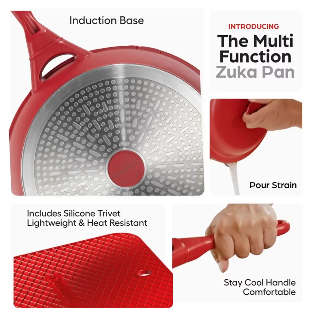 Granitestone Zuka Everyday Pan 8" Red Nonstick Multi-functional Saute Pan With Lid And Nylon Spoon