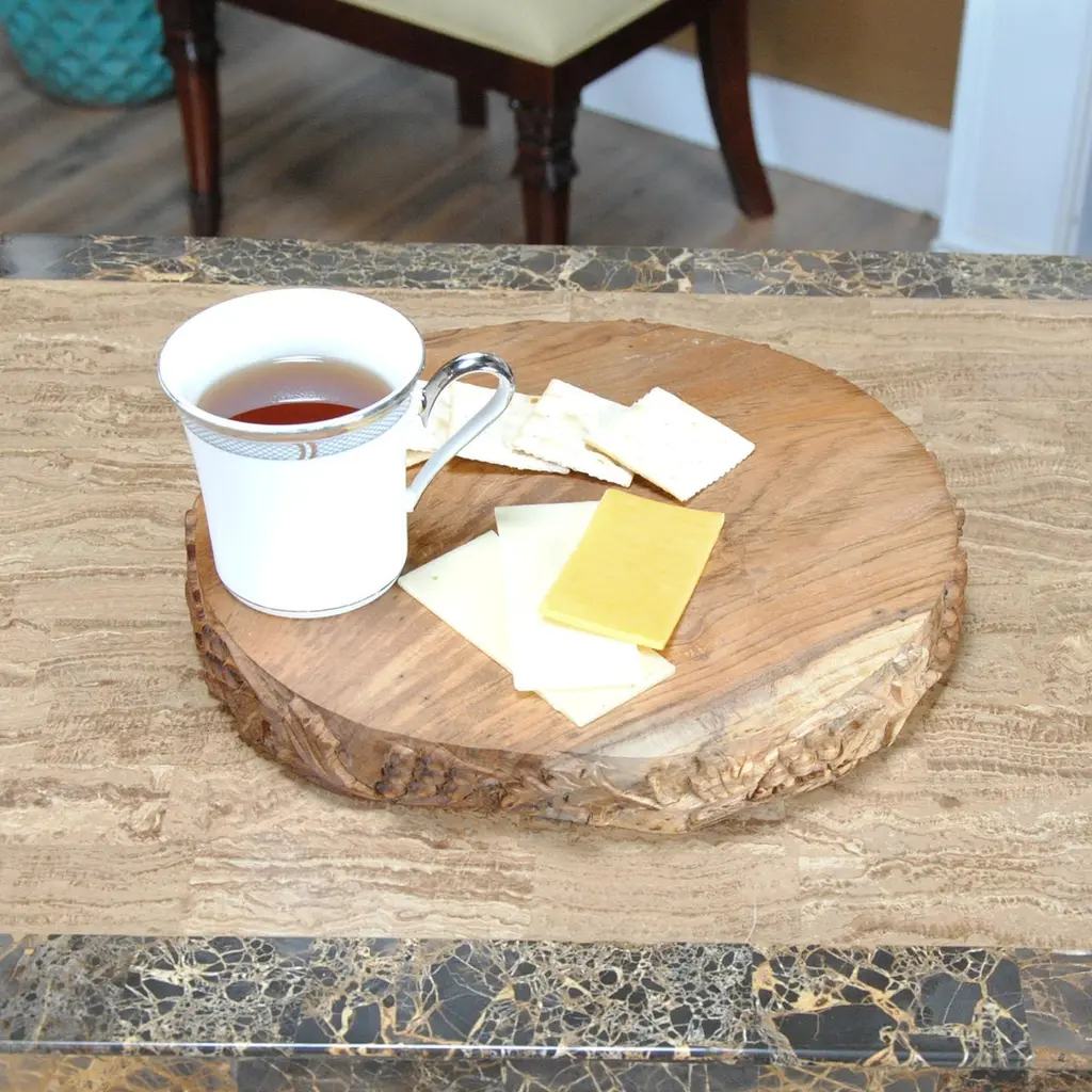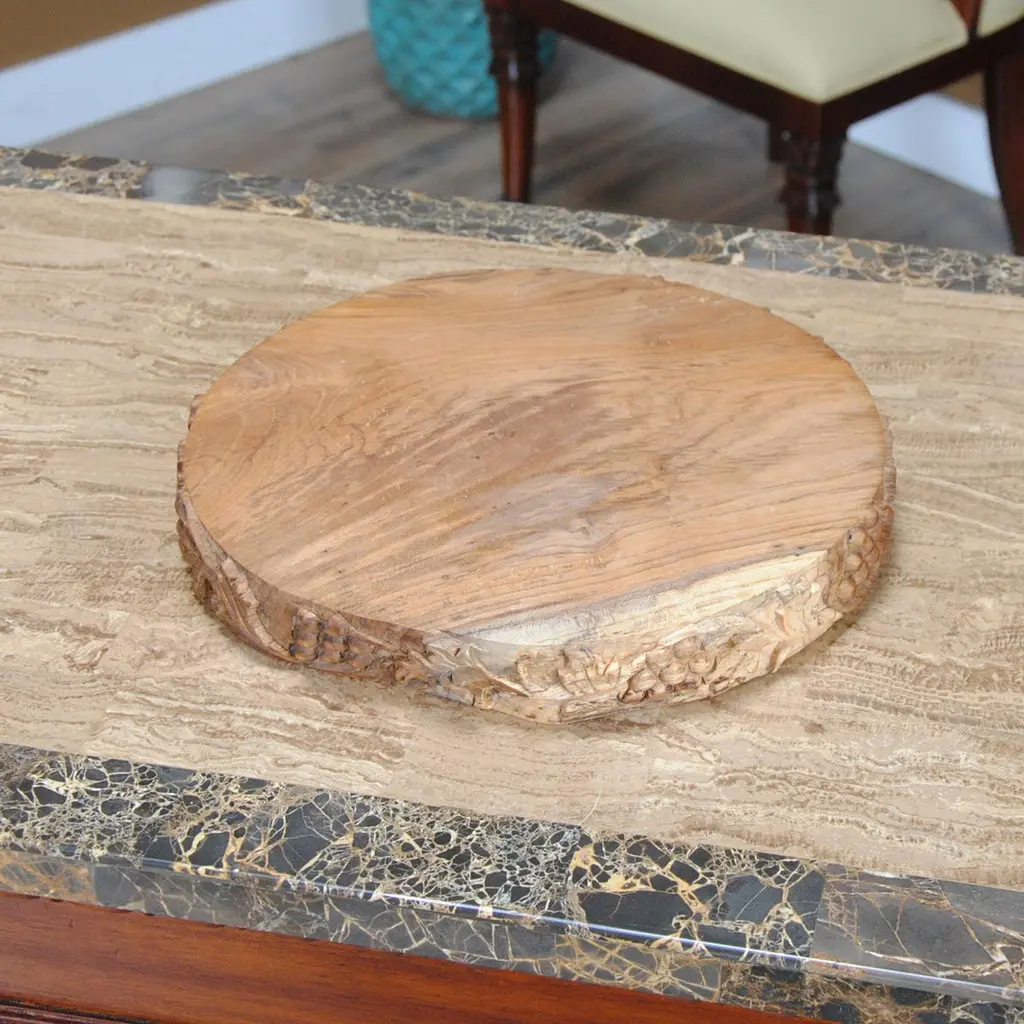 From Niagara Furniture, this Grape Carved Teak Serving Platter is produced from solid teak wood. Decorative and beautiful hand carved grape motif accentuates the amazing Teak wood, ideal for serving up some crackers and cheese with your favorite wine.Using teak wood in a cutting / serving board provides a very resilient surface while protecting knives from damage. The Grape Carved Teak Serving Platter is finished with food grade mineral oil, a colorless and odorless liquid suitable for items which encounter food. Premium quality Teak is a close-grained hardwood that is known for being one of the hardest, strongest, and most durable of all woods. Beautifully crafted, smooth to the touch and very solid. Suitable for us with non-stick cookware.Teak wood is hardy but will last longer with a little bit of special care. We suggest that you hand-wash your item with only mild soap and water and dry right away with a soft cloth. If you avoid air-drying teak items or putting them into either the refrigerator or dishwasher they will look better longer.Sizes may vary slightly as each item is handmadeGrape Carved Teak Serving Platter 13w x 12d x 1.5h