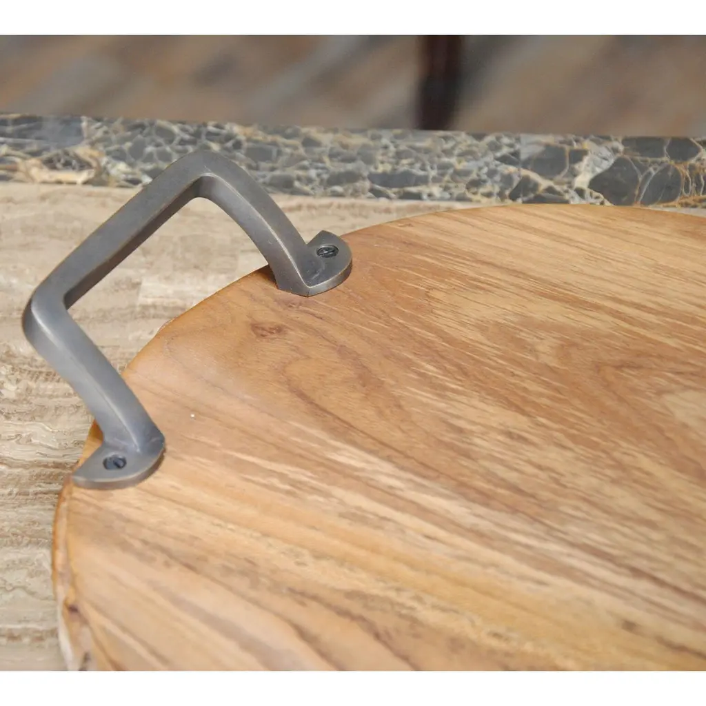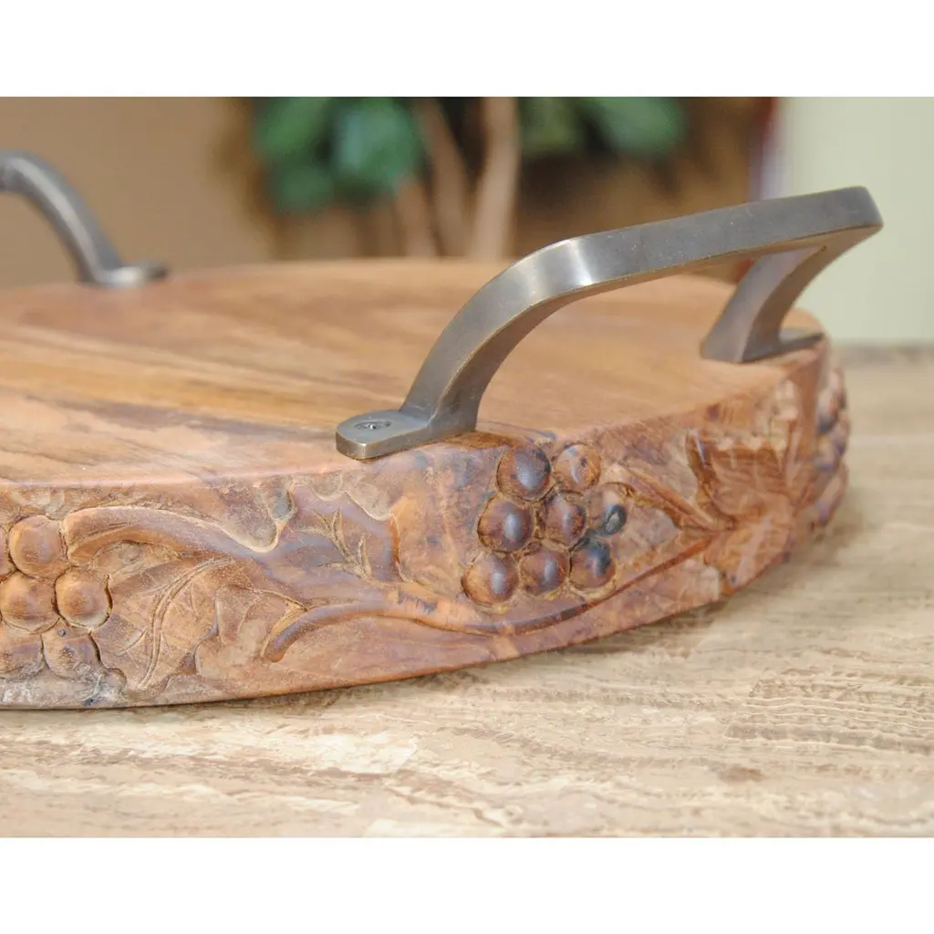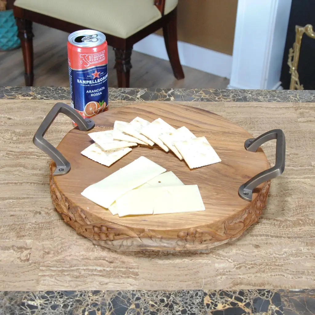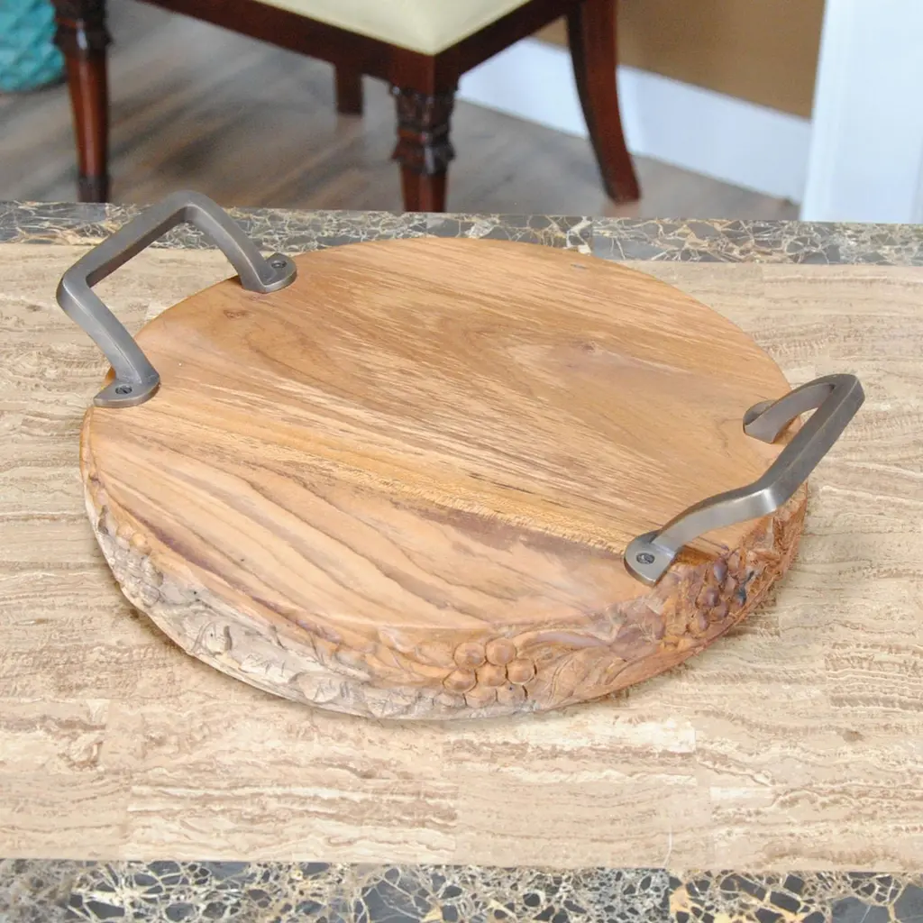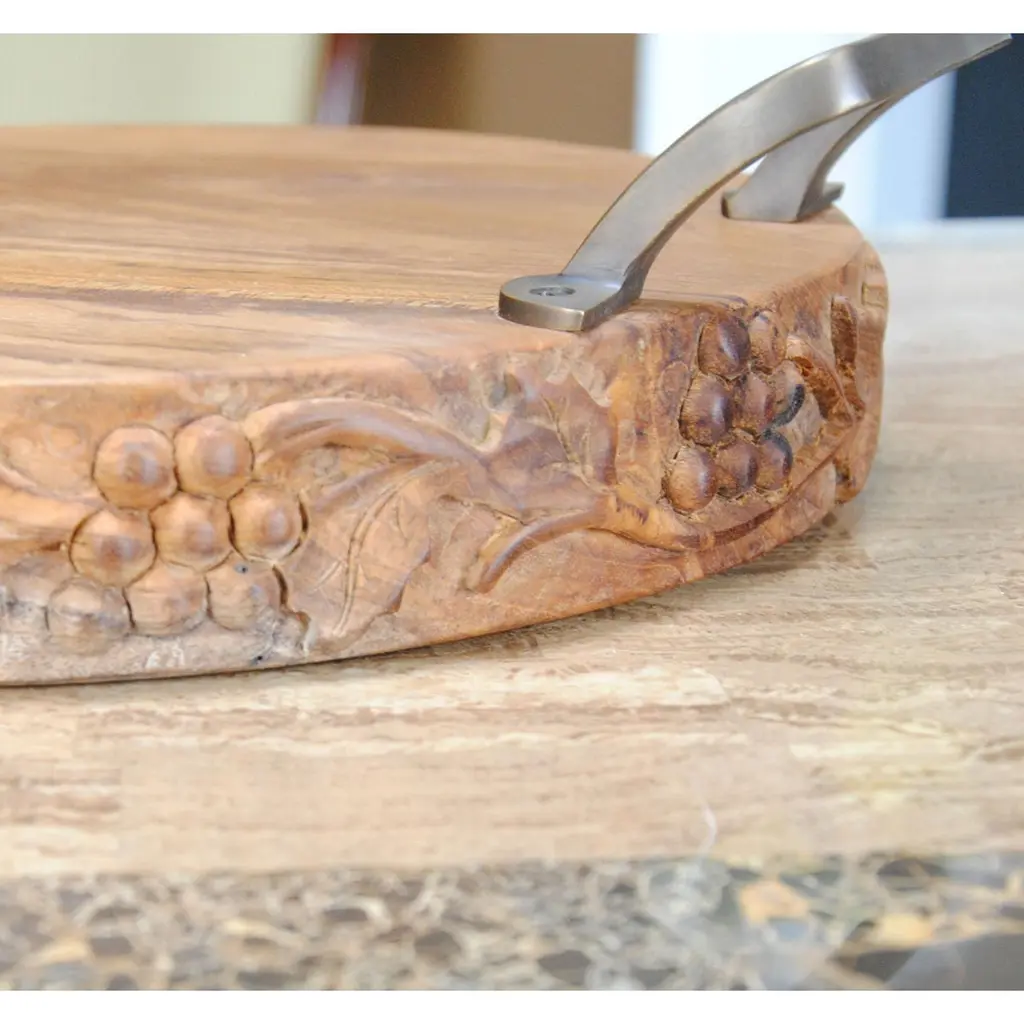 From Niagara Furniture, this Grape Carved Teak Serving Platter with Handles is produced from solid teak wood and solid brass. Decorative and beautiful hand carved grape motif accentuates the amazing Teak wood, ideal for serving up some crackers and cheese with your favorite wine.Using teak wood in a cutting / serving board provides a very resilient surface while protecting knives from damage. The Grape Carved Teak Serving Platter with Handles is finished with food grade mineral oil, a colorless and odorless liquid suitable for items which encounter food. Premium quality Teak is a close-grained hardwood that is known for being one of the hardest, strongest, and most durable of all woods. Beautifully crafted, smooth to the touch and very solid. Suitable for us with non-stick cookware.Teak wood is hardy but will last longer with a little bit of special care. We suggest that you hand-wash your item with only mild soap and water and dry right away with a soft cloth. If you avoid air-drying teak items or putting them into either the refrigerator or dishwasher they will look better longer.Sizes may vary slightly as each item is handmadeGrape Carved Teak Serving Platter 13w x 12d x 3h