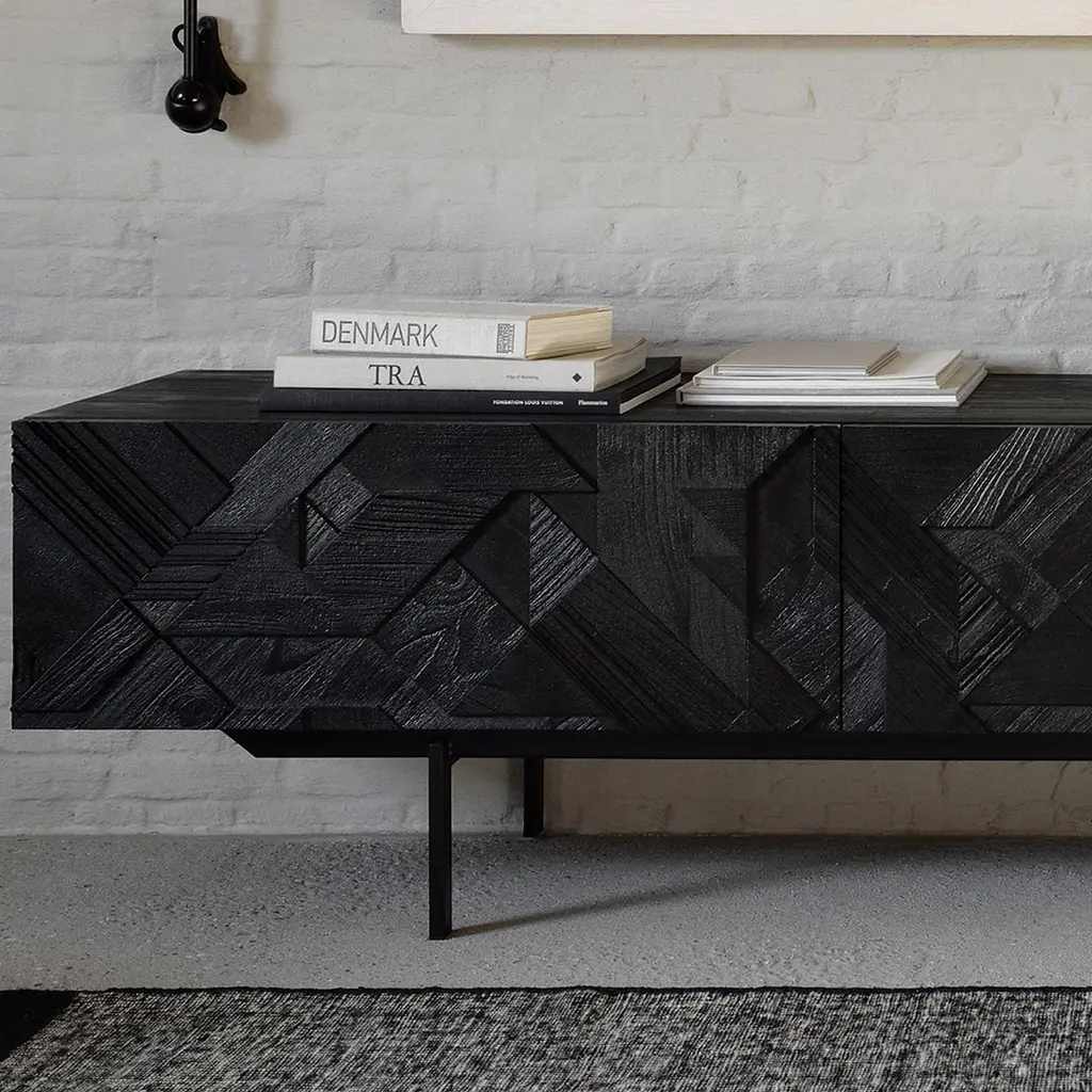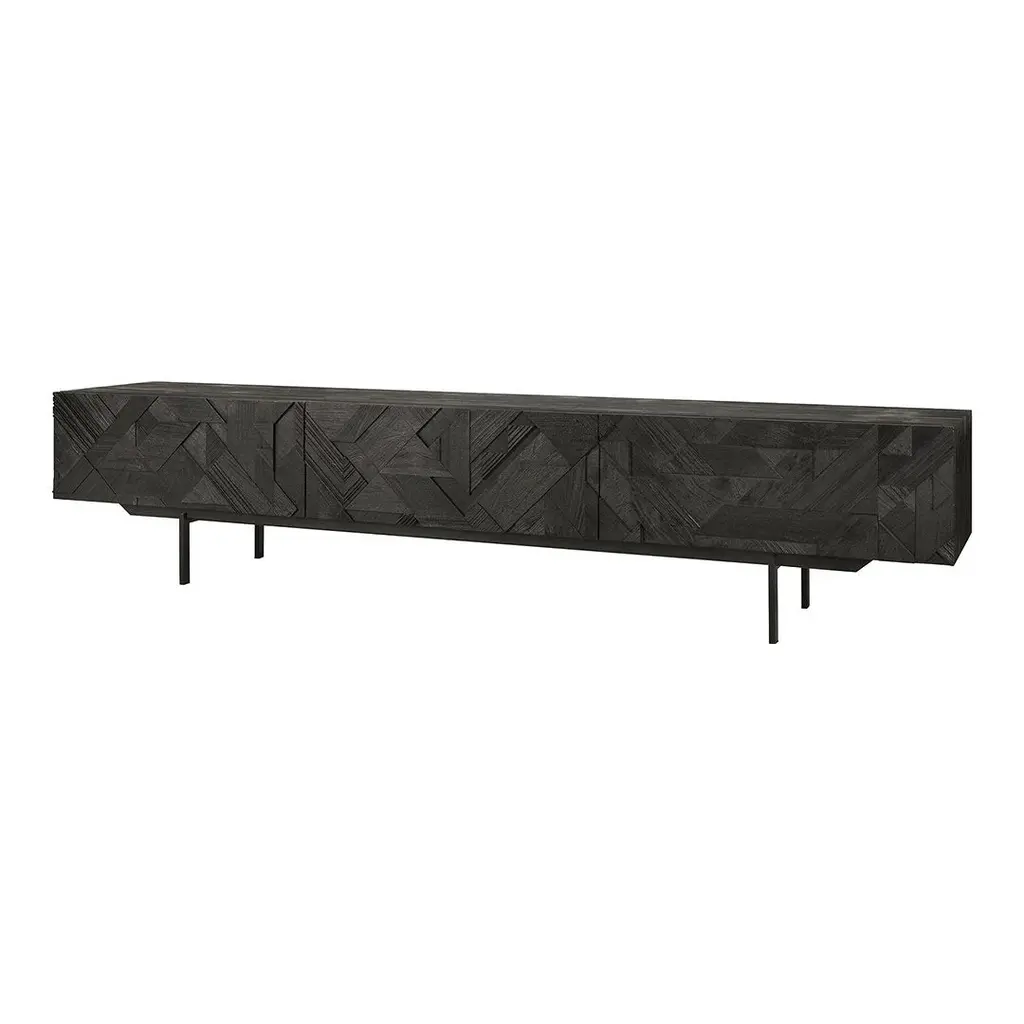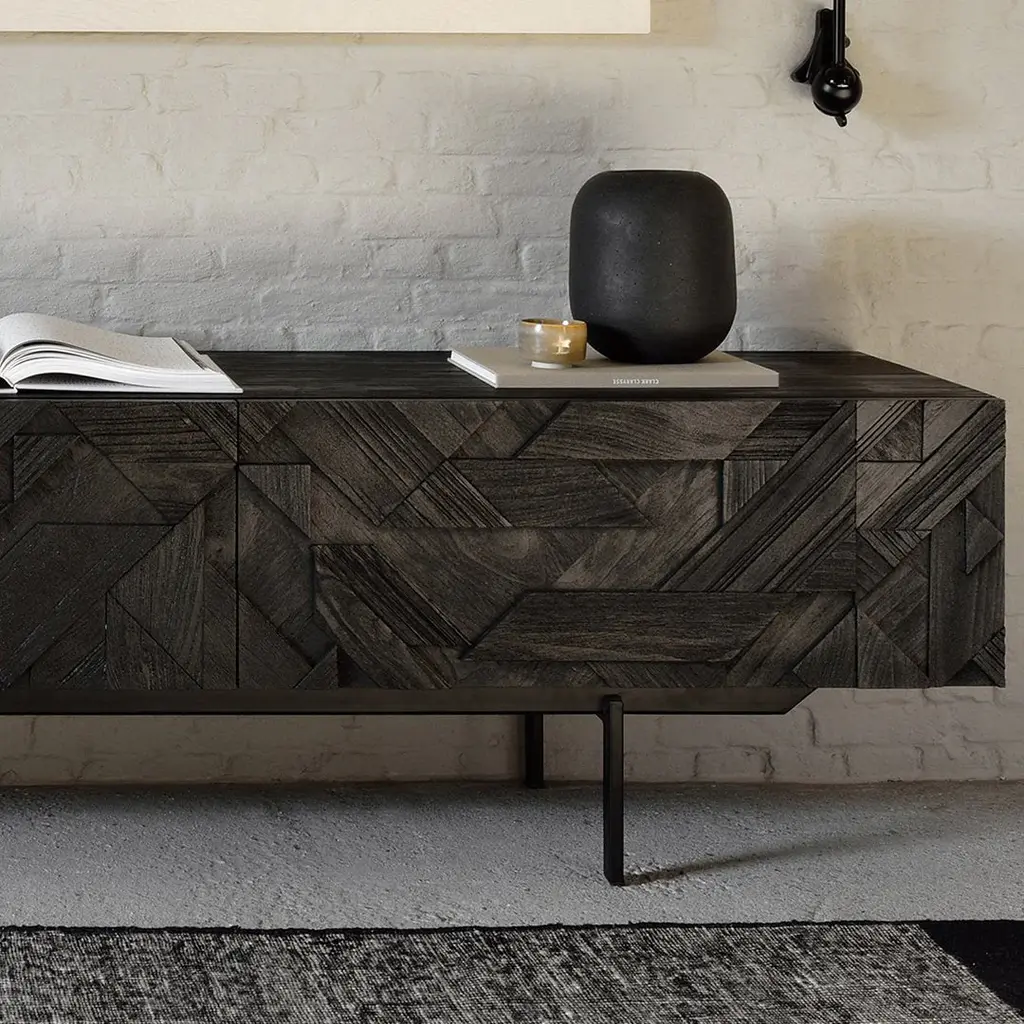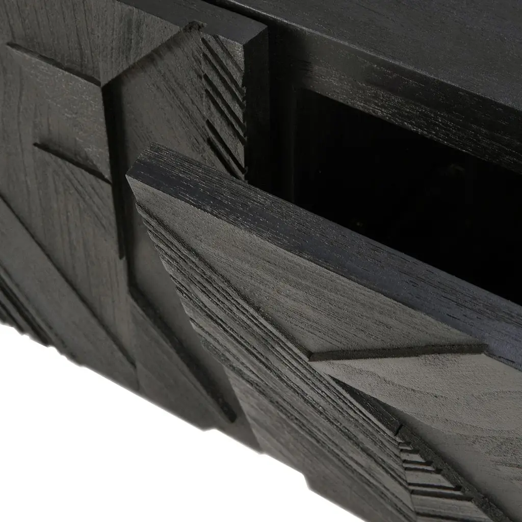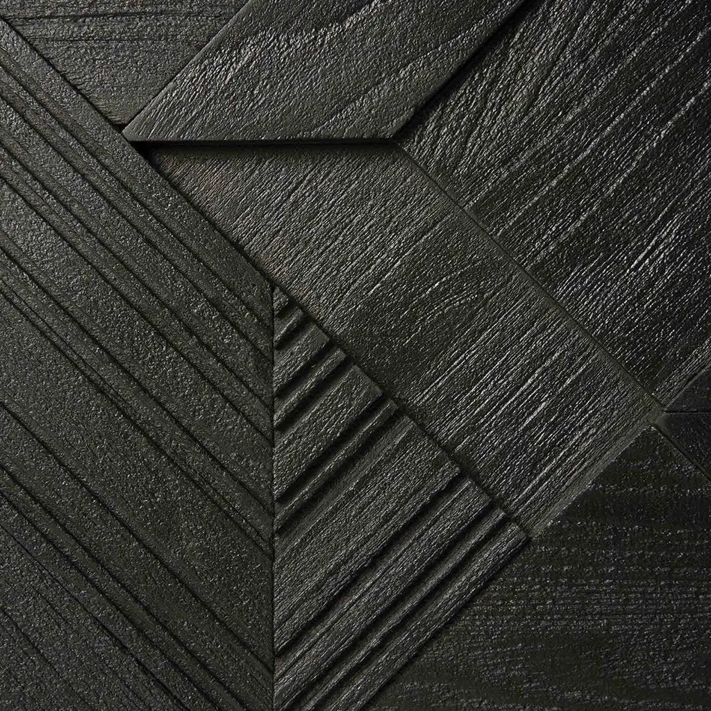In his quest to add movement to the surface, our designer Alain van Havre started layering and combining triangular shapes. Before he knew it, he had created an interesting composition out of teak. We ended up brushing the surface to highlight the grain and further emphasize the feeling of motion. Originally used for our popular Teak Graphic sideboard, the pattern now translates perfectly to a new TV cupboard.